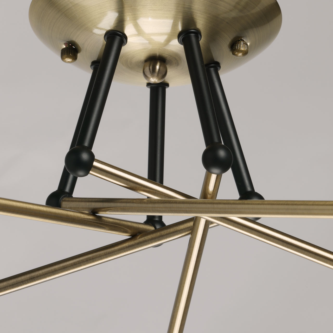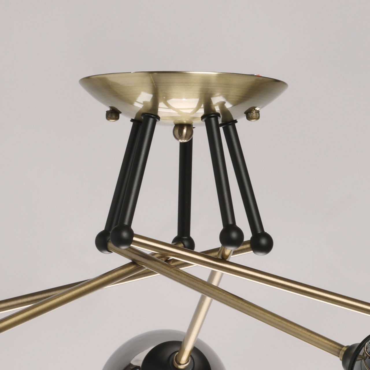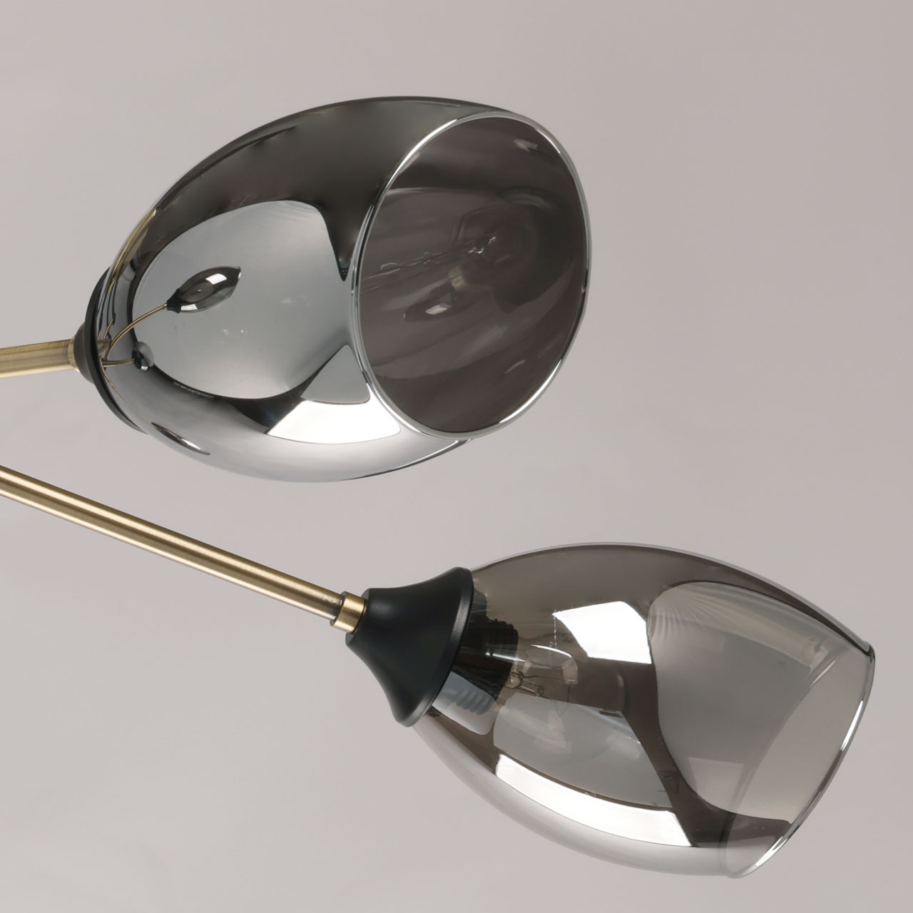 Металлическое основание потолочной люстры гальванизировано в цвет античной бронзы. Отдельные элементы основания окрашены в черный цвет. Традиционные источники света закрыты стеклянными плафонами, гальванизированными в дымчатый цвет.