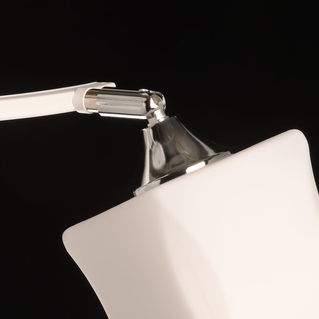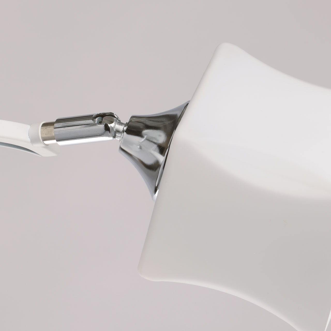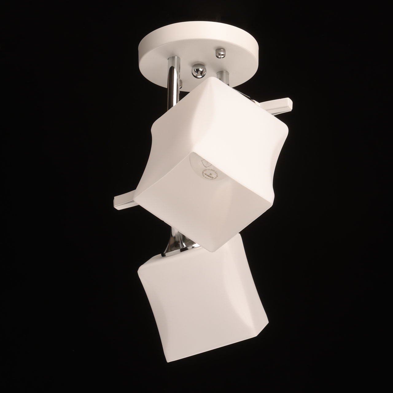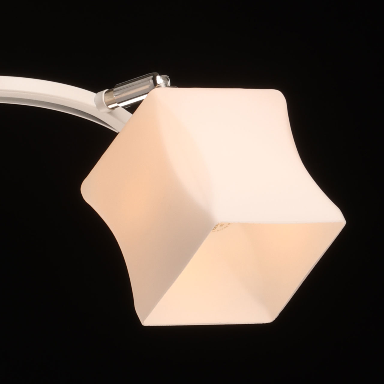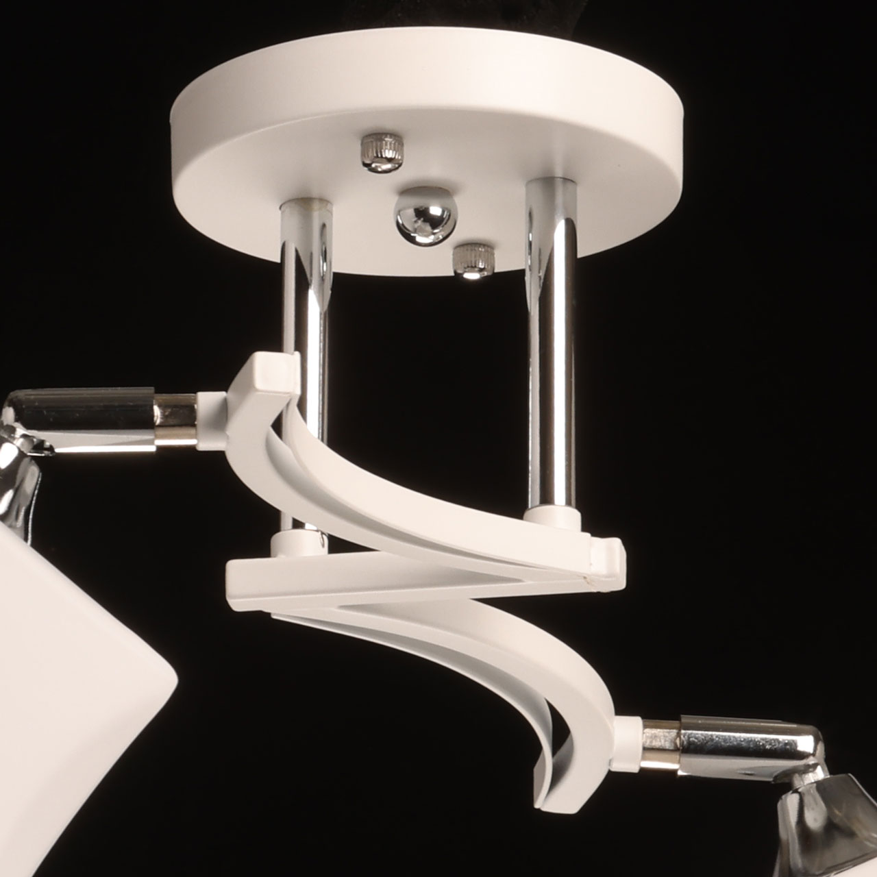 Металлическое основание потолочной люстры окрашено в белый цвет. Отдельные элементы основания гальванизированы в цвет хрома. Стеклянные плафоны отлиты в оригинальную форму и окрашены в белый цвет с внутренней стороны.