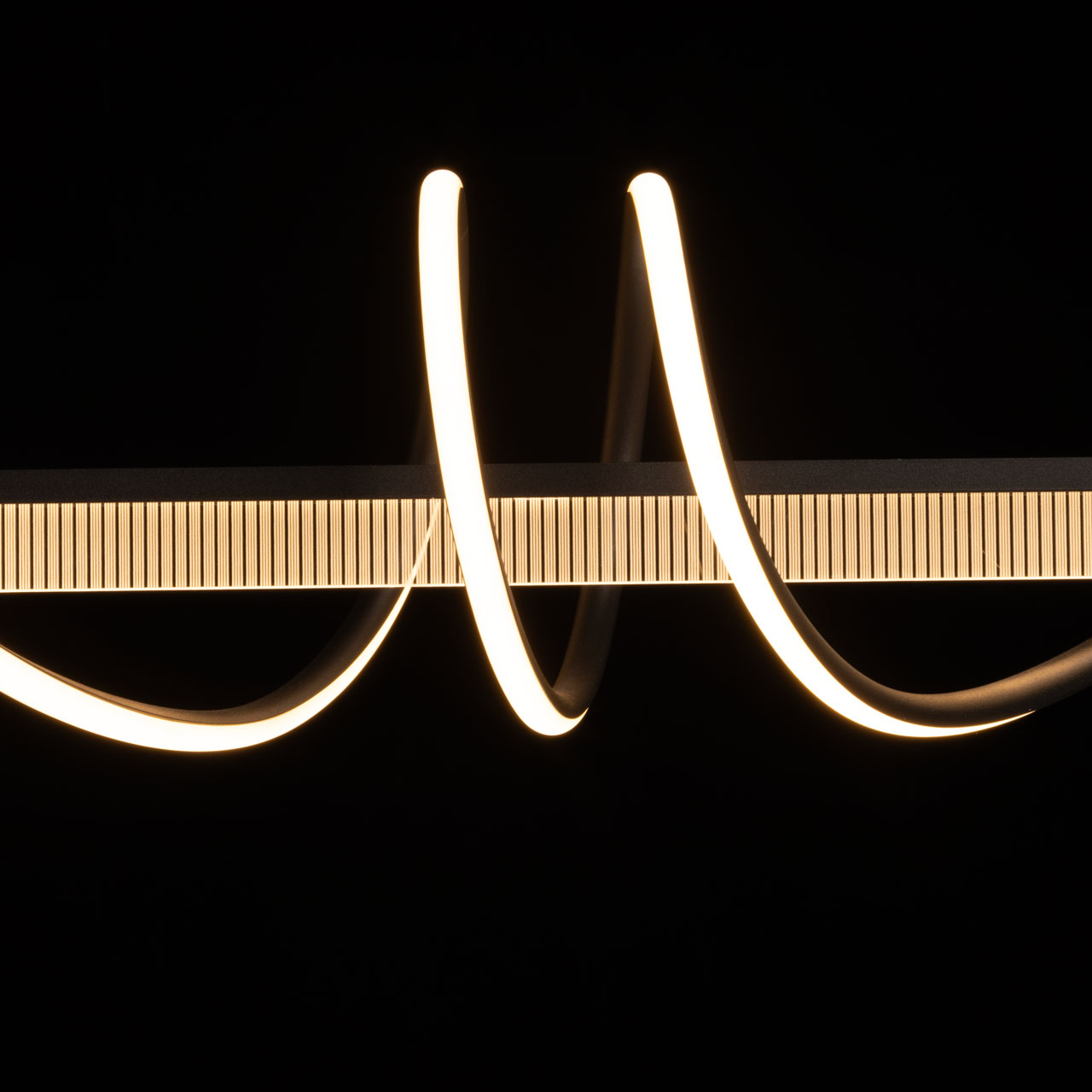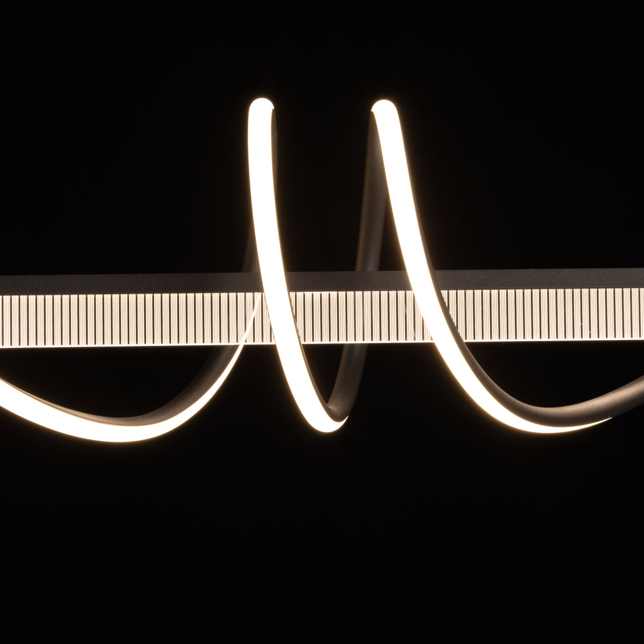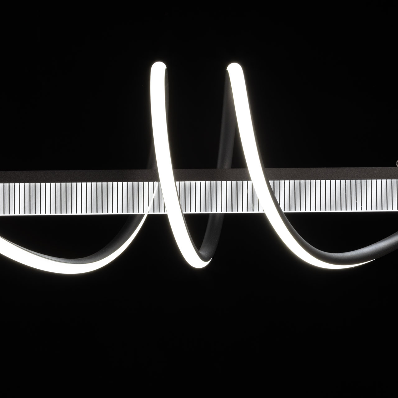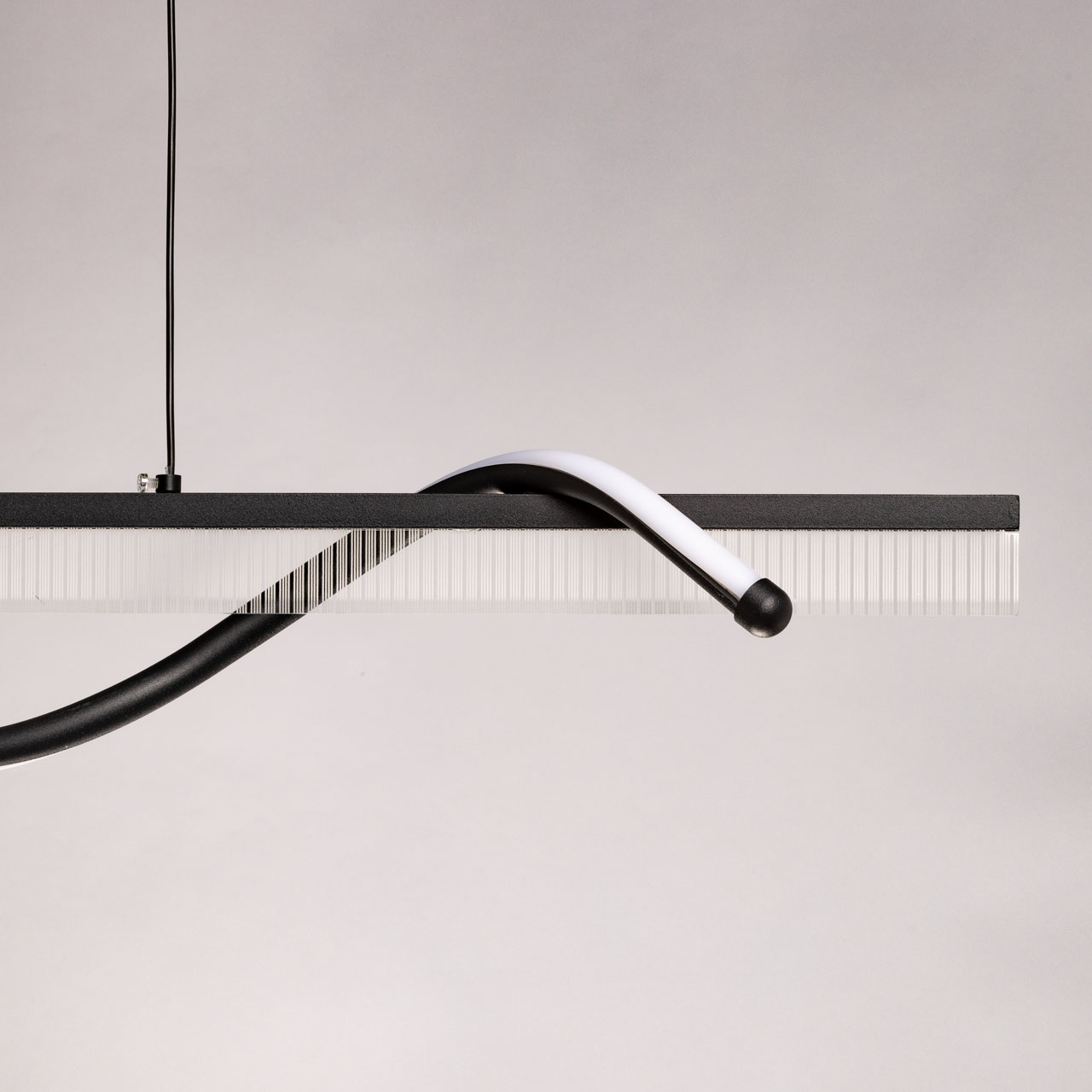 Металлическое основание светильника окрашено в черный цвет. Светодиодные источники света закрыты белым матовым акрилом. В комплекте с люстрой идет пульт управления, позволяющий регулировать температуру света и уровень яркости.