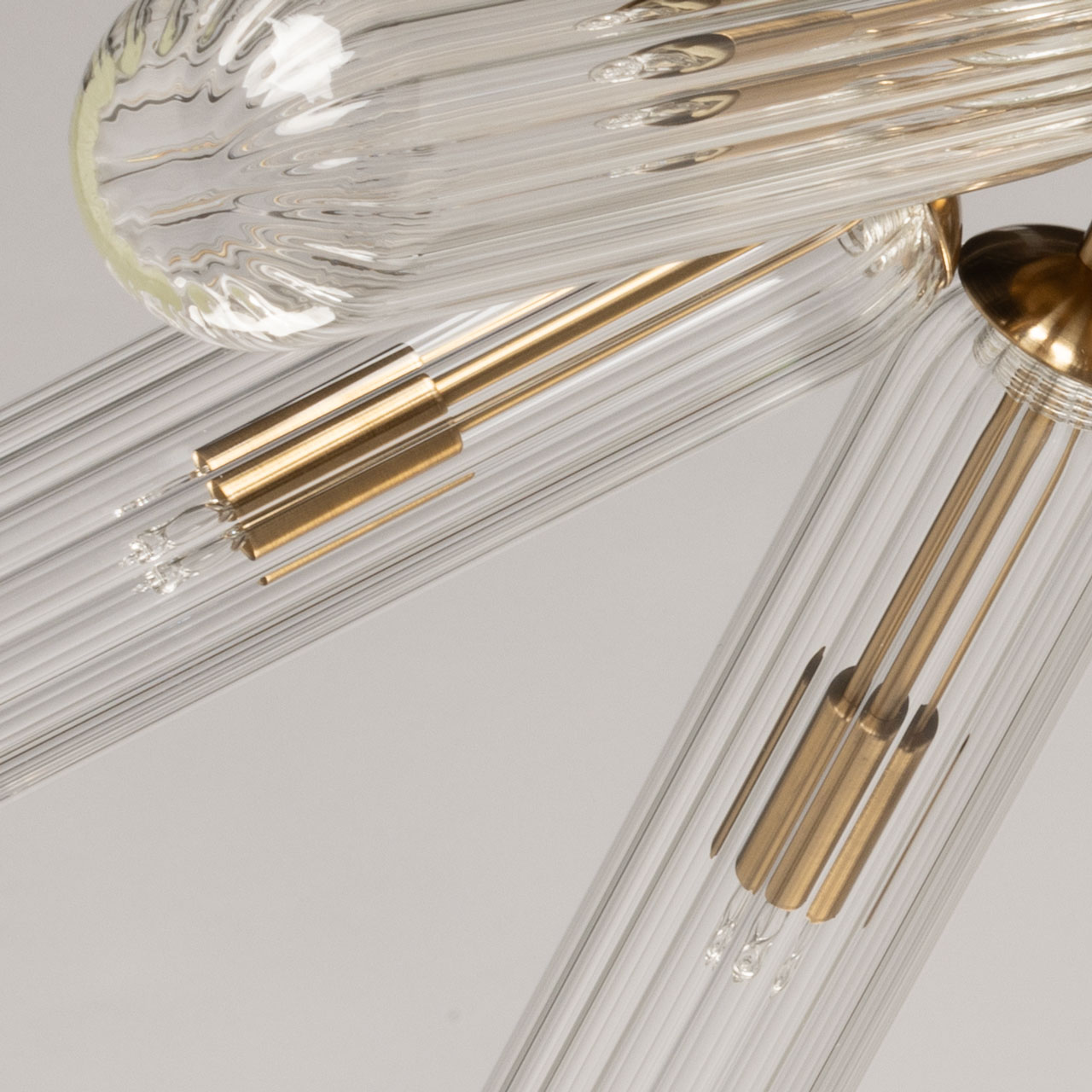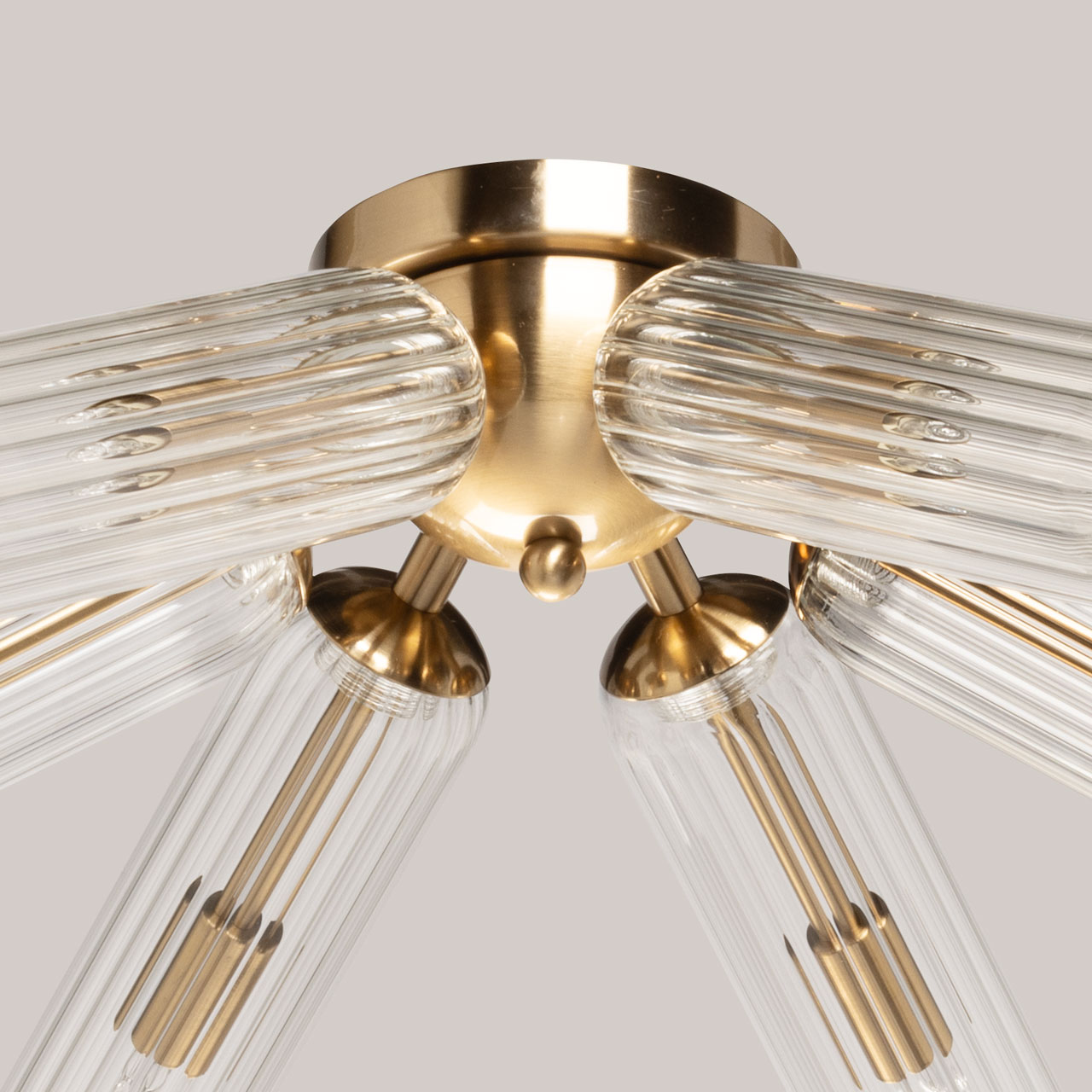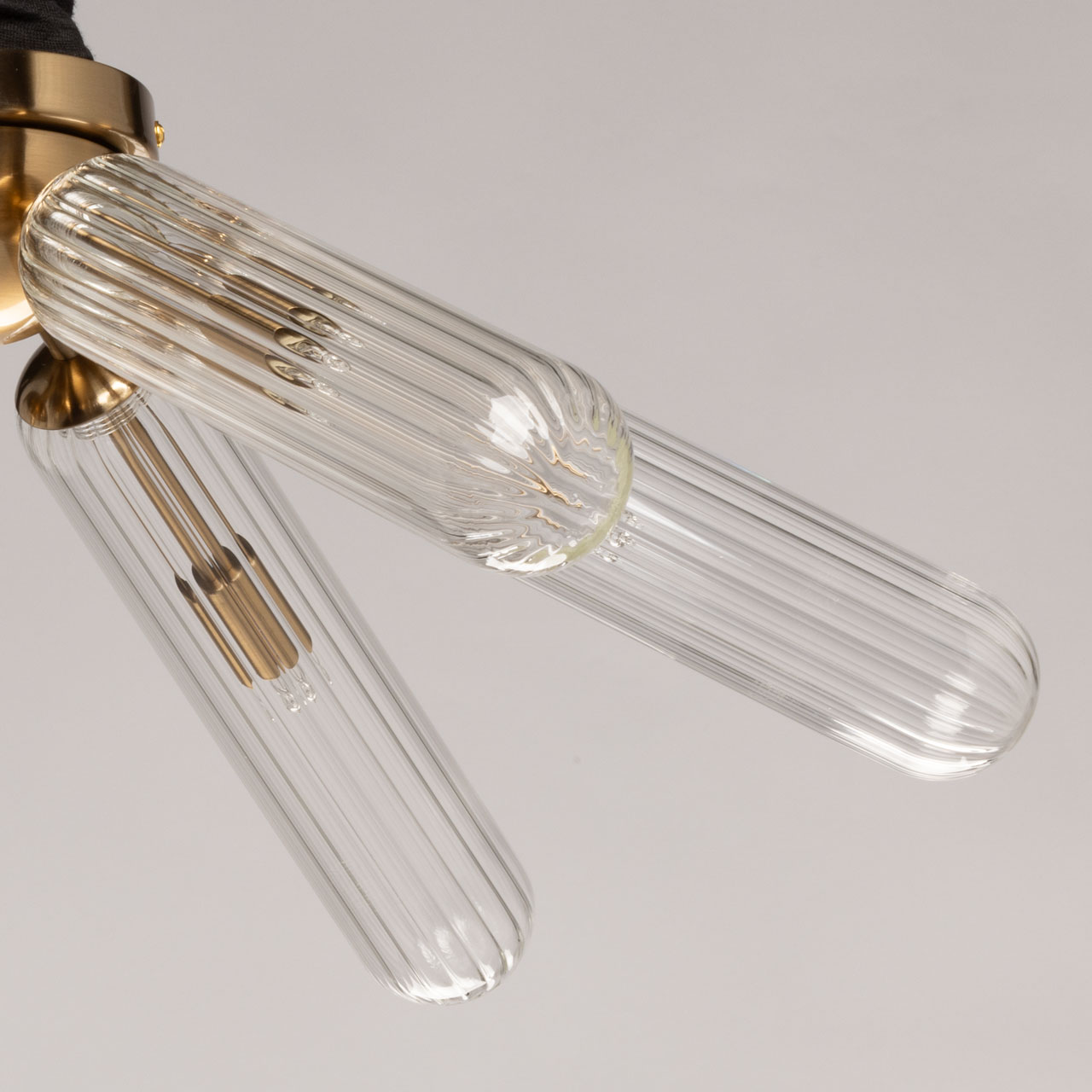 Металлическое основание гальванизировано в цвет медовой бронзы. Рельефные стеклянные плафоны с линейной текстурой отлиты в сложную форму.