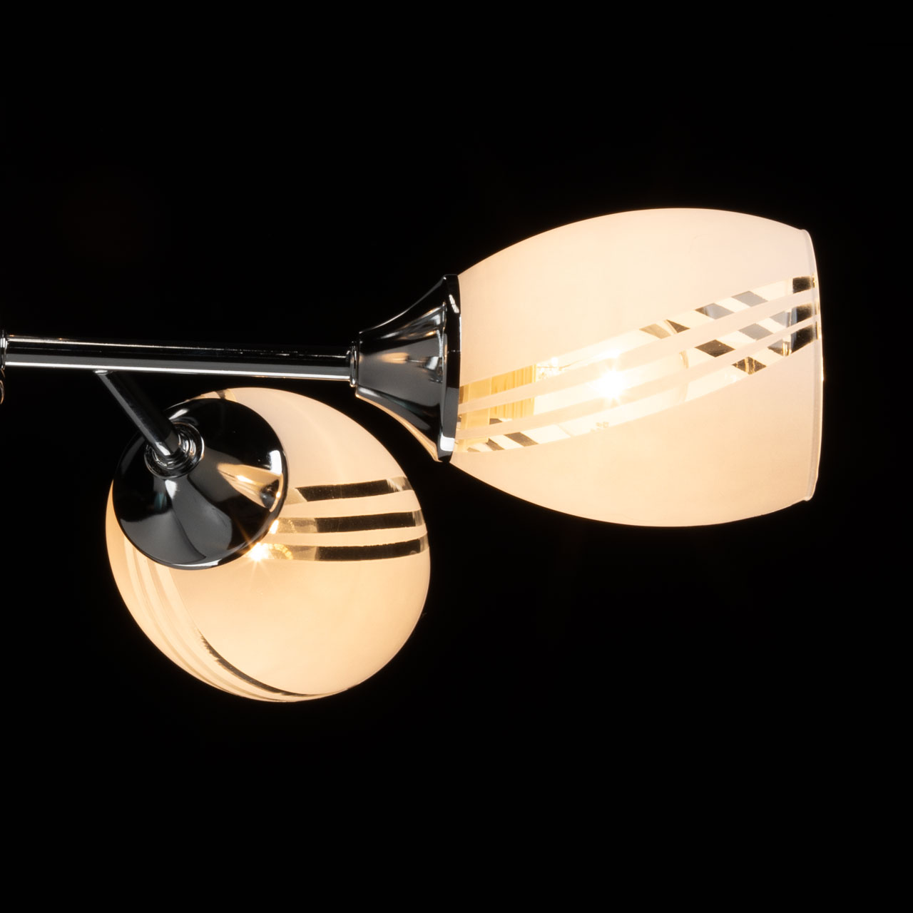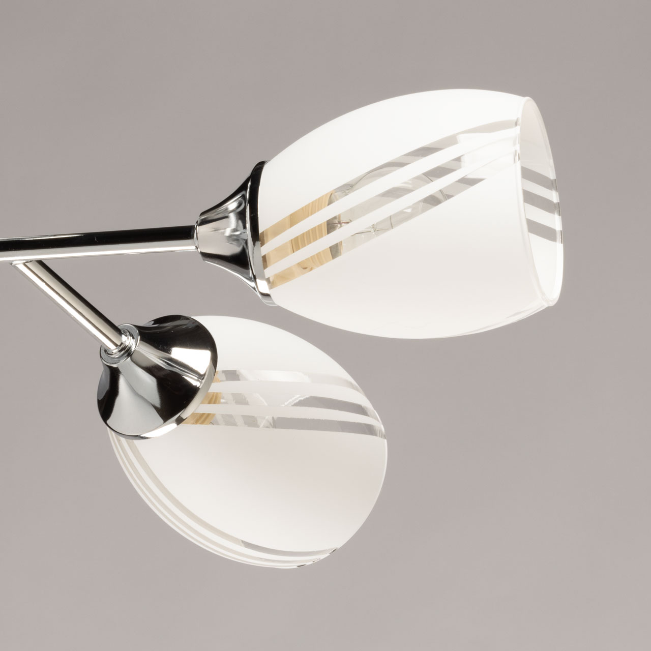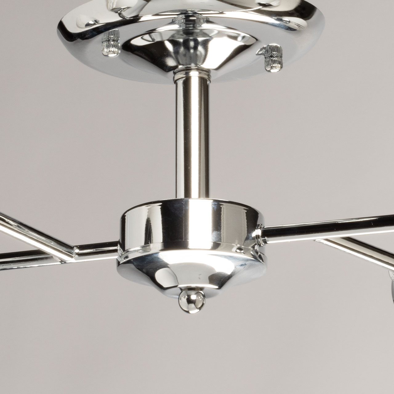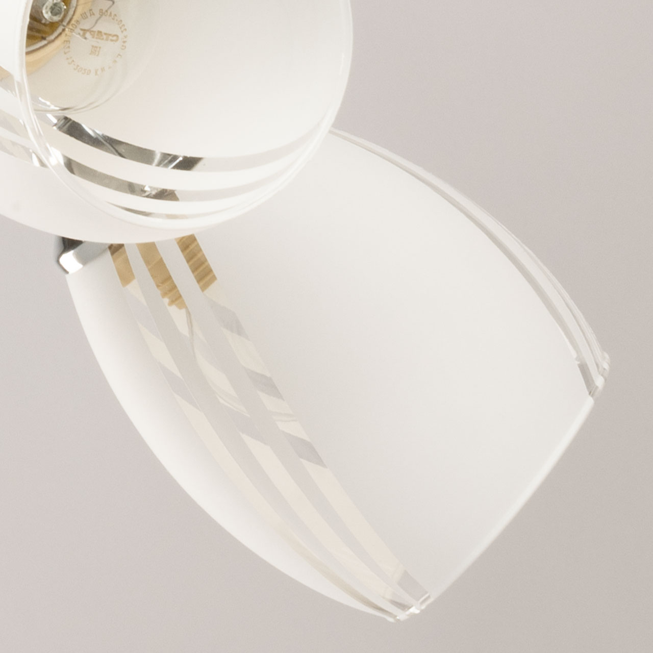 Металлическое основание потолочной люстры гальванизировано в цвет хрома. Стеклянные плафоны сверху окрашены в белый цвет.