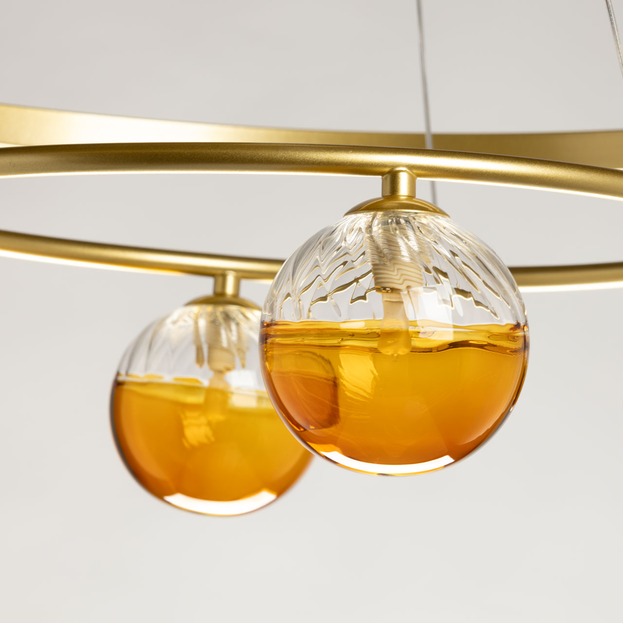 Металлическое основание подвесной люстры гальванизировано в цвет золота. Корпус плафона выполнен из сплава алюминия и окрашен в цвет перламутрового золота. Светодиодный источник света закрыт прозрачным акрилом. Декоративные плафоны с традиционными источниками света G9 выдуваются вручную в форму и окрашены наполовину в цвет янтаря.