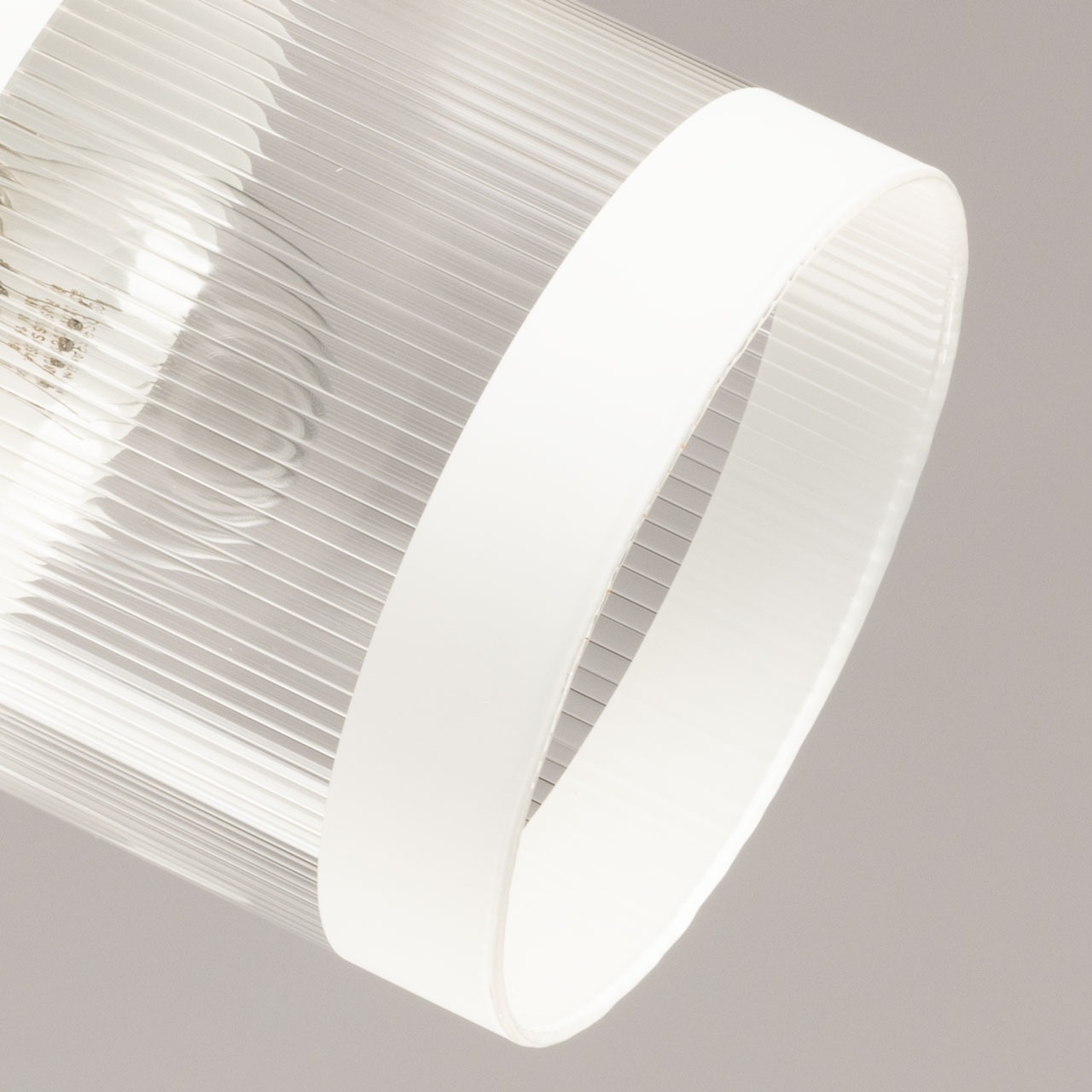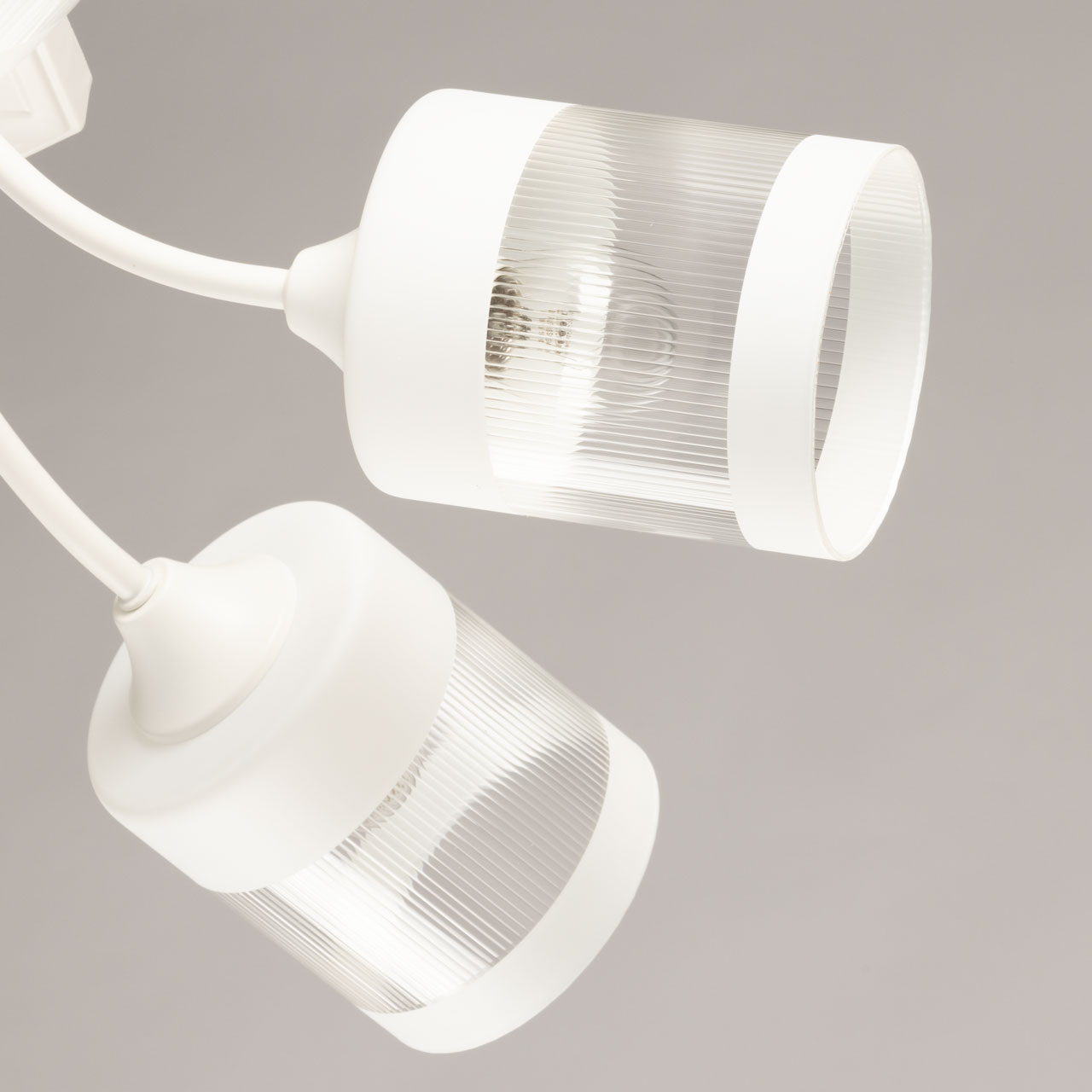 Металлическое основание потолочной люстры окрашено в белый цвет. Фактурные стеклянные плафоны по краям окрашены в белый цвет.