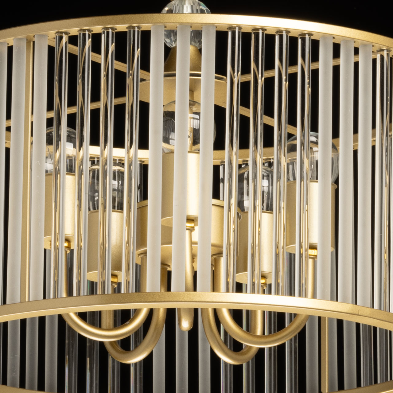 Металлическое основание подвесной люстры окрашено в цвет перламутрового золота. Плафон декорирован стеклянными трубочками прозрачными и матовыми. Центральная ось люстры декорирована массивом из прозрачного хзрусталя.