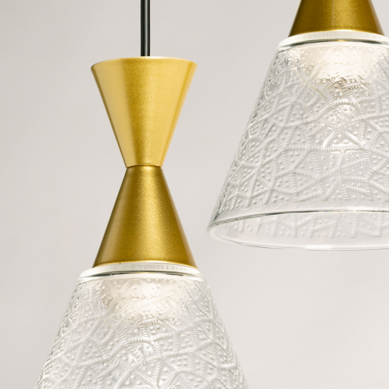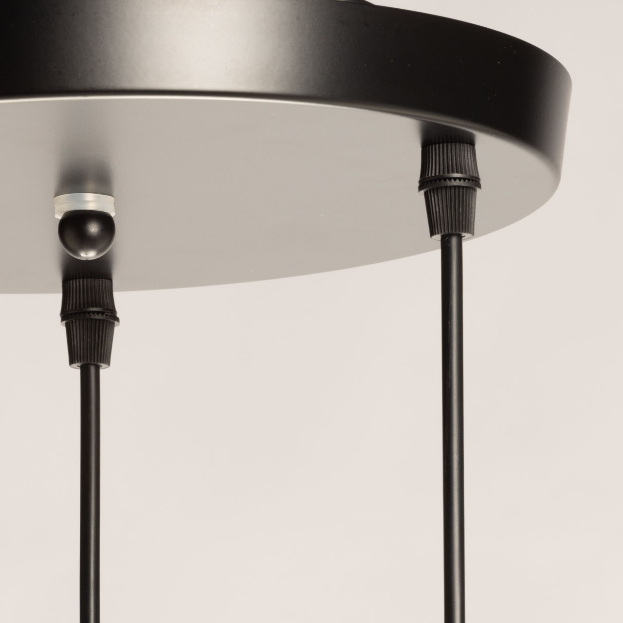 Металлическое основание подвесной люстры окрашено в черный цвет. Отдельные элементы основания и декора окрашены в цвет перламутрового золота. Светильник декорирован матовыми фактурными плафонами с имитацией кожи рептилий.