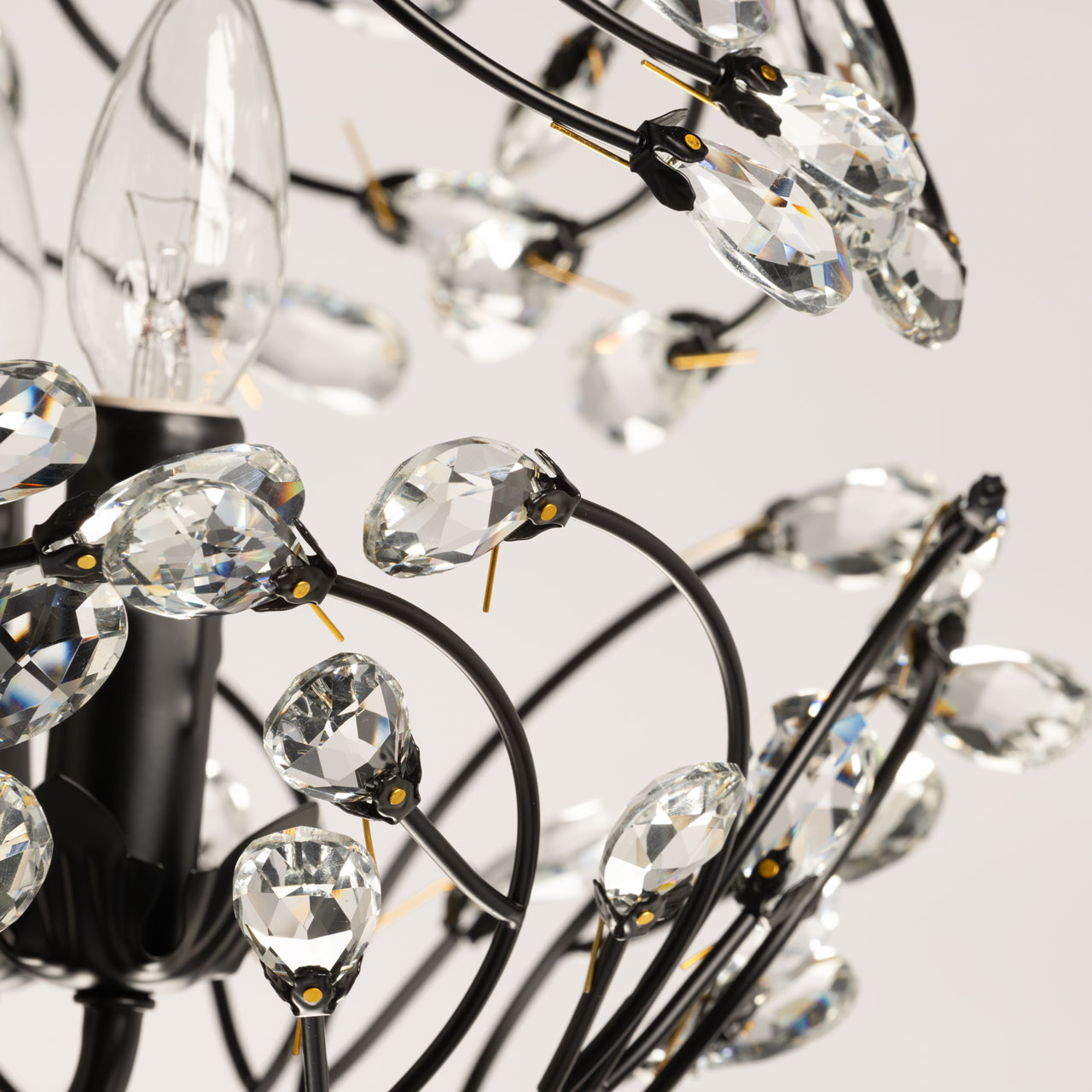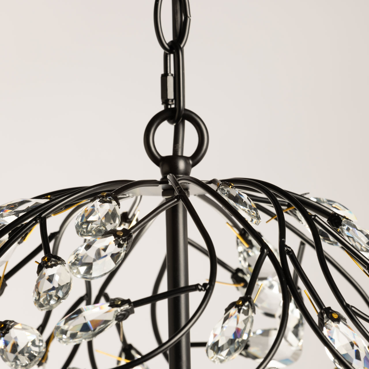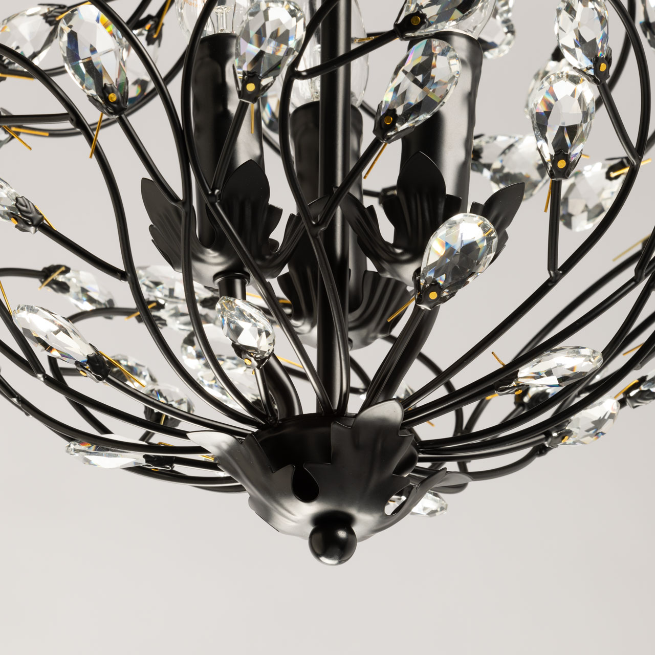 Металлическое основание подвесной люстры окрашено в черный цвет. Люстра декорирована прозрачным хрусталем формы миндаля. Крепления хрусталя гальванизированы в цвет золота.