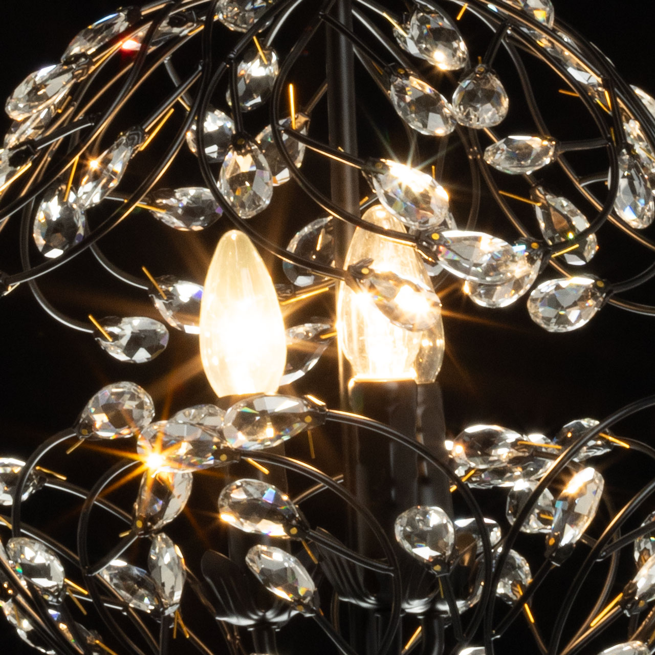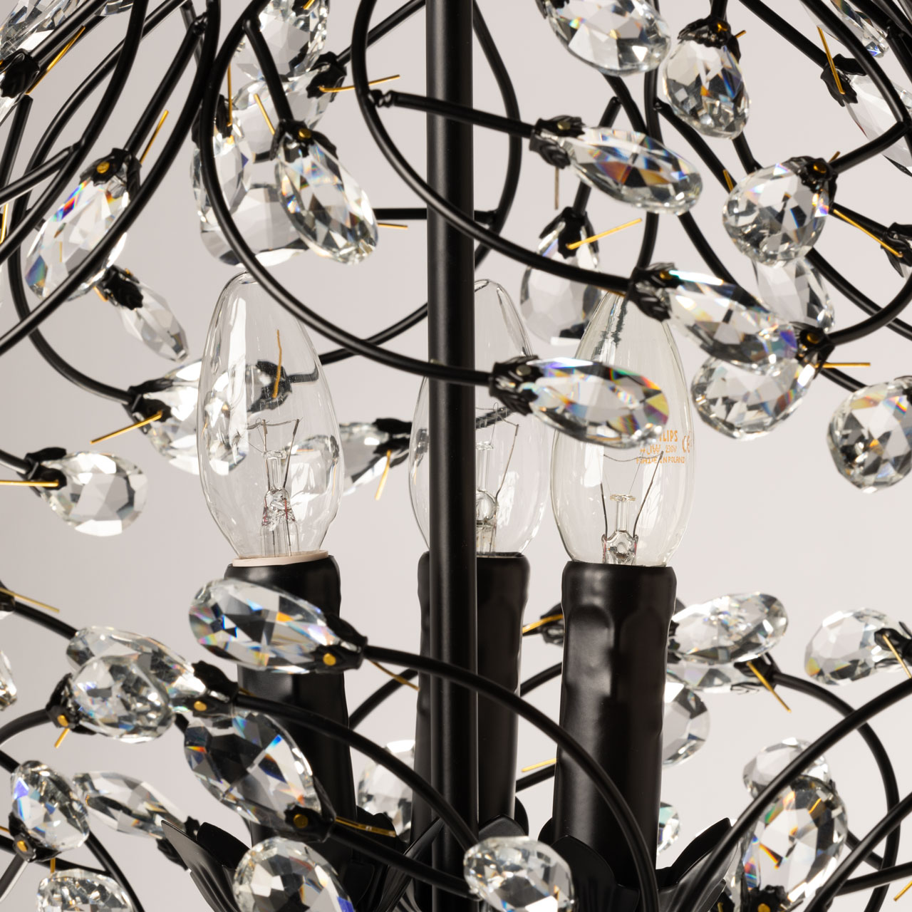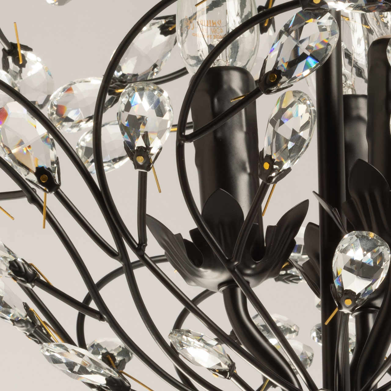 Металлическое основание подвесной люстры окрашено в черный цвет. Люстра декорирована прозрачным хрусталем формы миндаля. Крепления хрусталя гальванизированы в цвет золота.