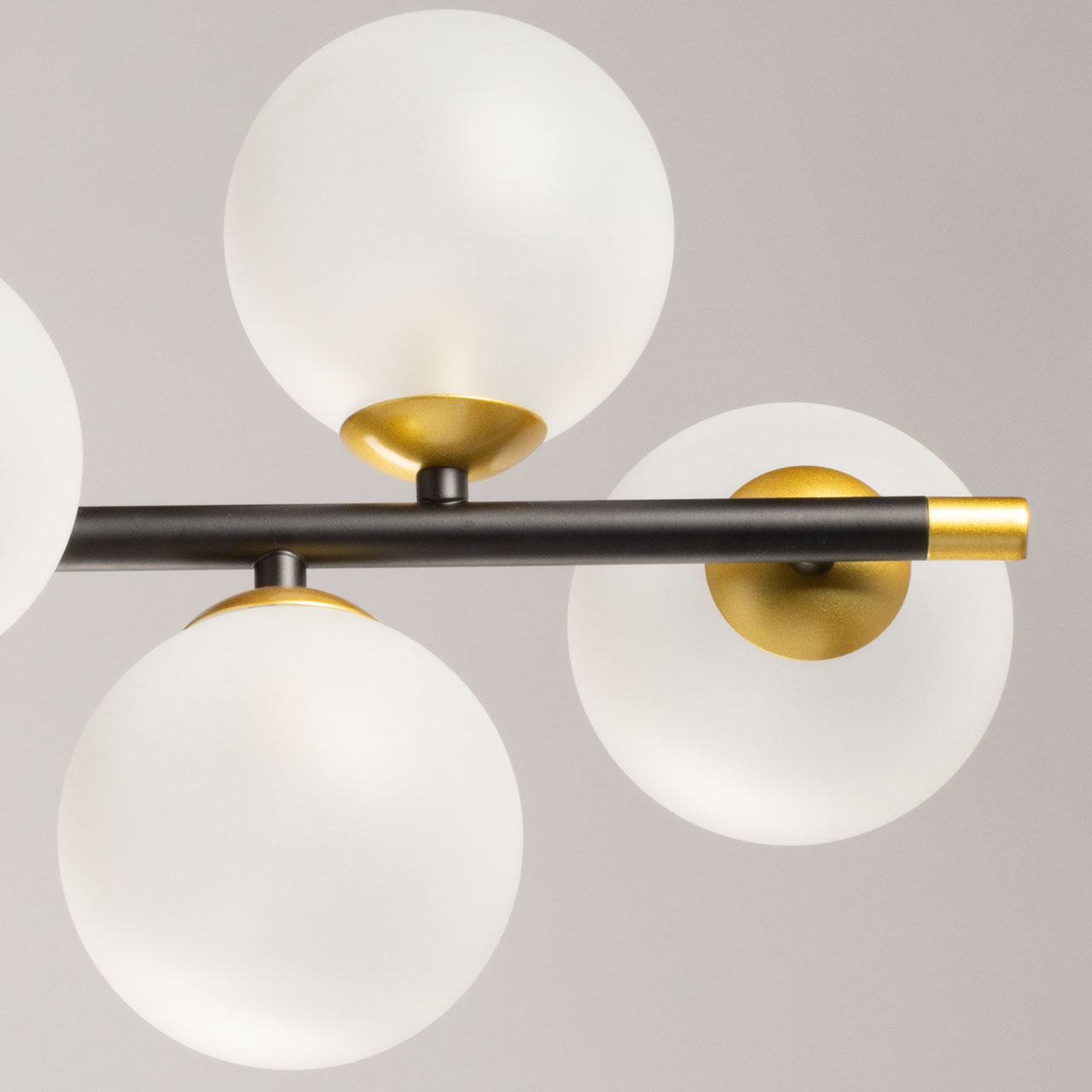 Металлическое основание окрашено в черный цвет. Отдельные элементы основания окрашены в цвет золота. Заменяемые источники света с цоколем G9 закрыты матовыми стеклянными плафонами.