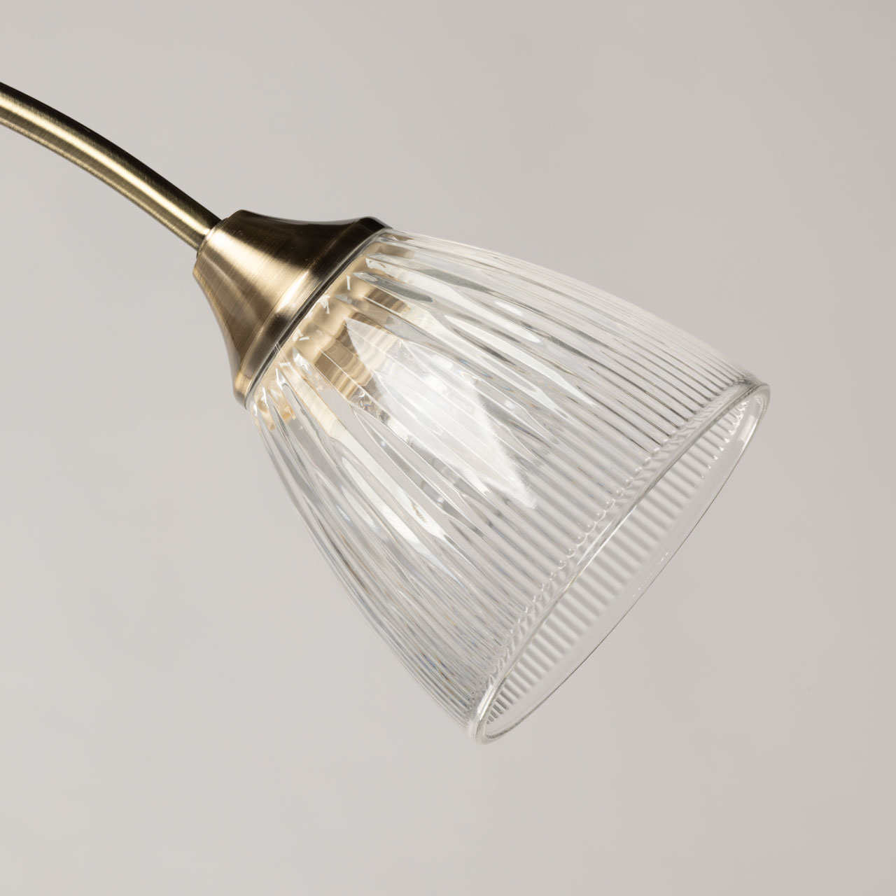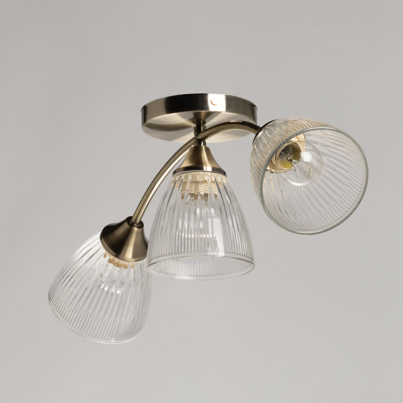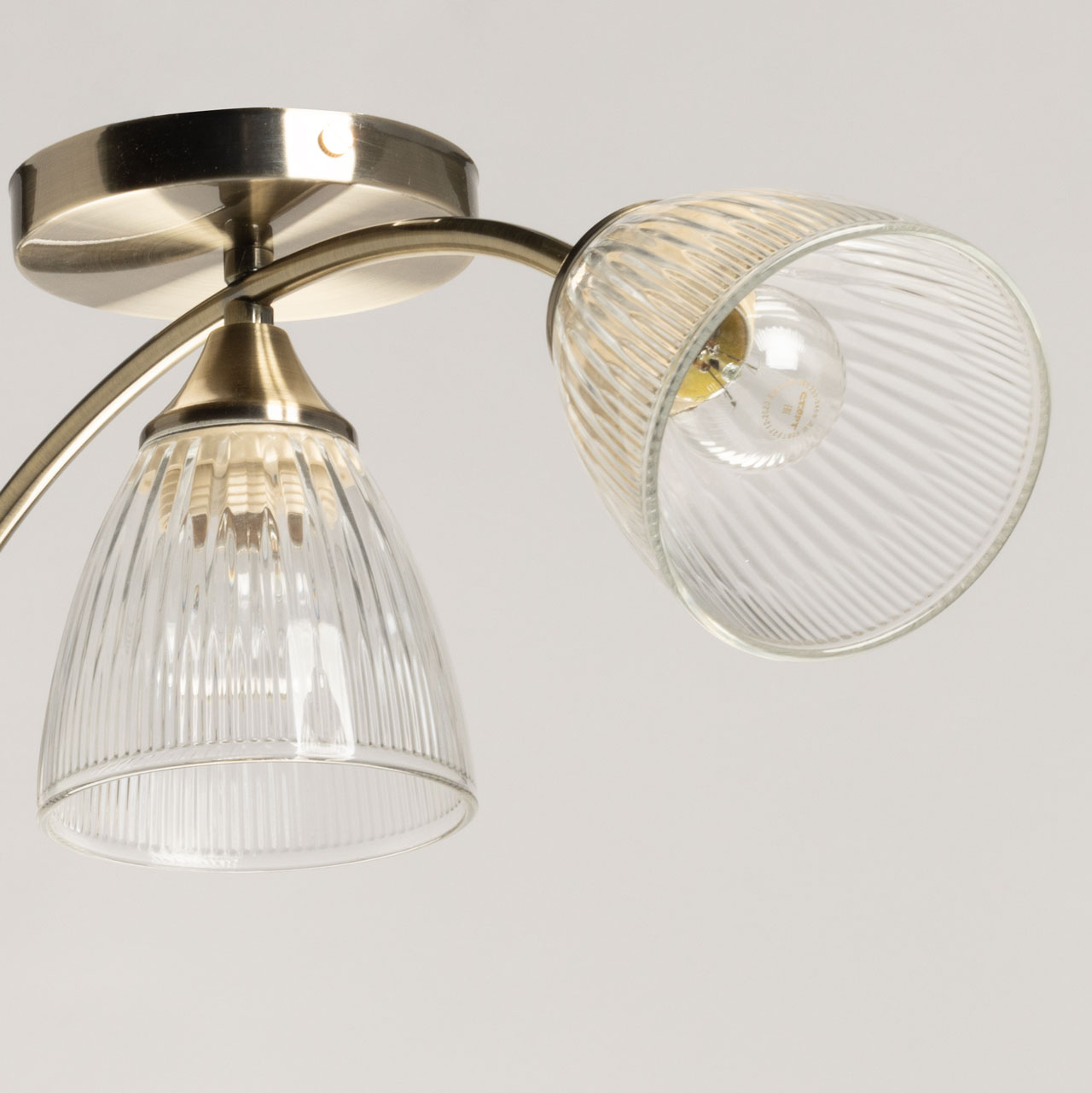 Металлическое основание потолочной люстры гальванизировано в цвет античной бронзы. Люстра декорирована прозрачными фактурными плафонами, отлитыми в форму.
