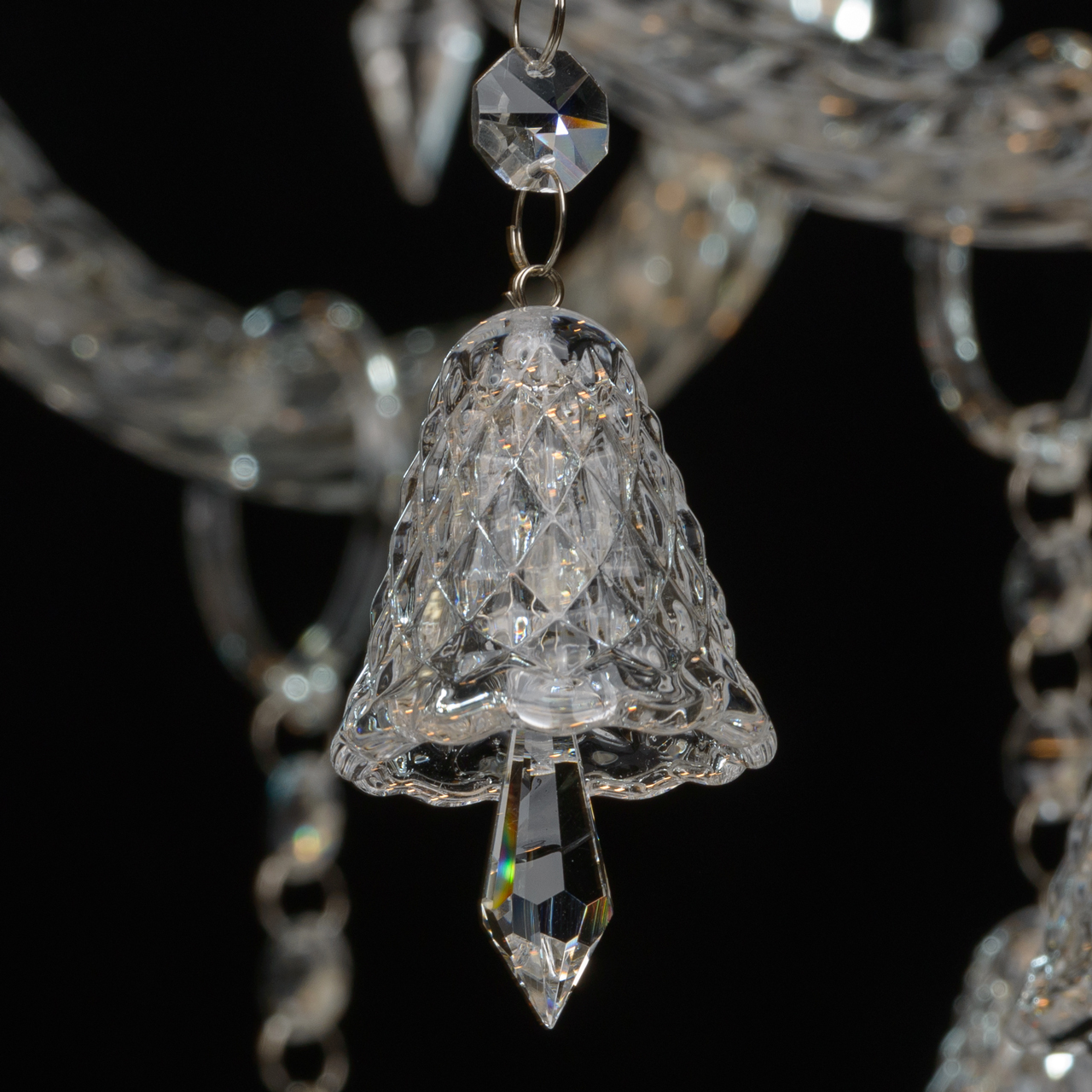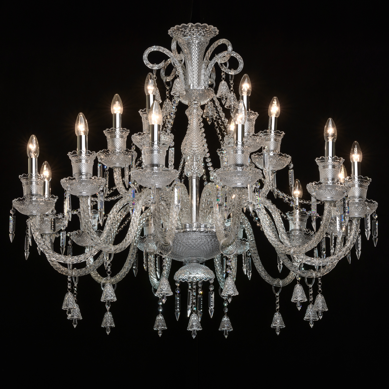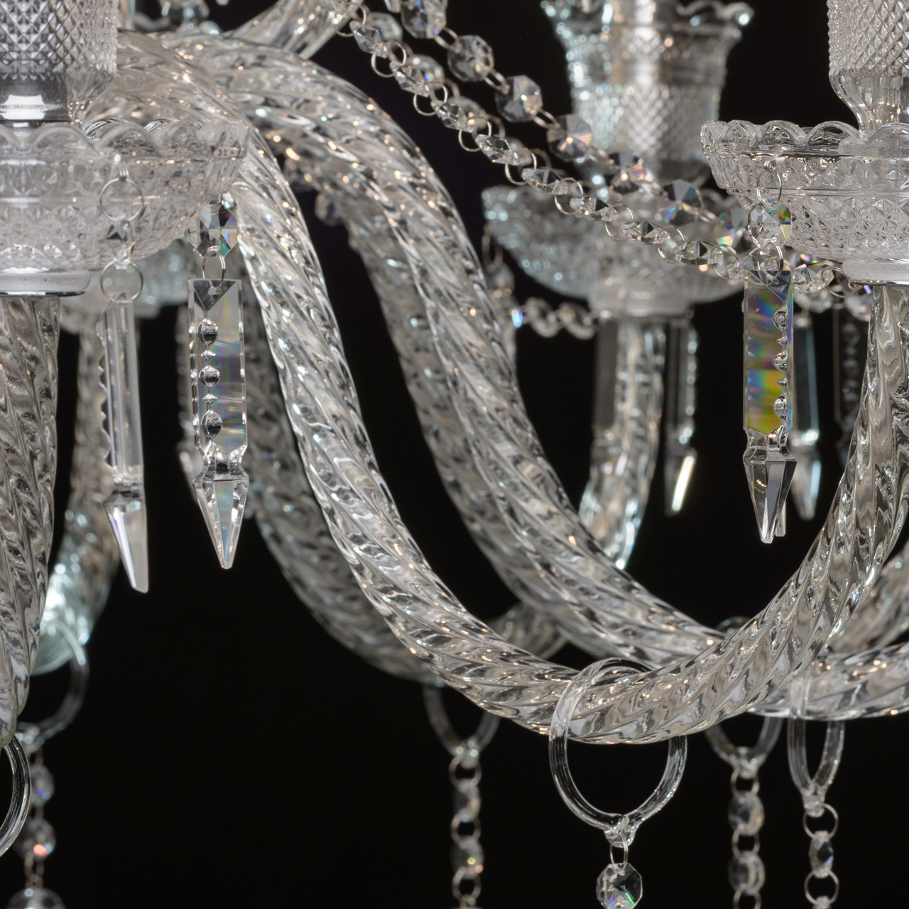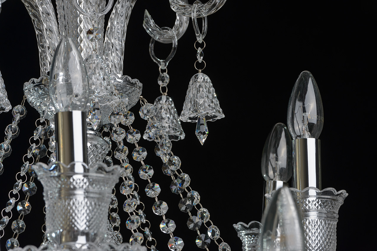 Металлическое основание гальванизировано в цвет хрома и декорировано прозрачным хрустальным стеклом грановитой огранки. Розетки и декор центральной оси отлиты в сложную форму. Витые рожки произведены гутным способом. Светильник декорирован прозрачным хрусталем оригинальной формы и огранки.
