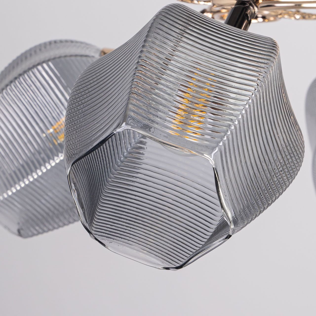 Металлическое основание потолочной люстры гальванизировано в цвет золота. Отдельные элементы основания гальванизированы в цвет черного хрома. Потолочная люстра декорирована стеклянными плафонами сложной формы, гальванизированными в дымчатый металлизированный цвет.