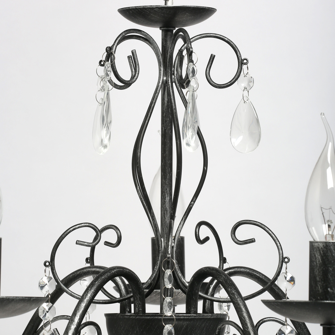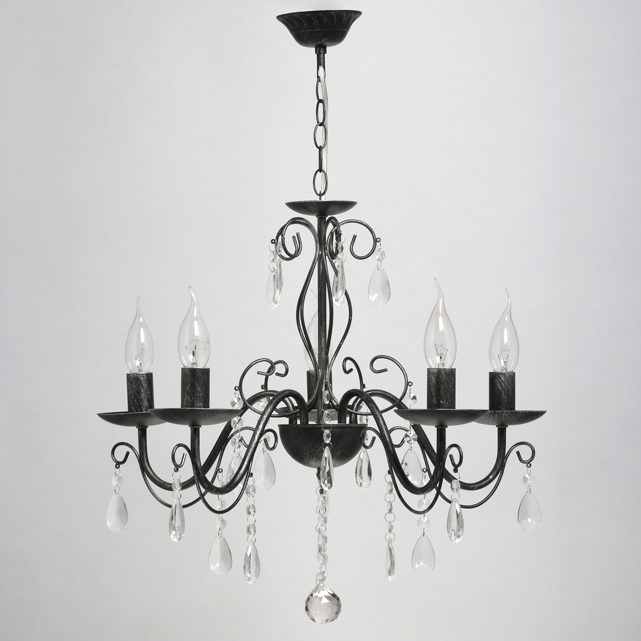 Основание светильника выполнено из металла и обработано по технологии хай-лайт, где основной слой черного цвета, а декоративный слой серебряного цвета. Светильник декорирован прозрачным хрусталем.