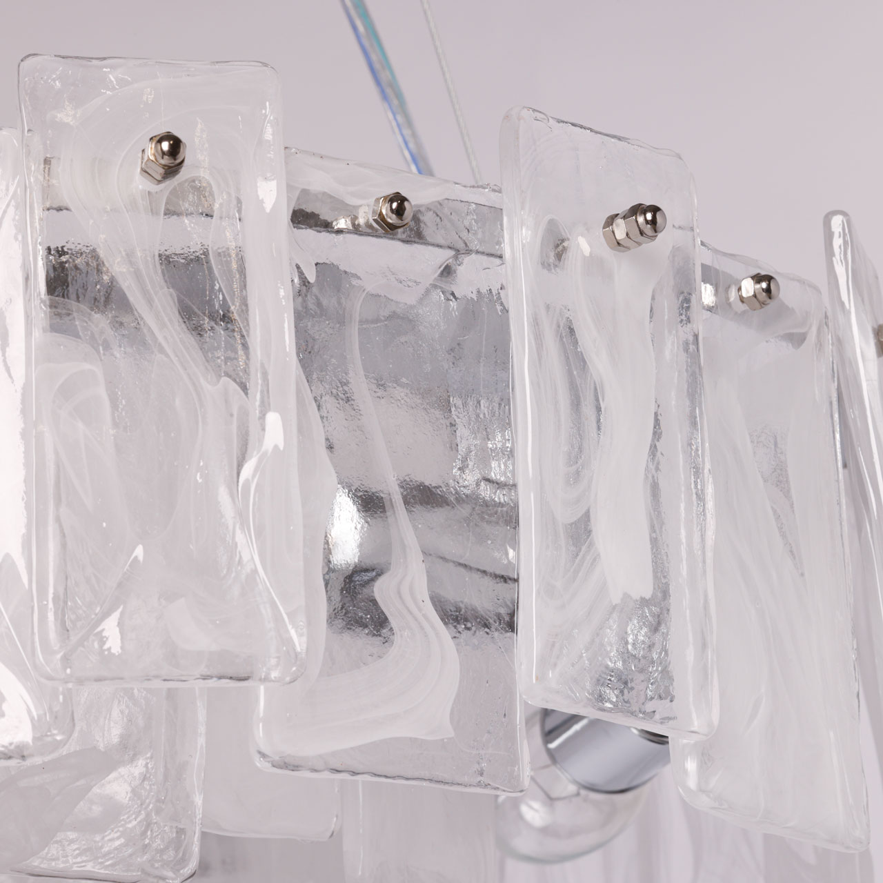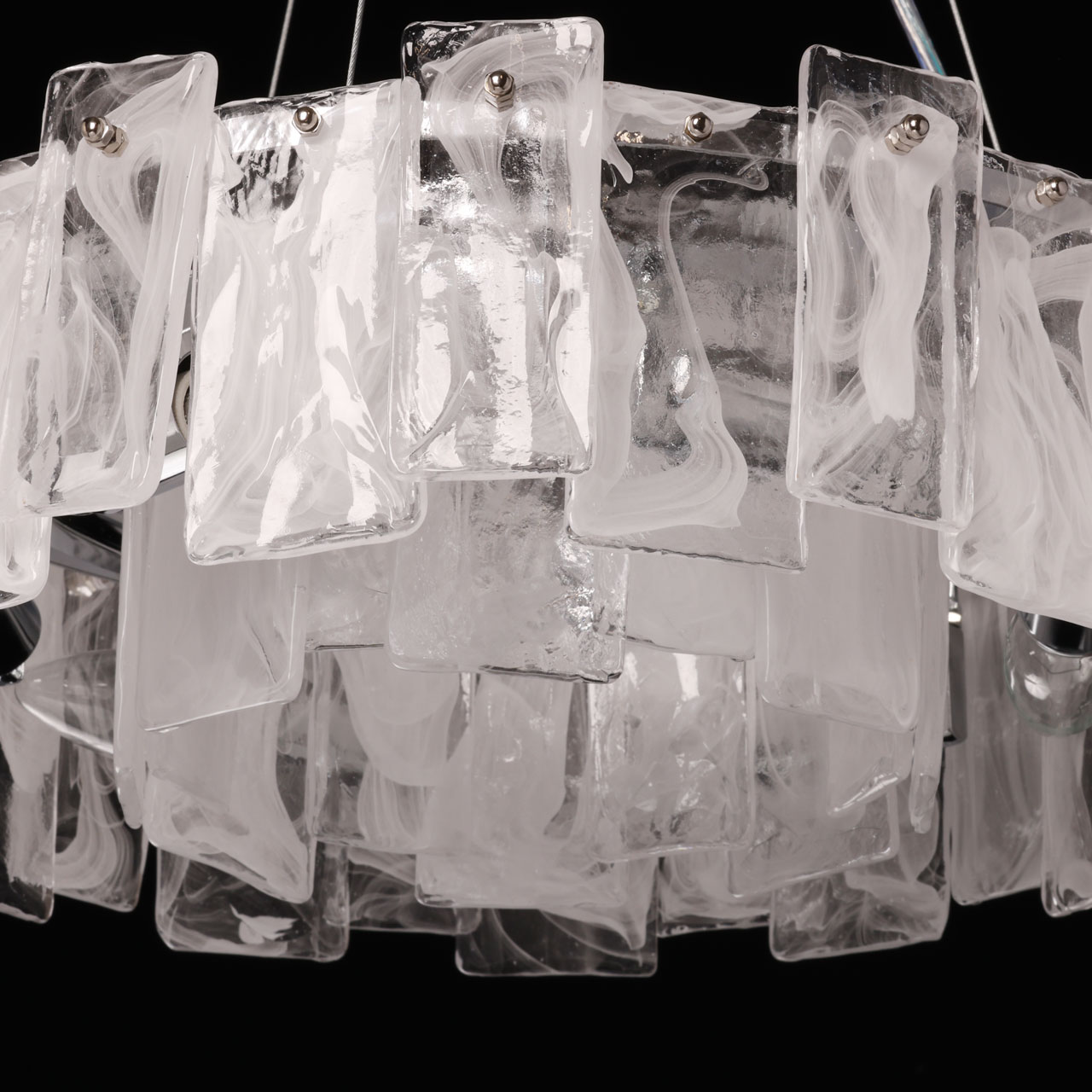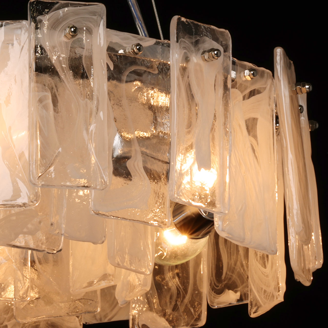 Металлическое основание люстры гальванизировано в цвет хрома. Плафон выполнен из пластин из стекла, иммитирующего природные минералы прямоугольной формы.