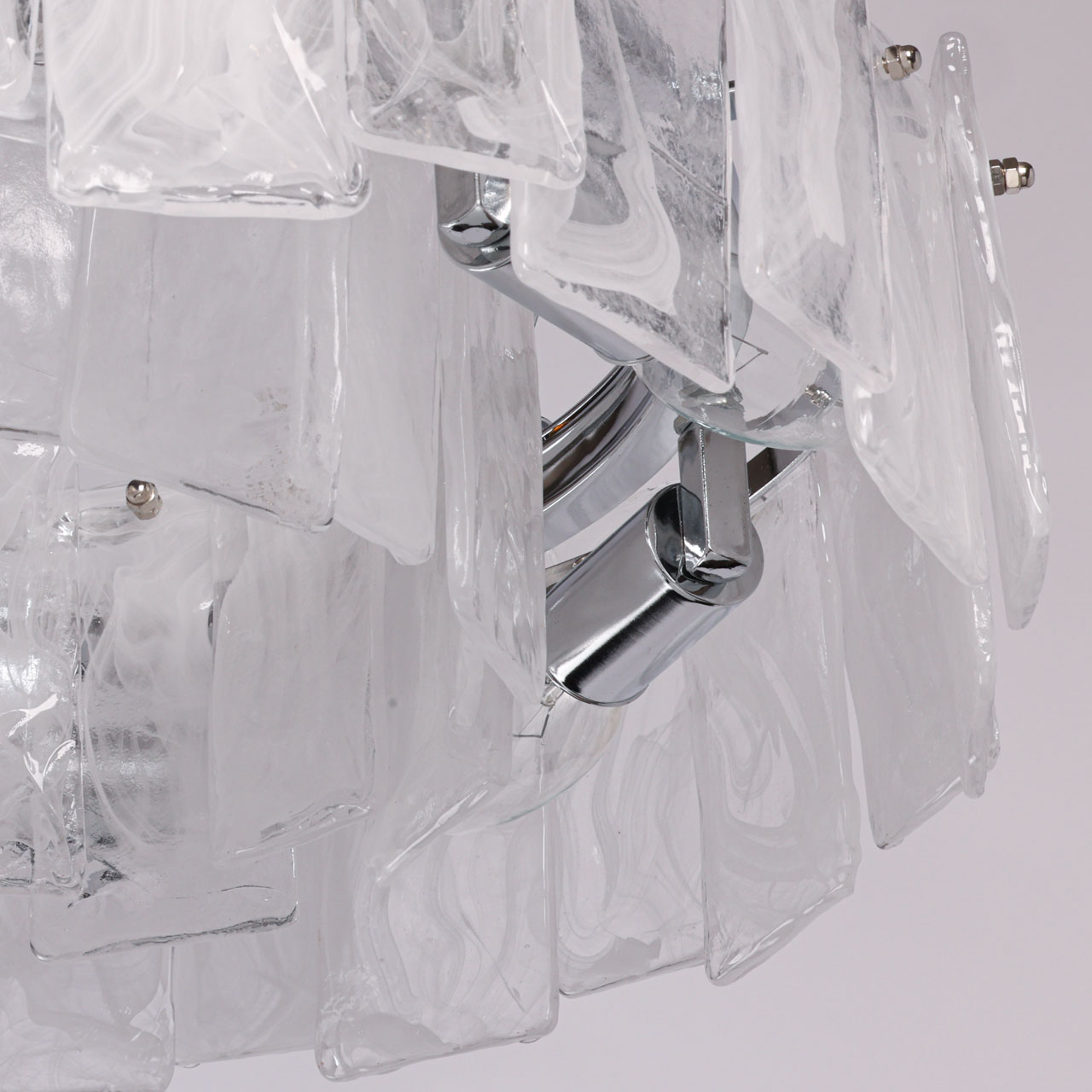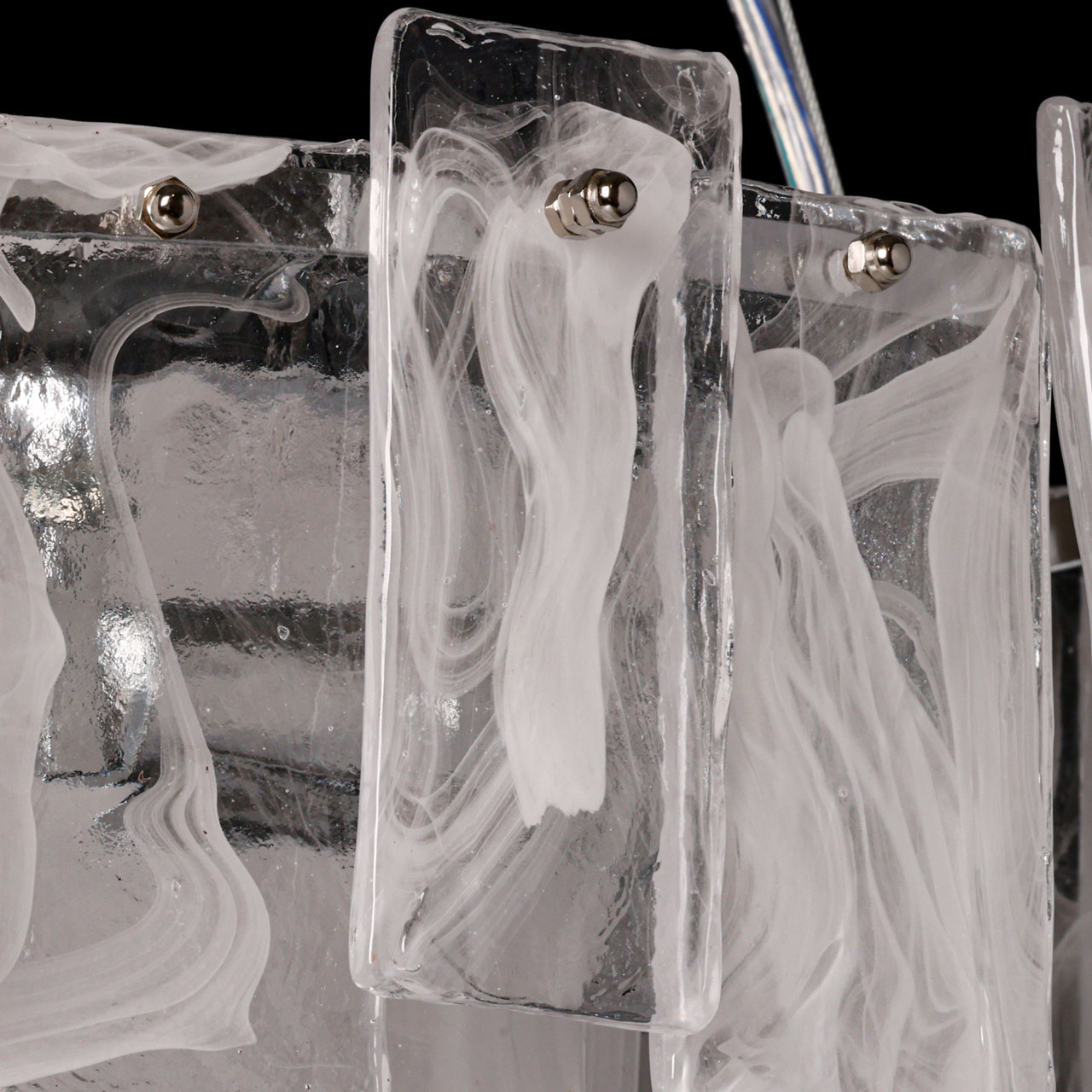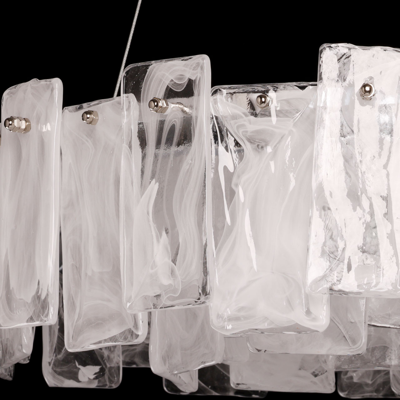 Металлическое основание люстры гальванизировано в цвет хрома. Плафон выполнен из пластин из стекла, иммитирующего природные минералы прямоугольной формы.
