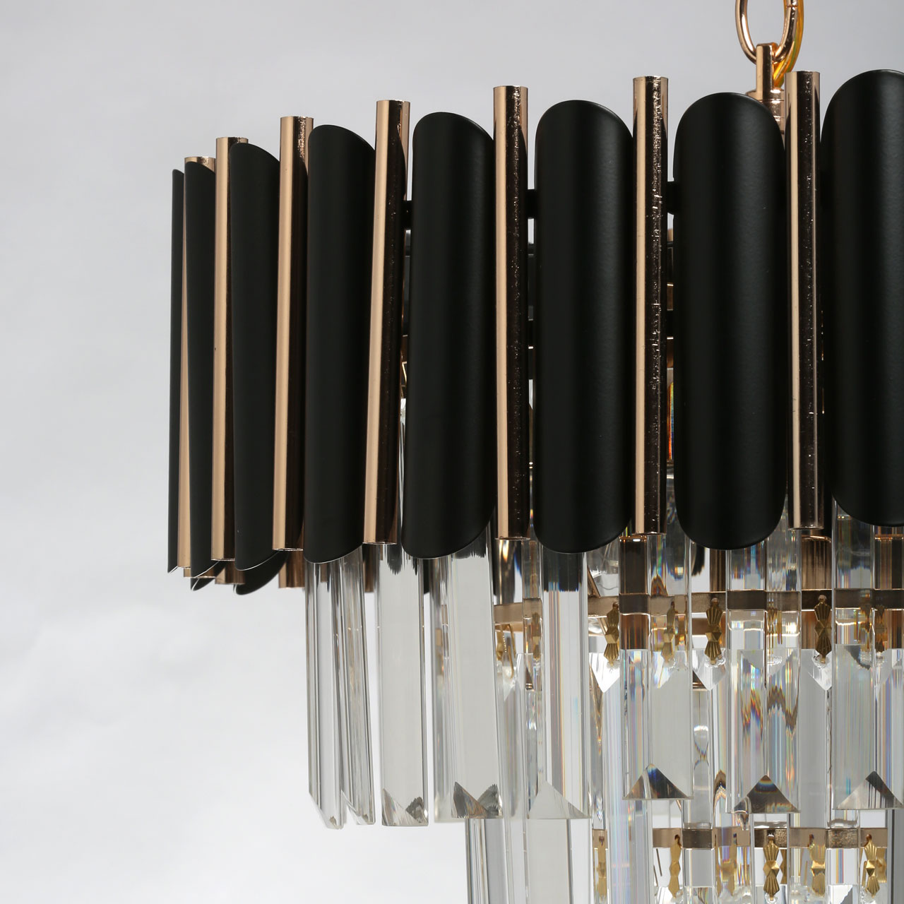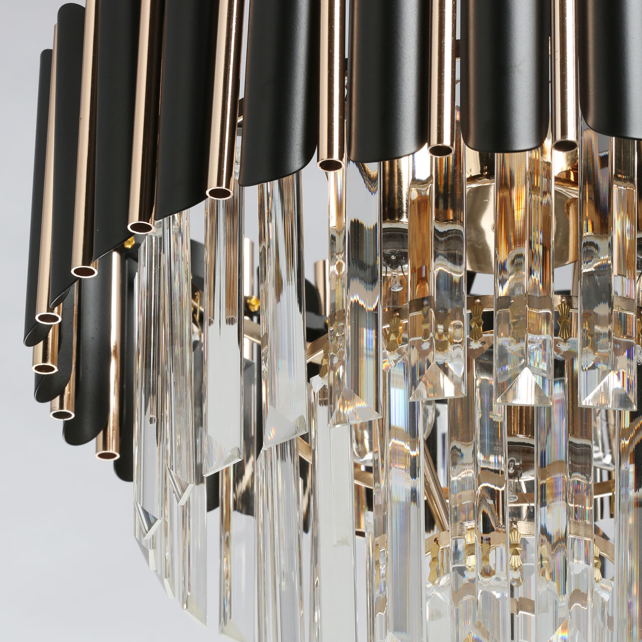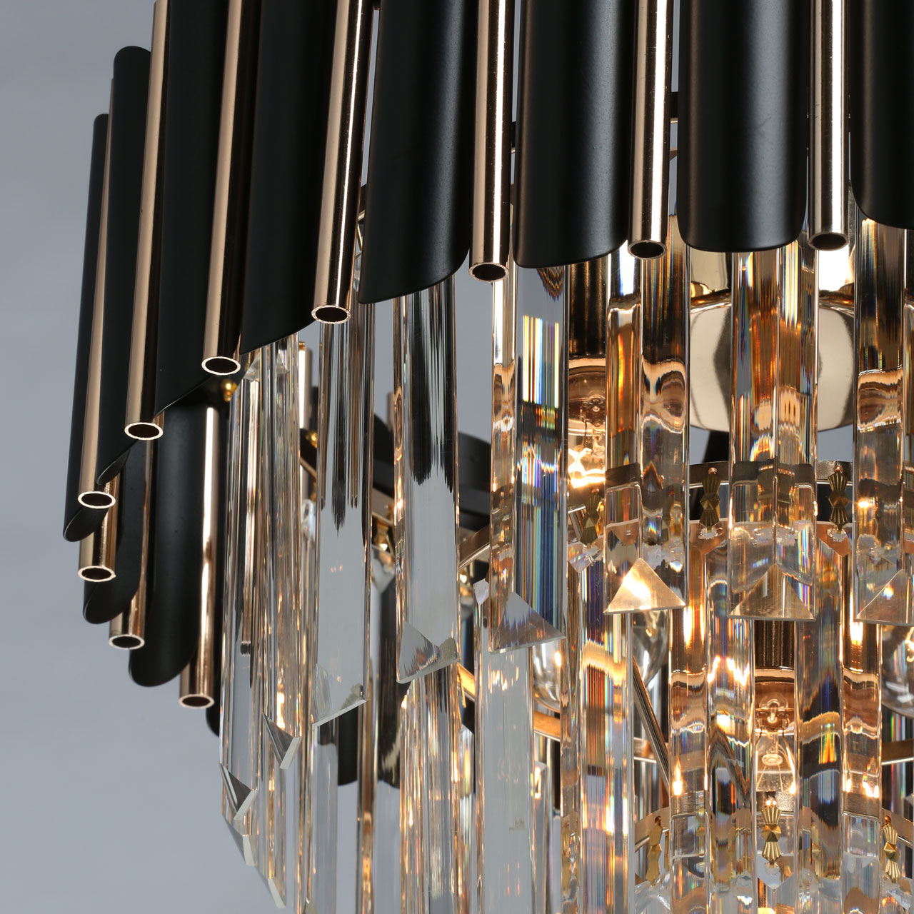 Металлическое основание светильника гальванизировано в цвет золота. Металлический плафон состоит из трубочек, окрашенных в черный цвет и гальванизированных в цвет золота. Светильник декорирован хрусталем прямоугольной формы