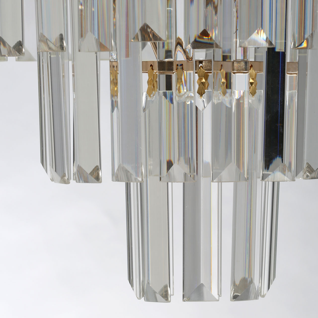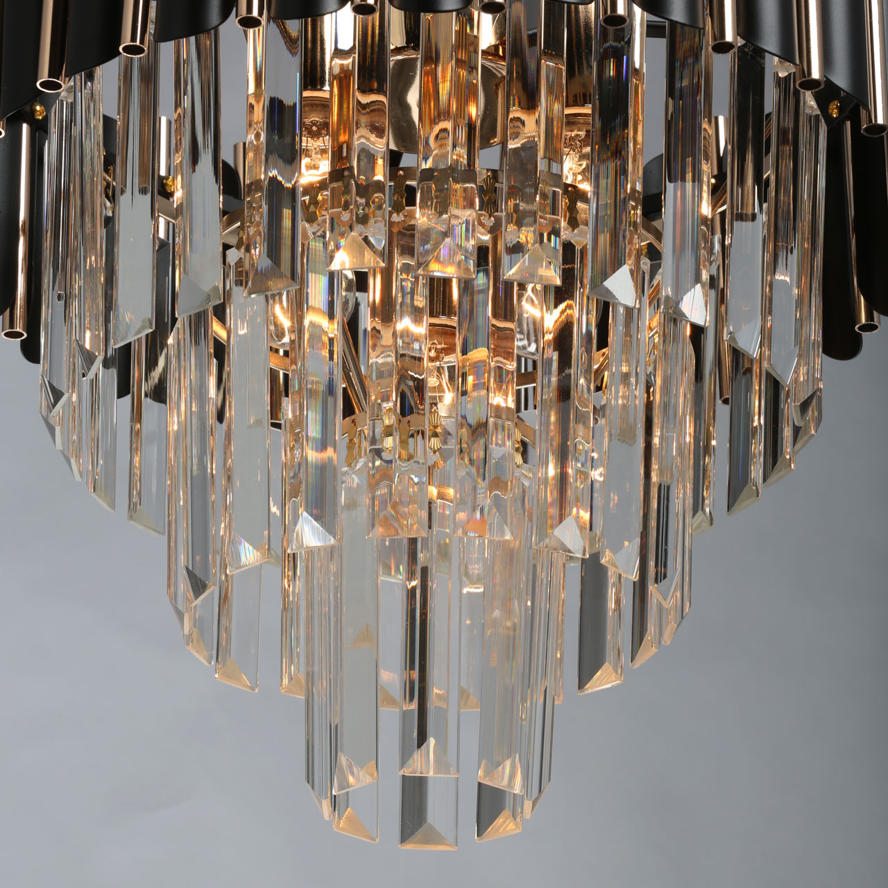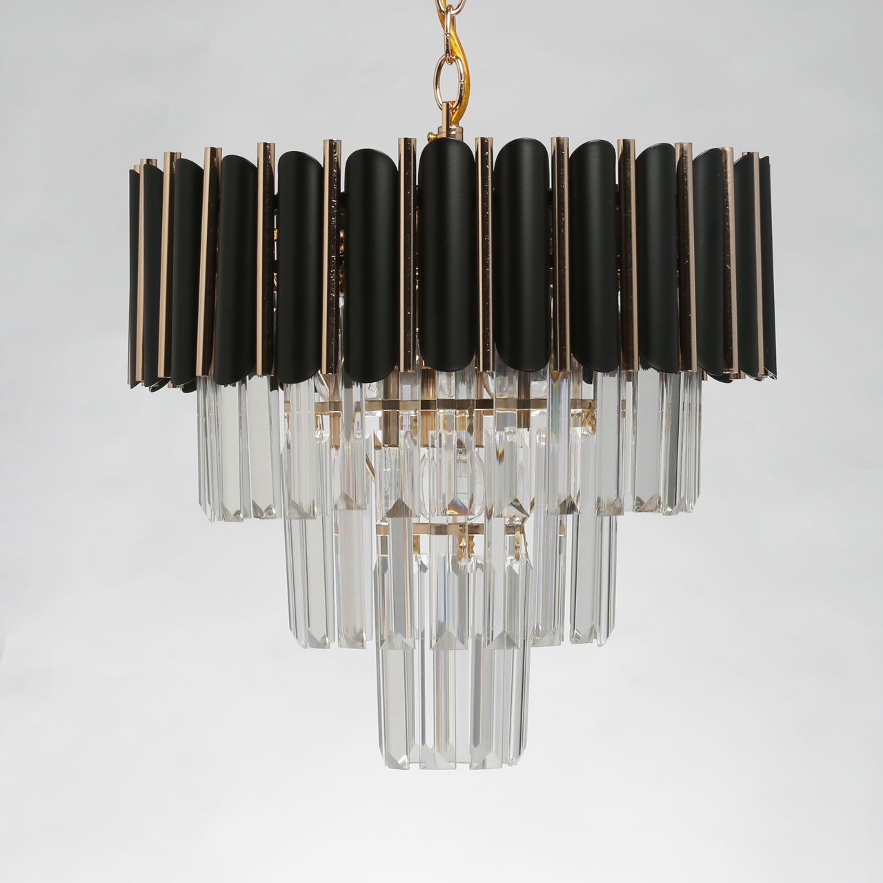 Металлическое основание светильника гальванизировано в цвет золота. Металлический плафон состоит из трубочек, окрашенных в черный цвет и гальванизированных в цвет золота. Светильник декорирован хрусталем прямоугольной формы