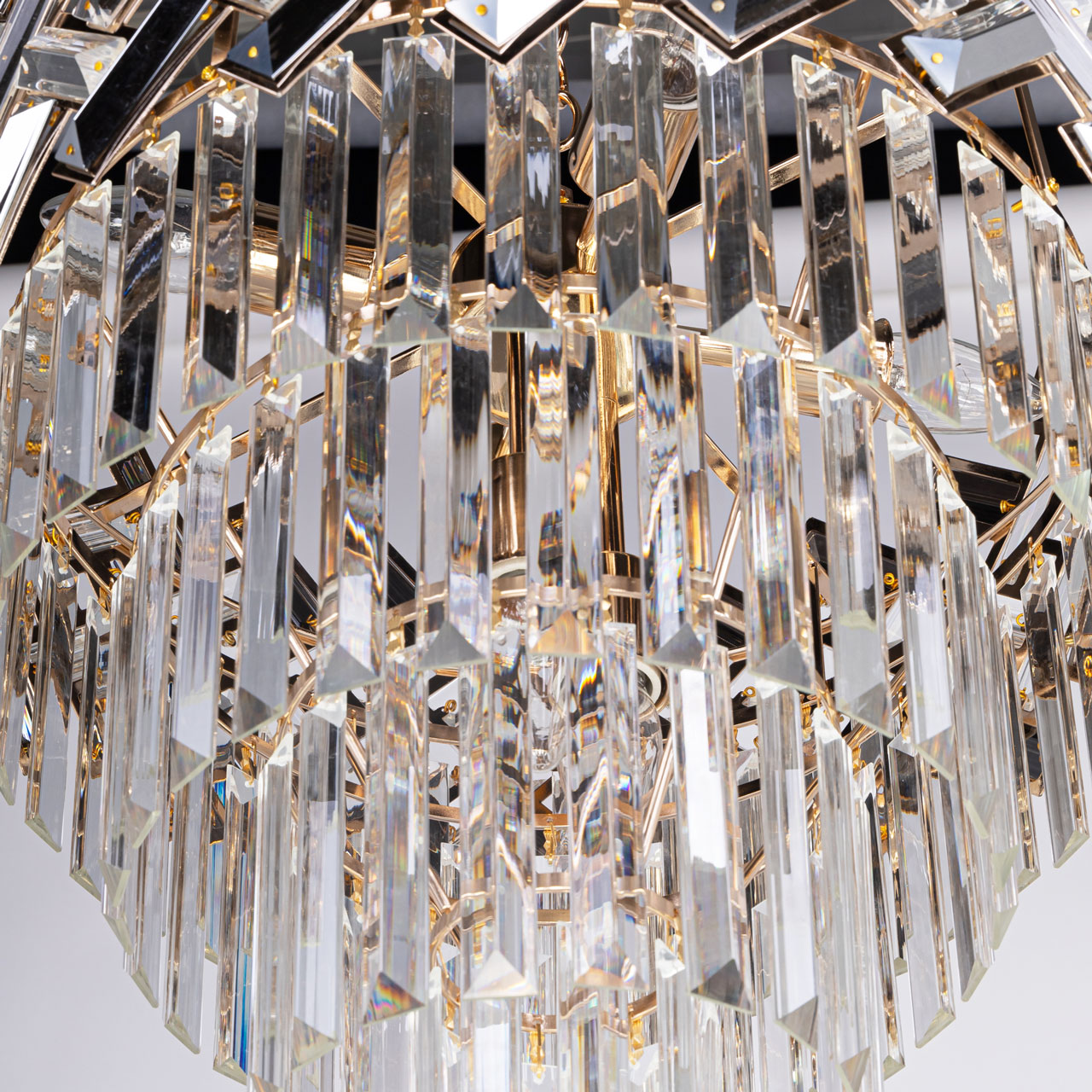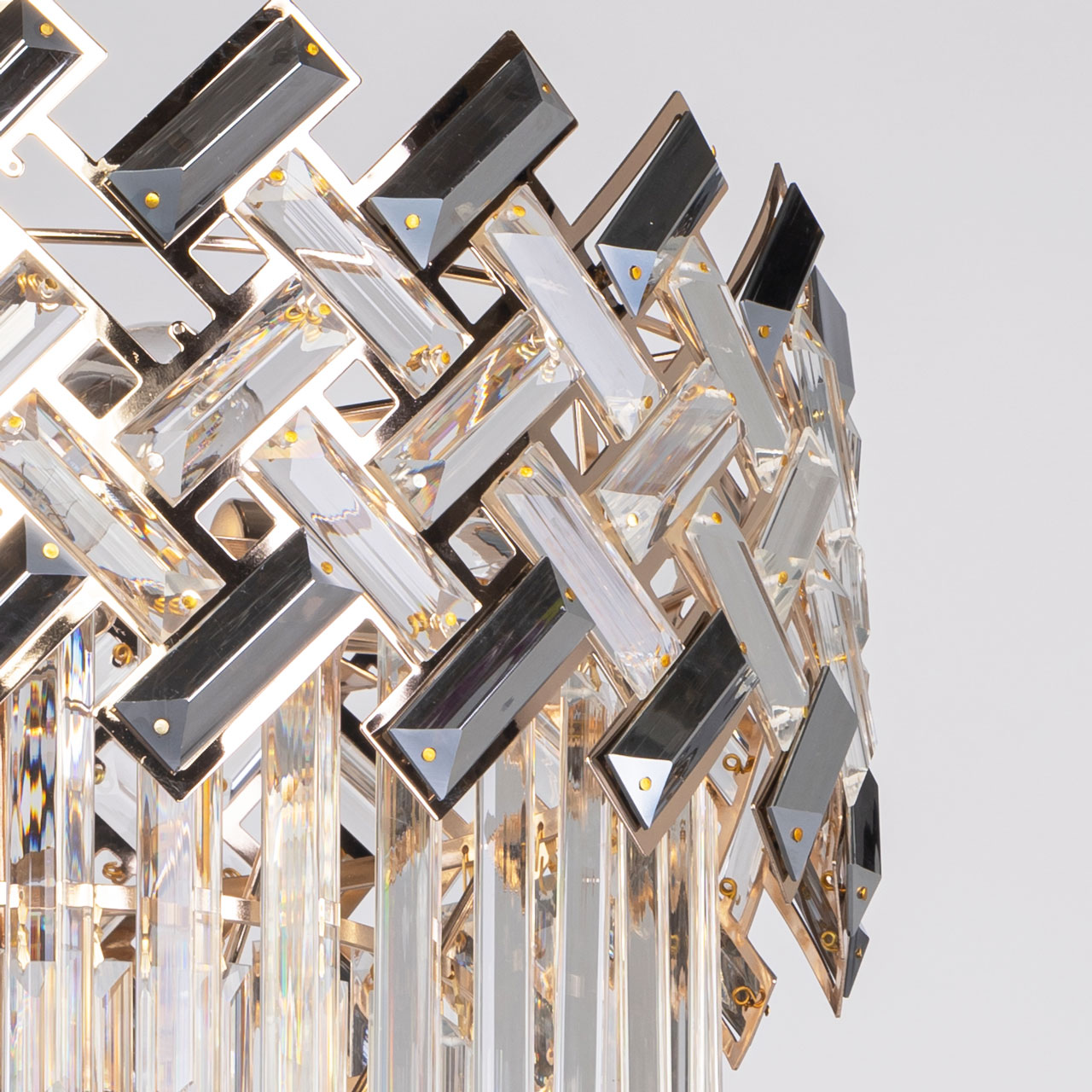 Металлическое основание светильника гальванизировано в цвет золота. Подвесная люстра декорирована прозрачным и гальванизированным в дымчатый цвет хрусталем.