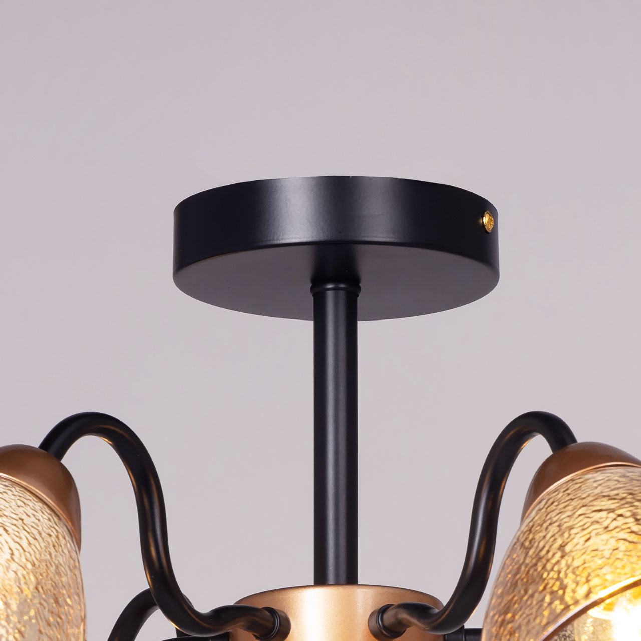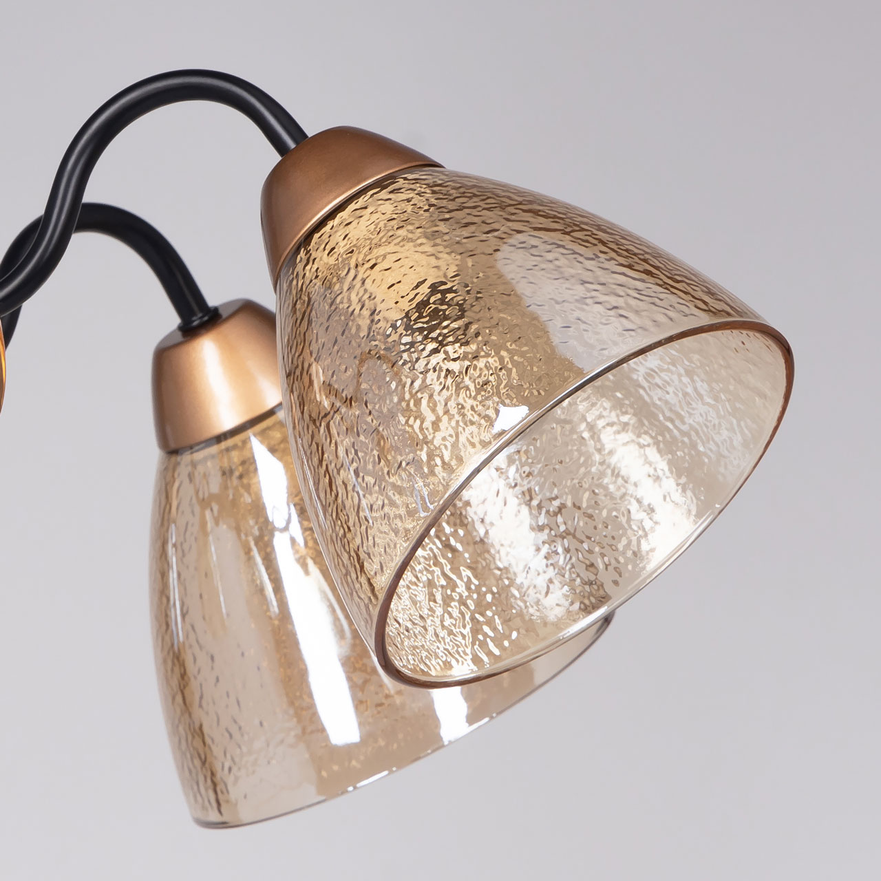 Металлическое основание потолочной люстры окрашено в черный цвет. Отдельные элементы основания гальванизированы в цвет золота. Потолочная люстра декорирована плафонами из фактурного стекла, гальванизированного в цвет коньяк.