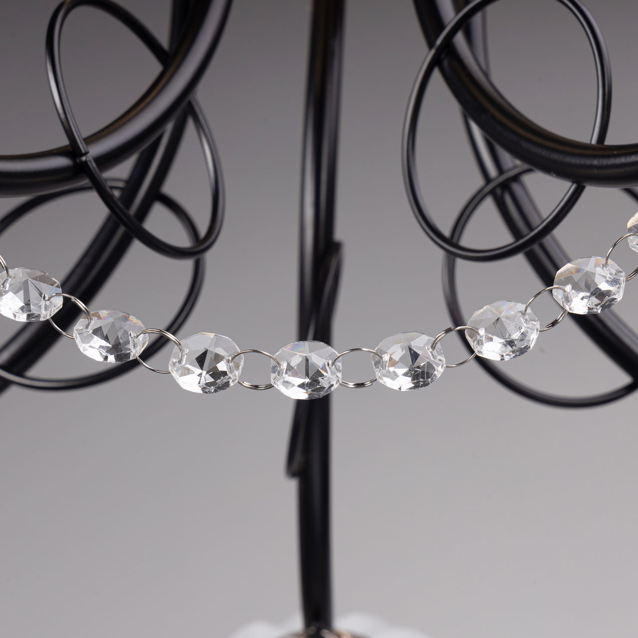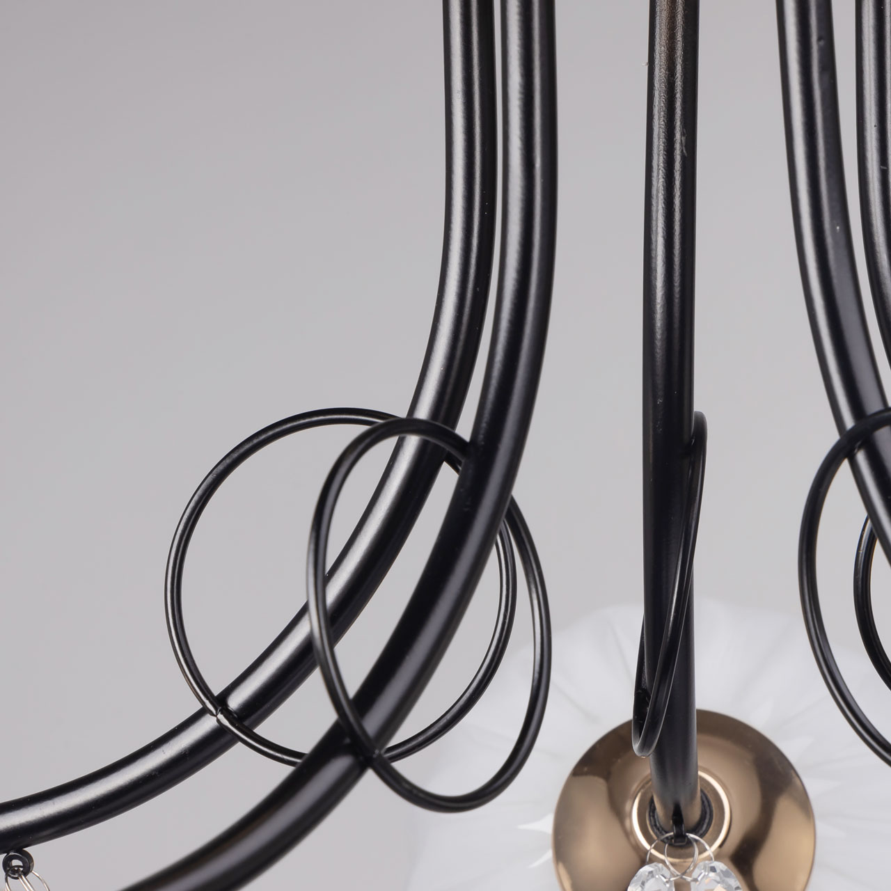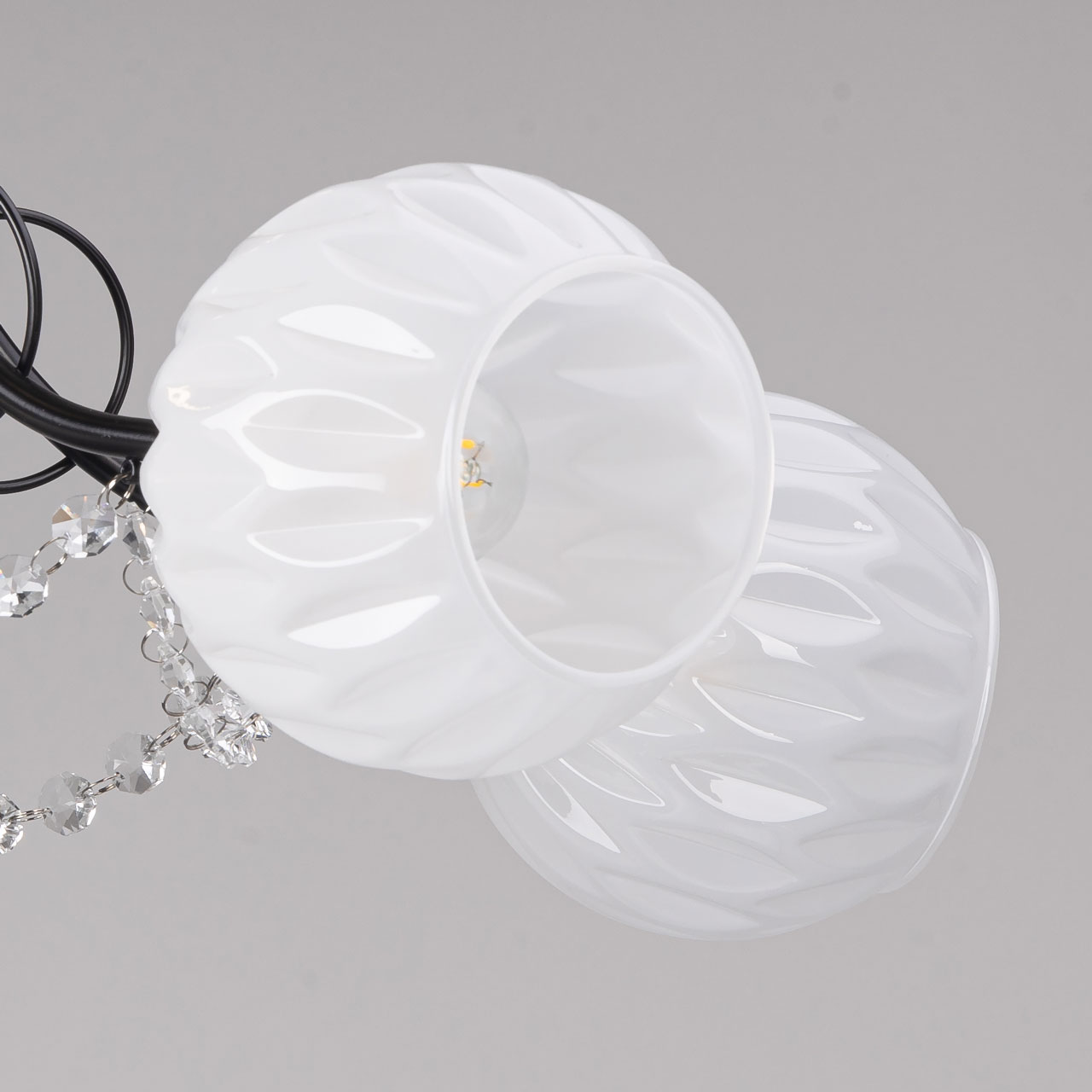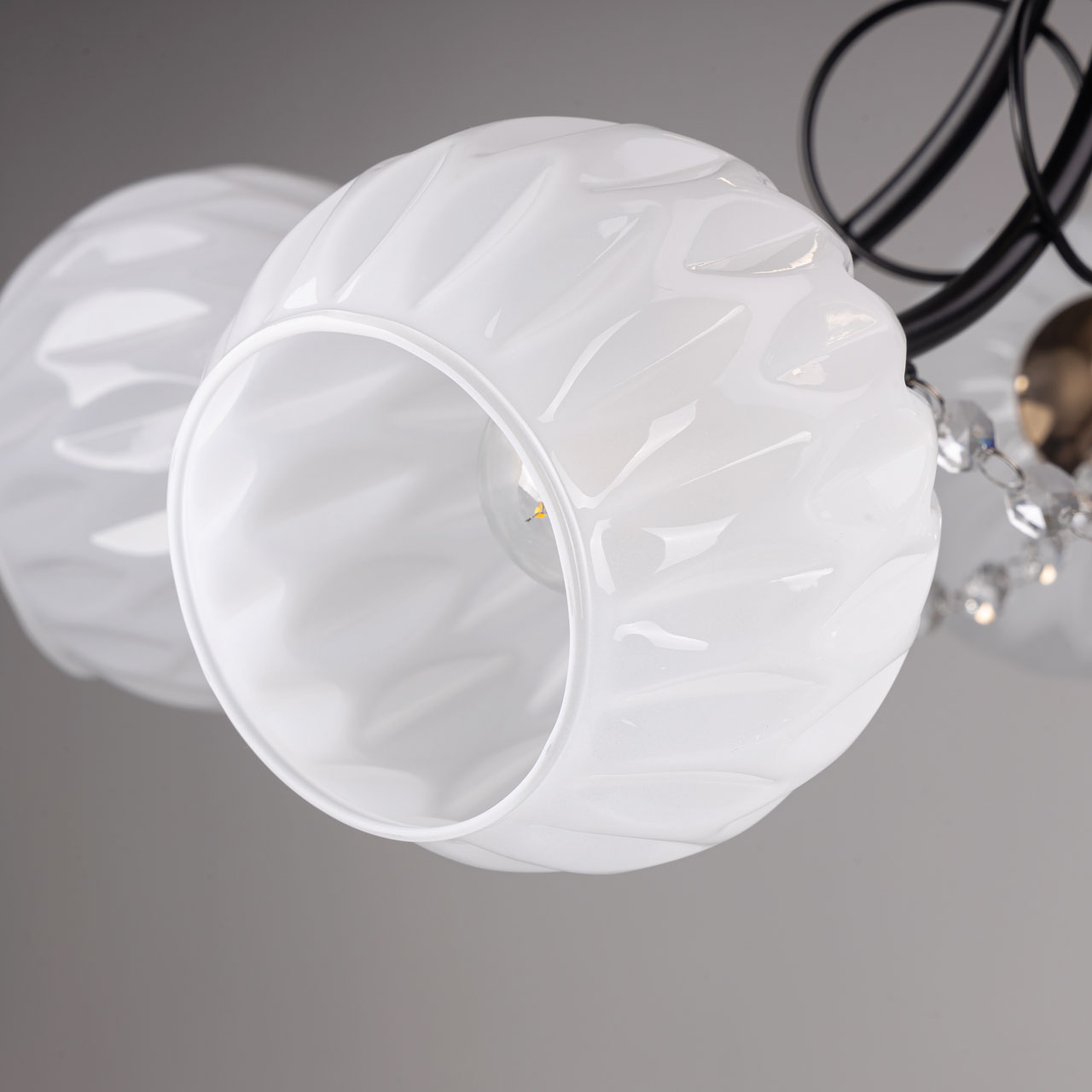 Металлическое основание потолочной люстры гальванизировано в цвет золота. Рожки окрашены в черный цвет. Белые стеклянные плафоны выдуваются в сложную форму. Потолочная люстра декорирована прозрачным хрусталем формы октагон.