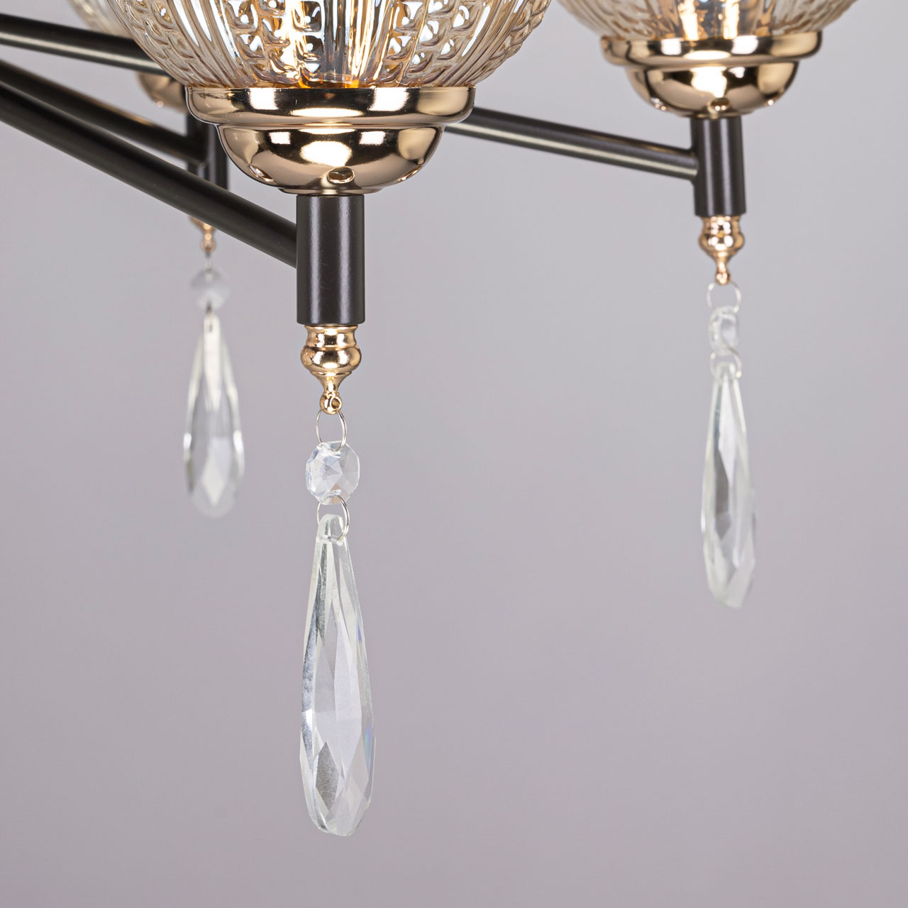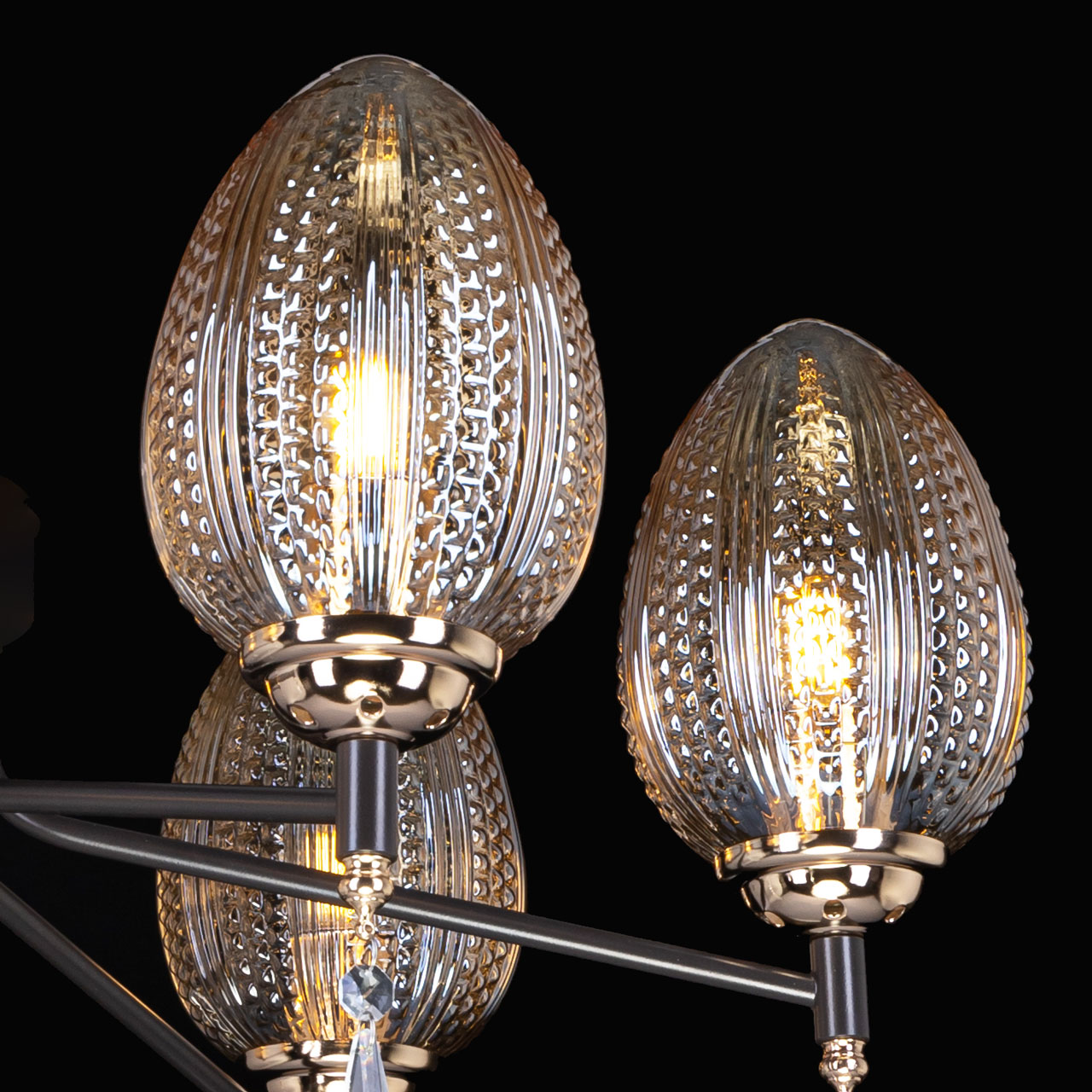 Металлическое основание потолочной люстры окрашено в цвет кофе. Отдельные элементы основания гальванизированы в цвет золота. Плафоны выполнены из фактурного стекла, отлитого в сложную форму и гальванизированного в цвет шампань. Потолочная люстра декорирована прозрачным хрусталем каплевидной формы.
