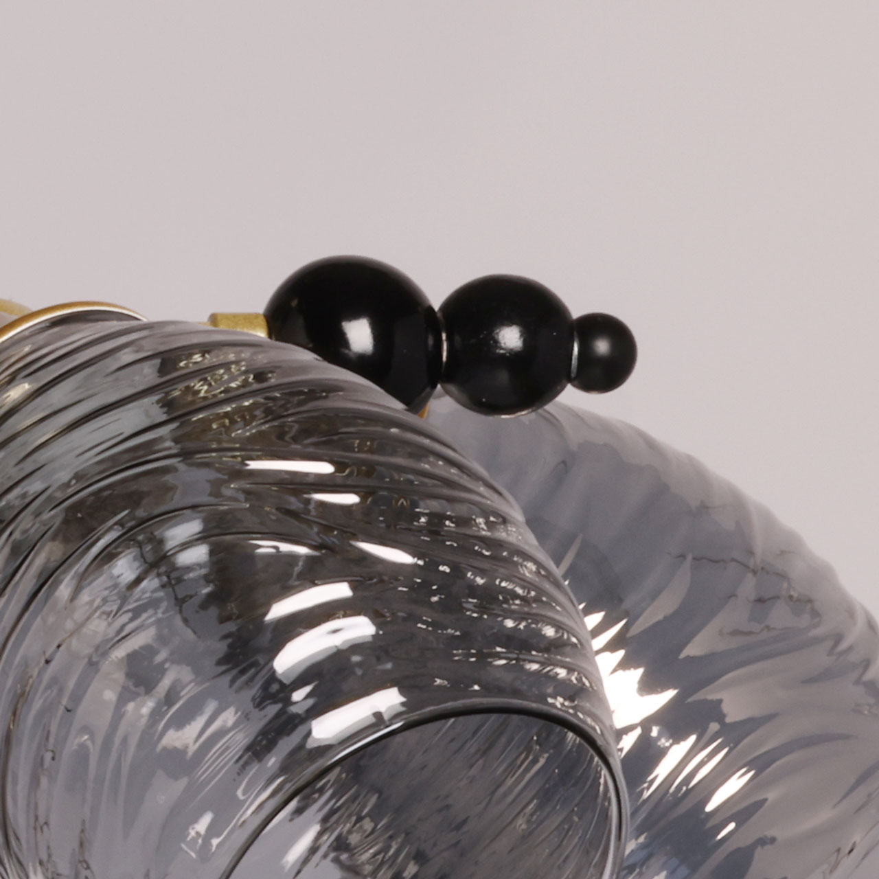 Металлическое основание потолочной люстры гальванизировано в цвет матового золота. Отдельные элементы основания окрашены в черный цвет. Стеклянные фактурные плафоны выдуваются в сложную форму вручную и гальванизированы в дымчатый цвет.