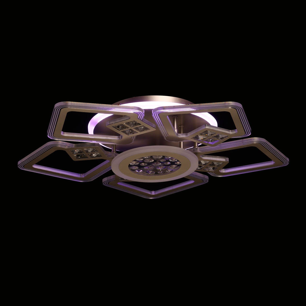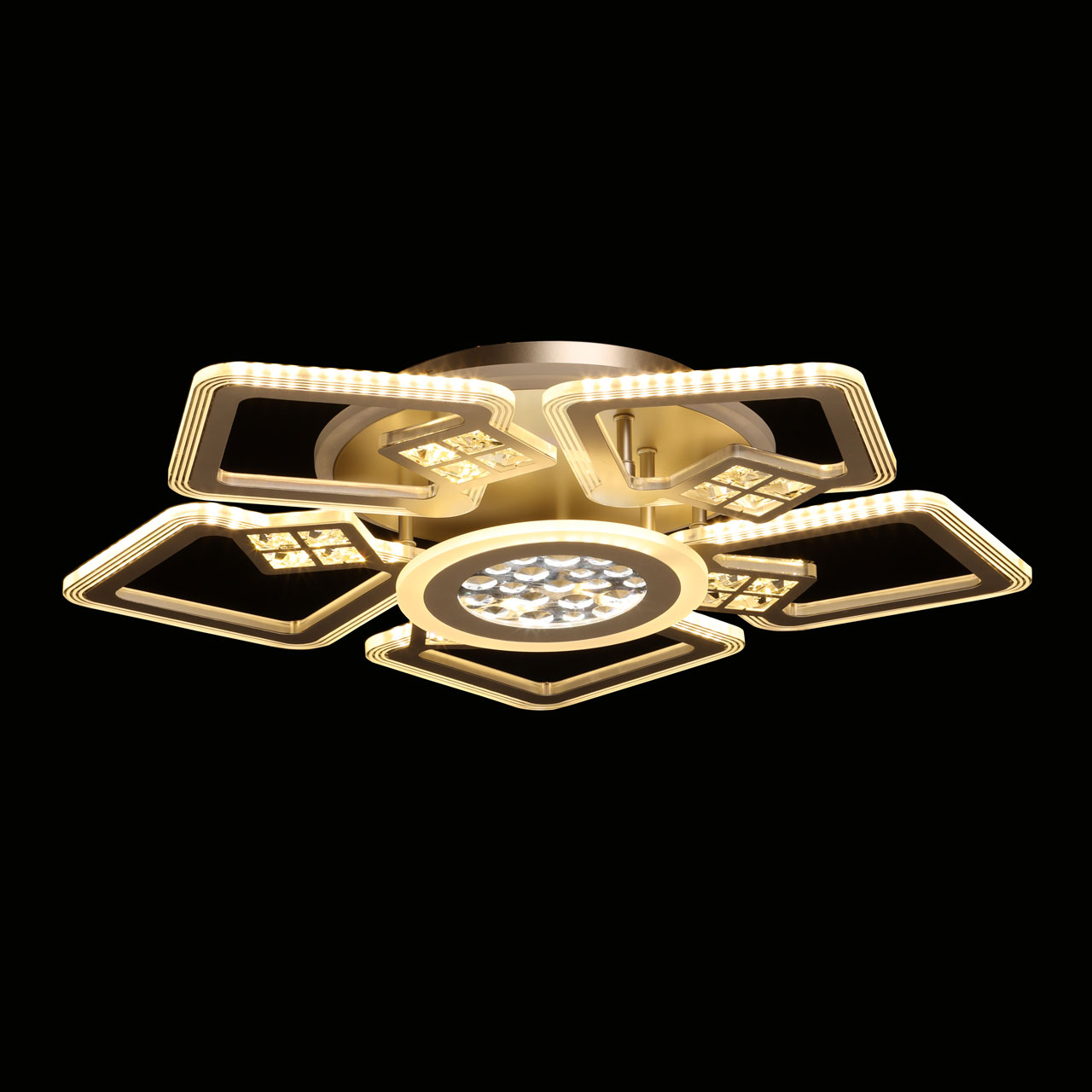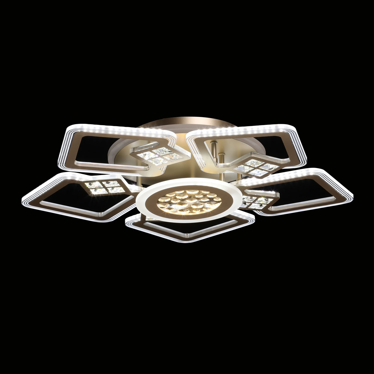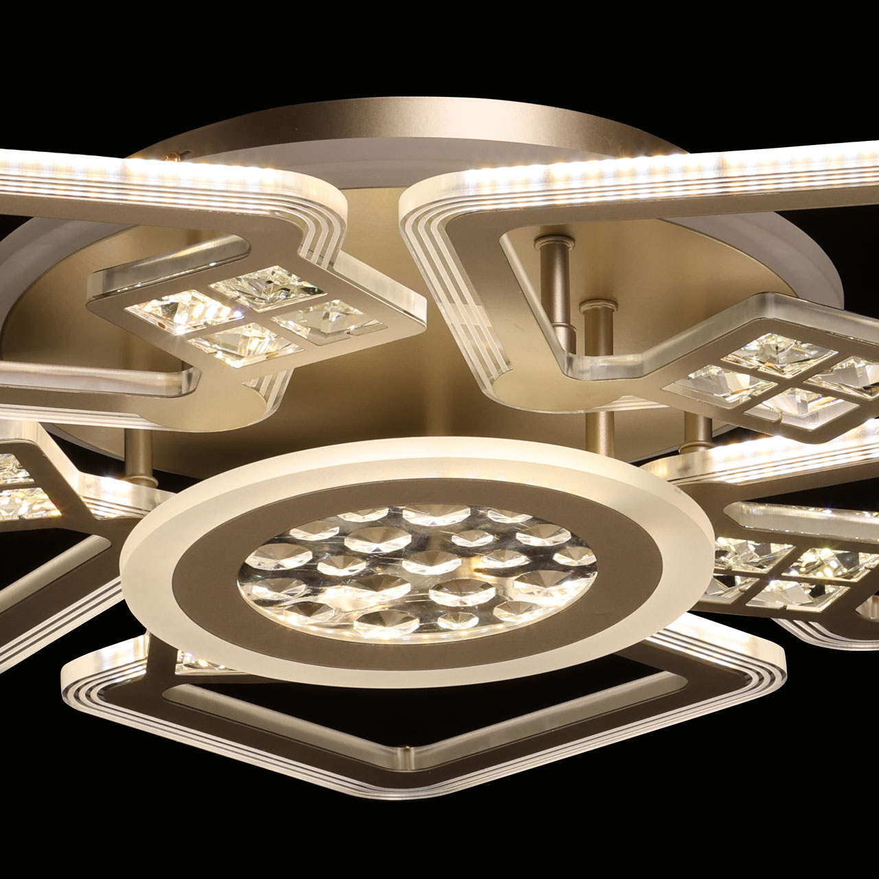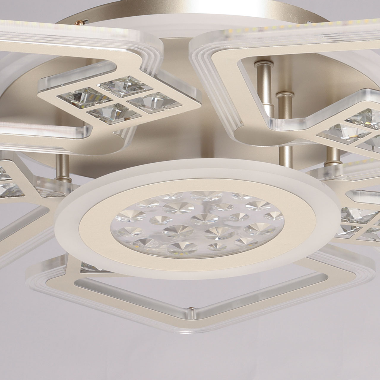 Металлическое основание потолочной люстры окрашено в цвет перламутрового золота. Корпус плафонов выполнен из сплава алюминия с цинком и окрашен в цвет основания. Светодиодные источники света закрыты белым матовым акрилом. Люстра декорирована элементами из прозрачного акрила.
