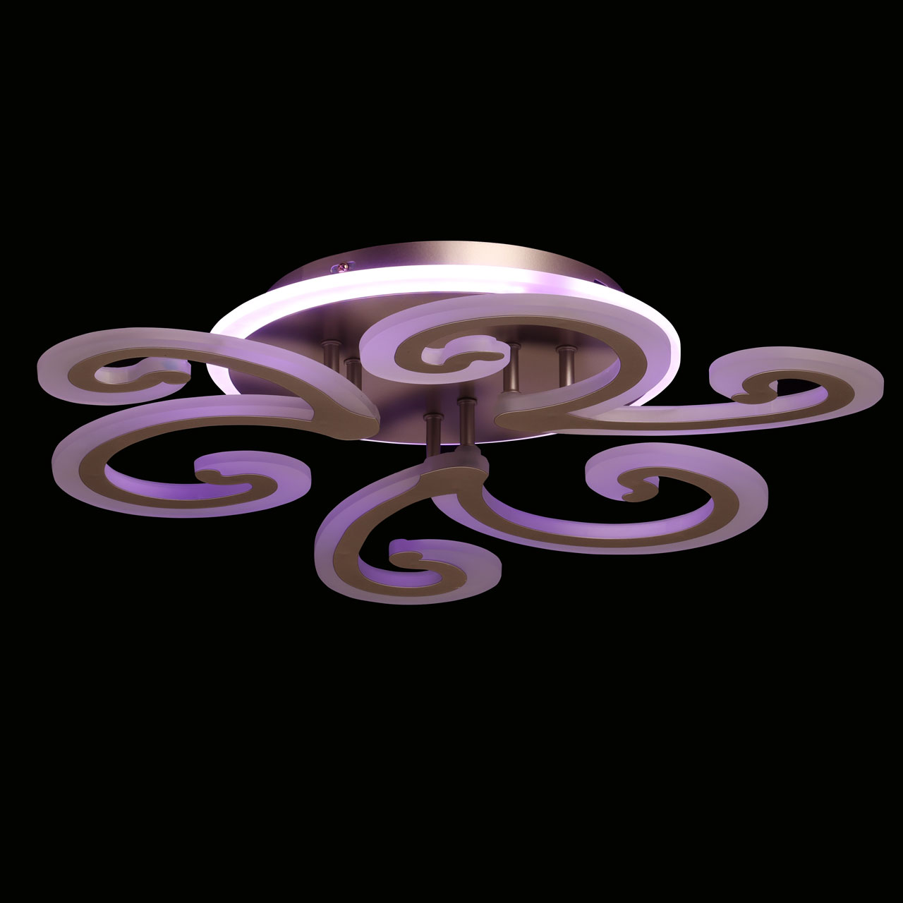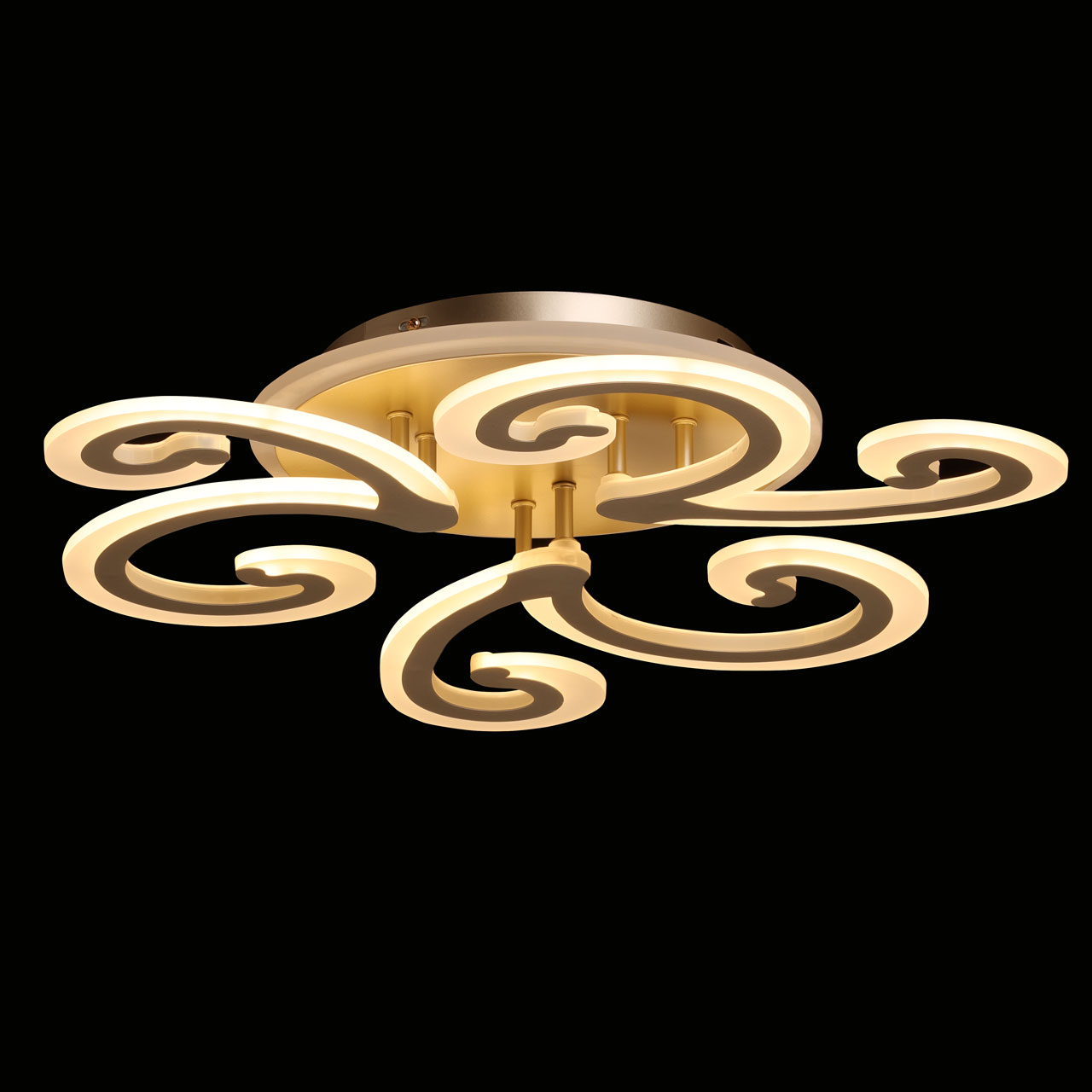 Металлическое основание потолочной люстры окрашено в цвет перламутрового золота. Корпус плафонов выполнен из сплава алюминия с цинком и окрашен в цвет основания. Светодиодные источники света закрыты белым матовым акрилом.