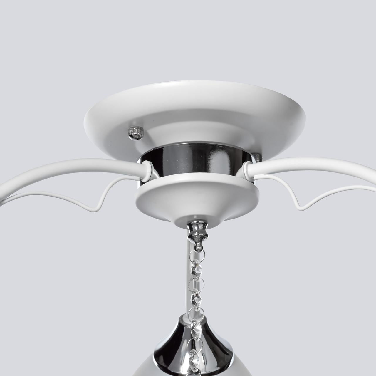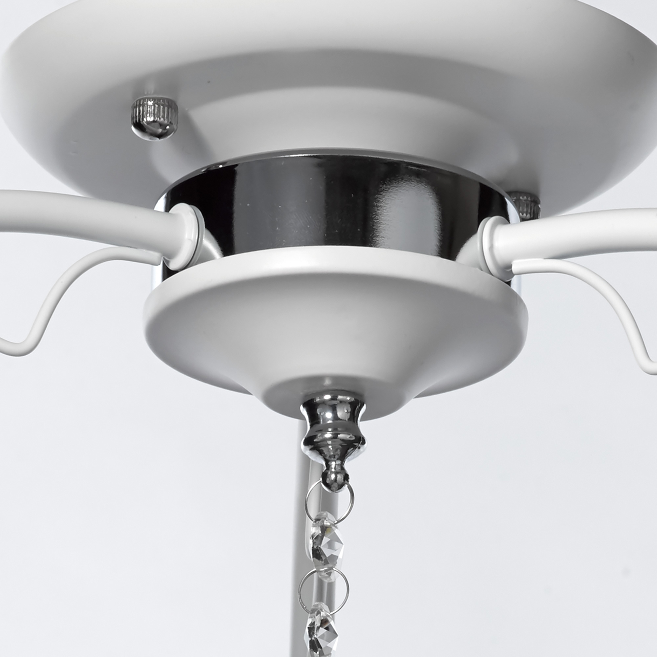 Основание светильника выполнено из металла и окрашено в белый цвет. Отдельные элементы основания гальванизированы в цвет хрома. Стеклянные матированные плафоны окрашены в белый цвет по трафарету. Светильник декорирован прозрачным хрусталем в форме шара.