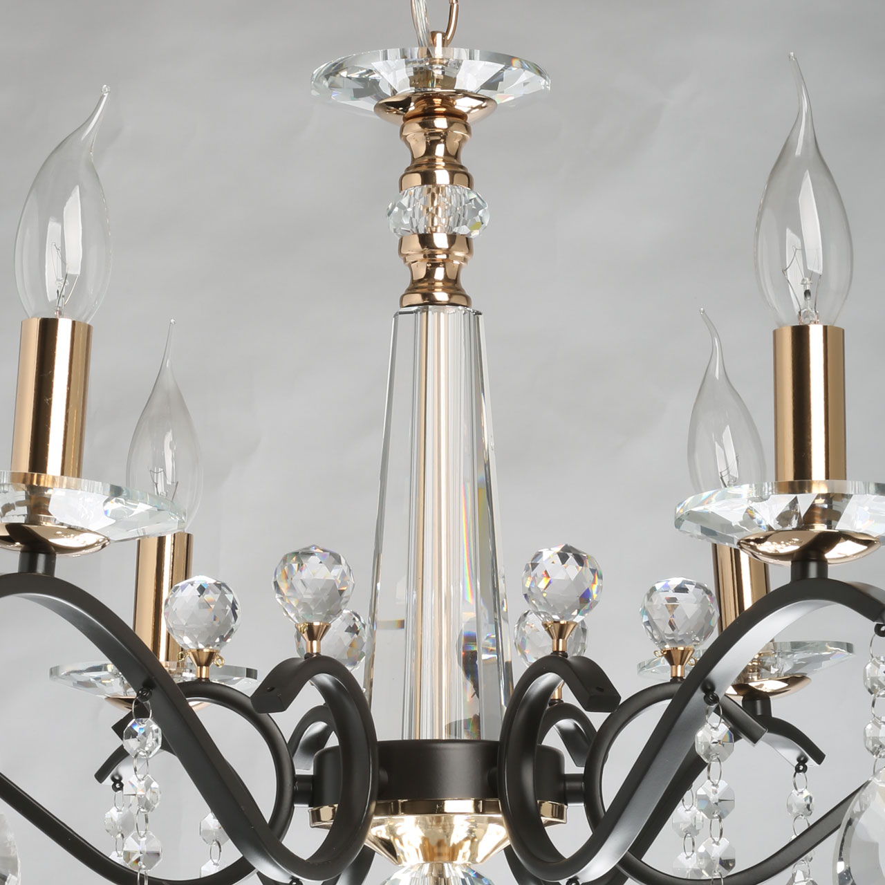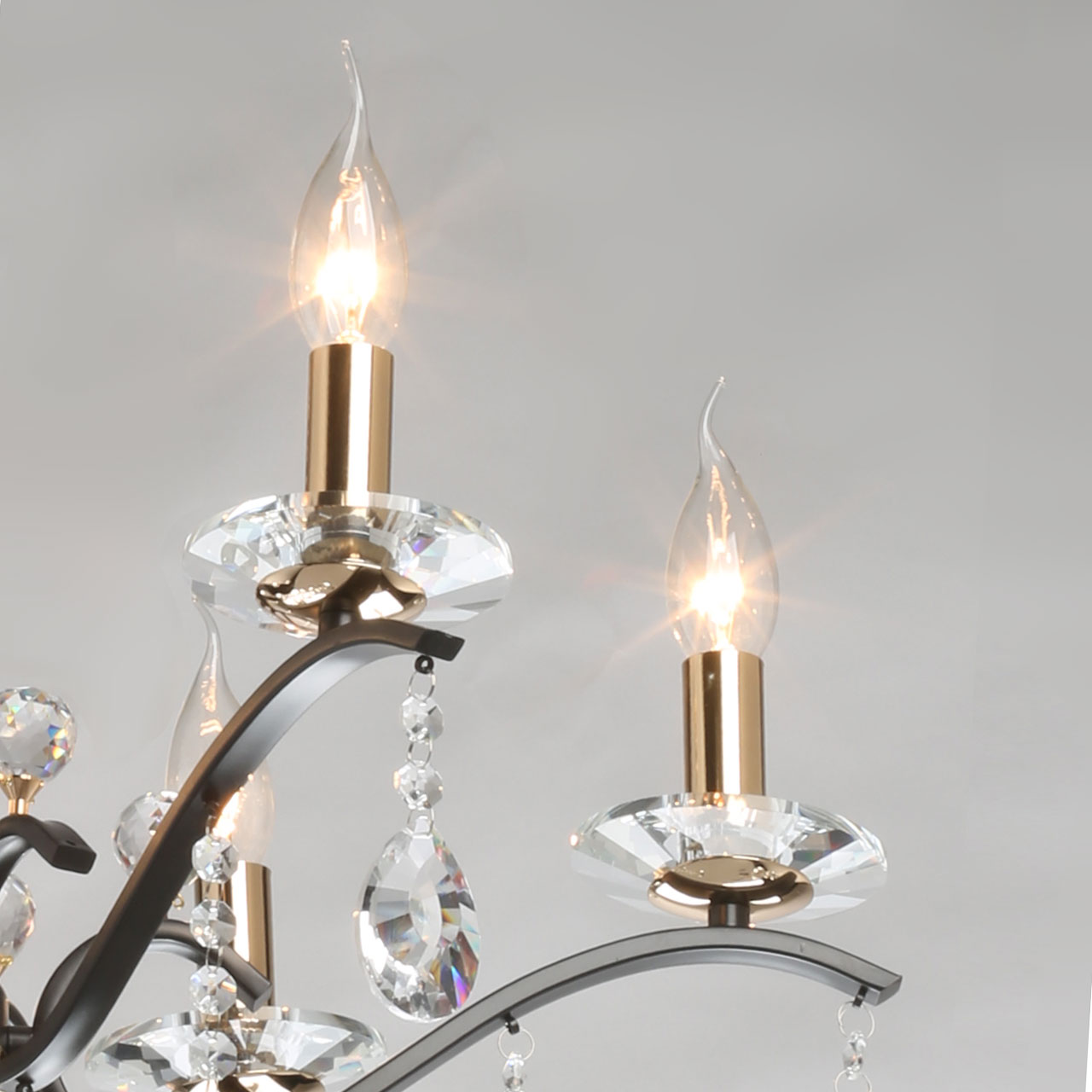 Металлическое основание потолочного светильника окрашено в цвет кофе. Отдельные элементы гальванизированы в цвет золота. Светильник декорирован прозрачным хрусталем.