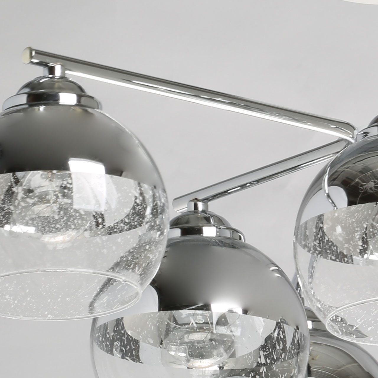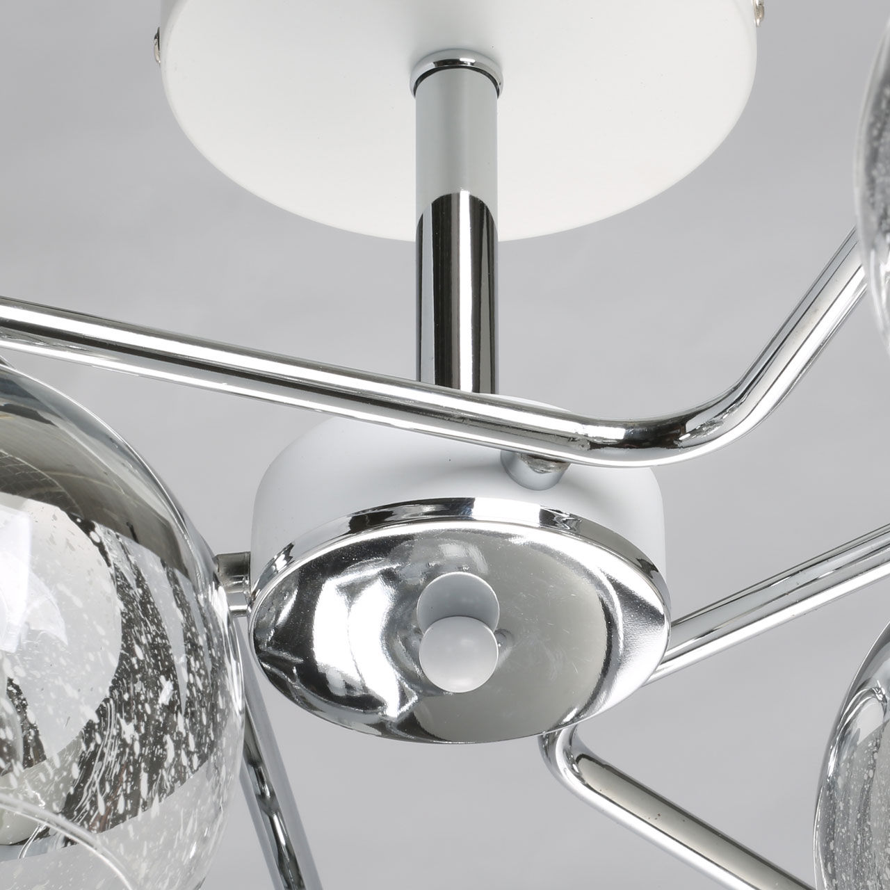 Металлическое основание потолочного светильника гальванизировано в цвет хрома. Потолочная чаша окрашена в белый цвет. Светильник декорирован прозрачными стеклянными плафонами, гальванизированными в цвет хрома у основания.
