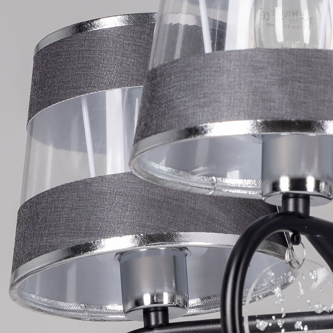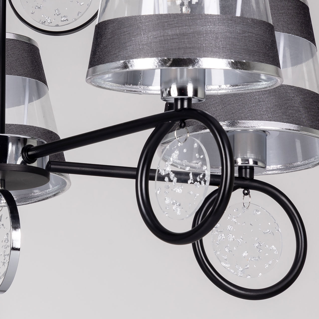 Металлическое основание подвесной люстры окрашено в черный цвет. Отдельные элементы основания гальванизированы в цвет хрома. Источники света закрыты текстильными абажурами с термостойким акрилом внутри. Текстиль абажуров в центре прозрачный, по краям черного цвета. Абажуры прошиты и отделаны кантом серебряного цвета. Подвесная люстра декорирована подвесками из акрила округлой формы.