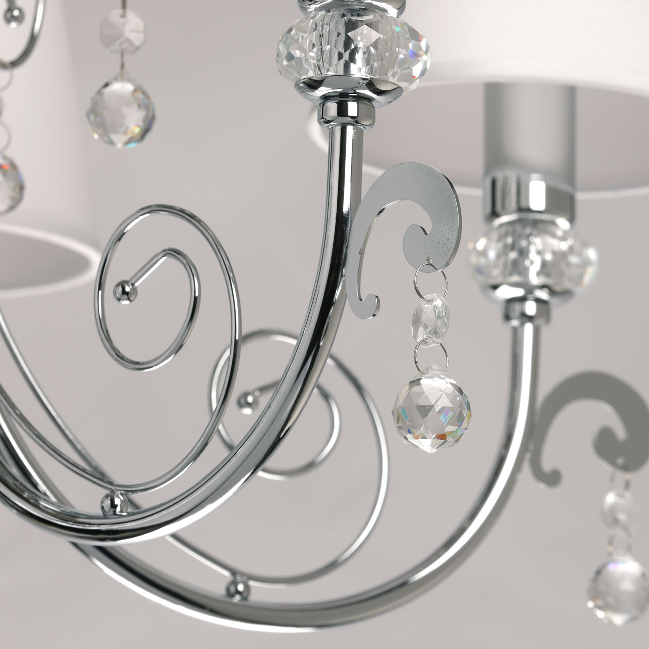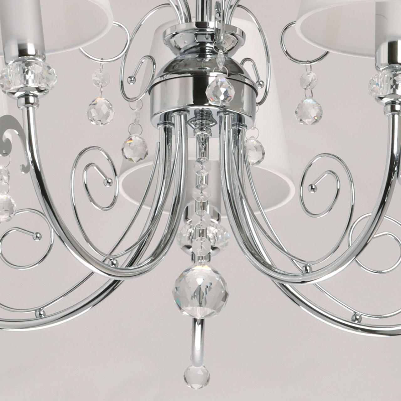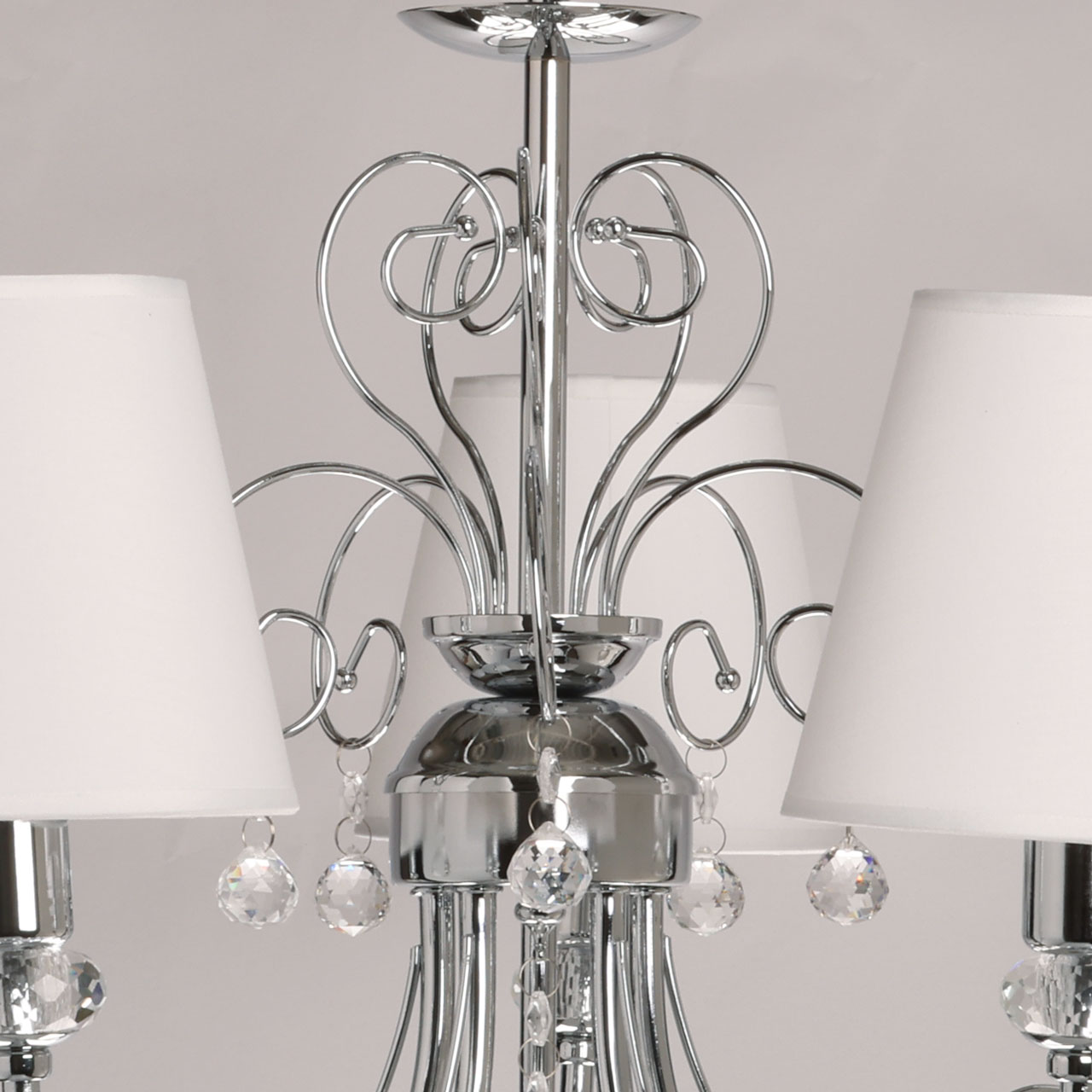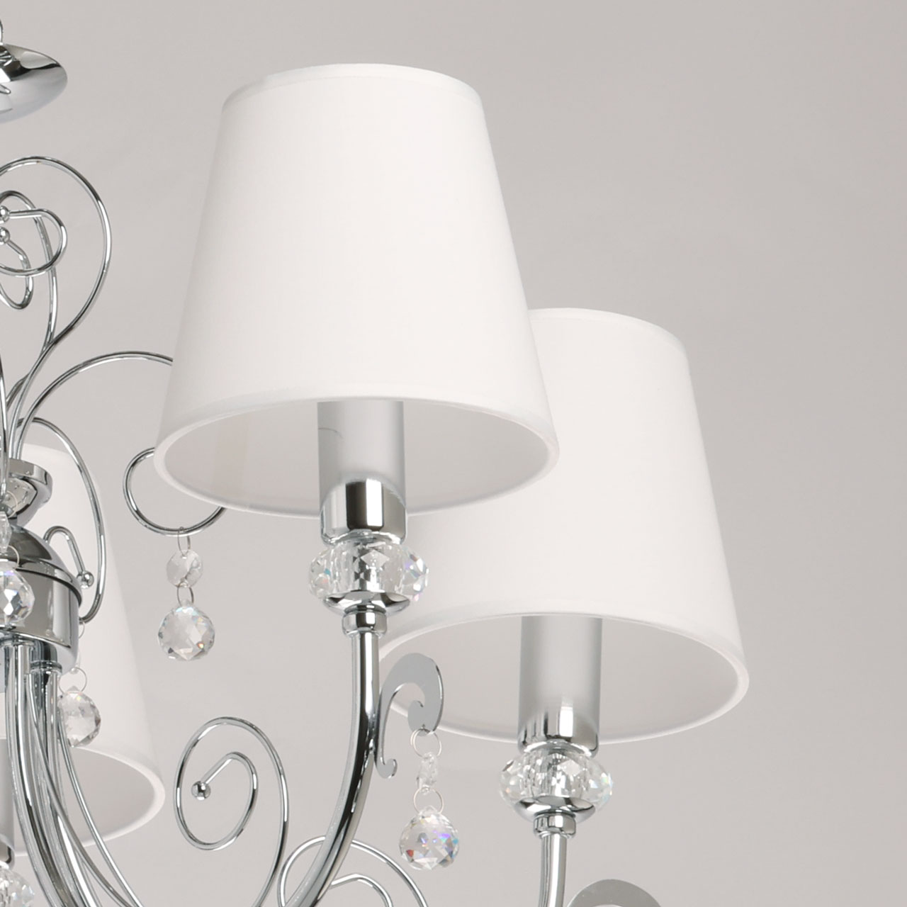 Металлическое основание подвесной люстры гальванизировано в цвет хрома. Источники света закрыты двухслойными текстильными абажурами белого цвета с термостойким акрилом внутри. Абажуры прошиты. Светильник декорирован прозрачным хрусталем.