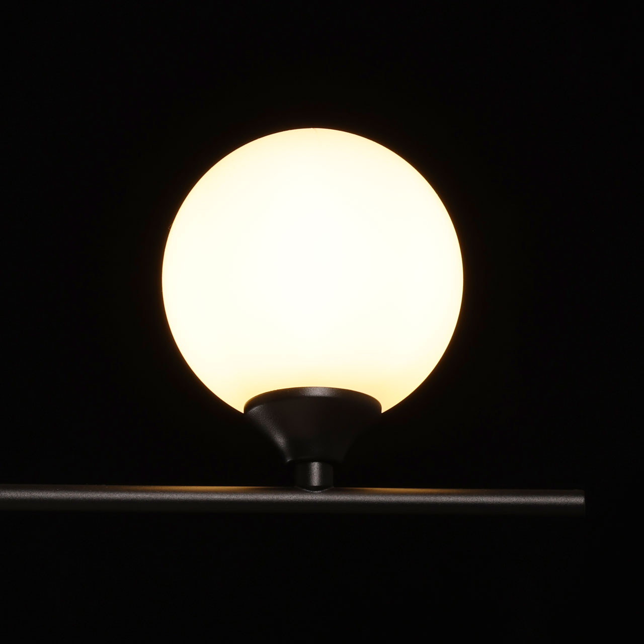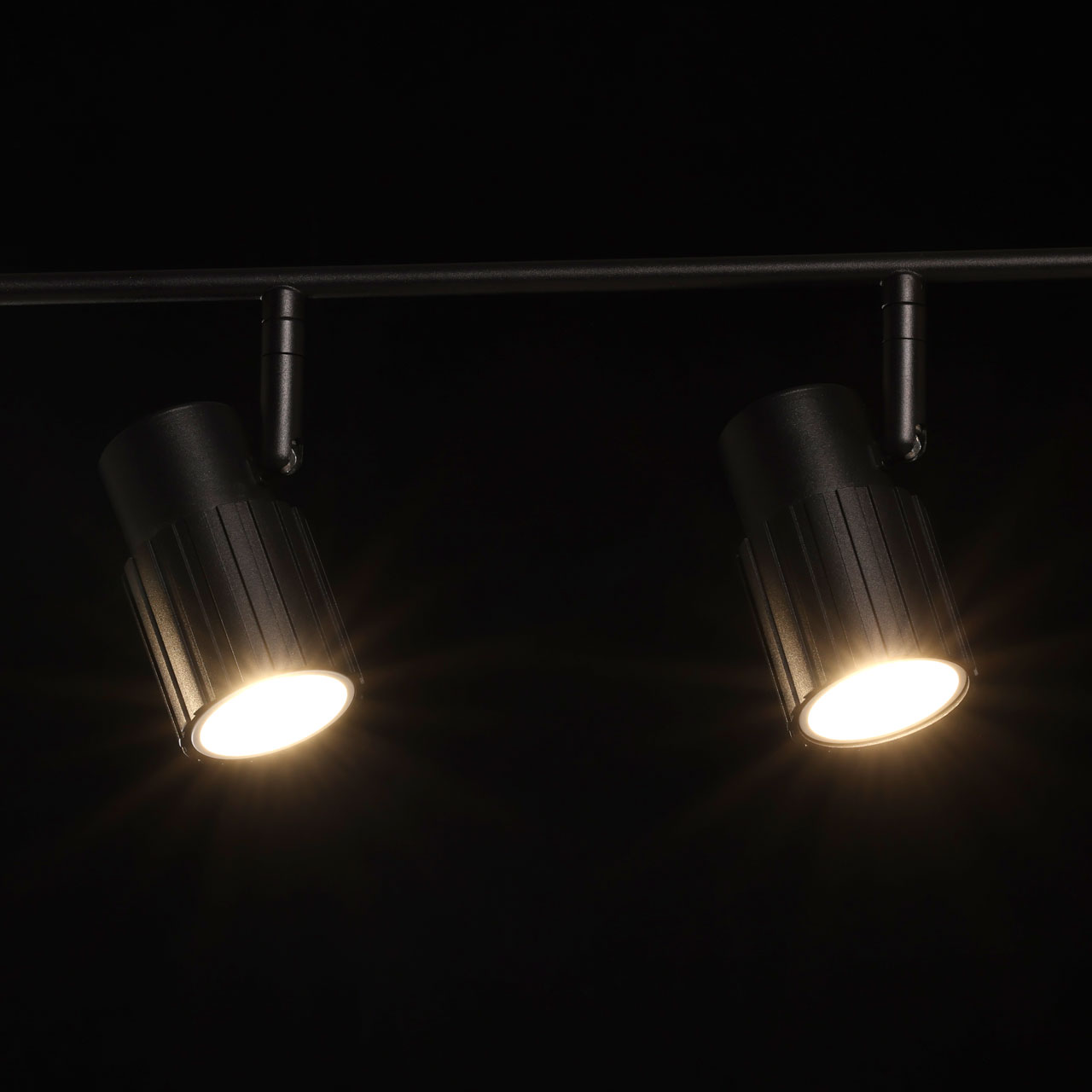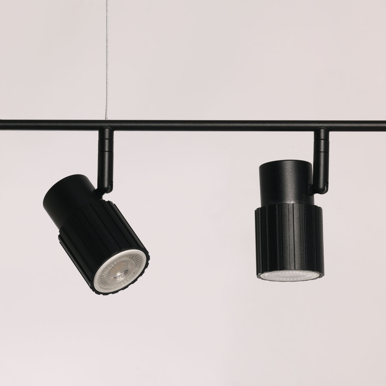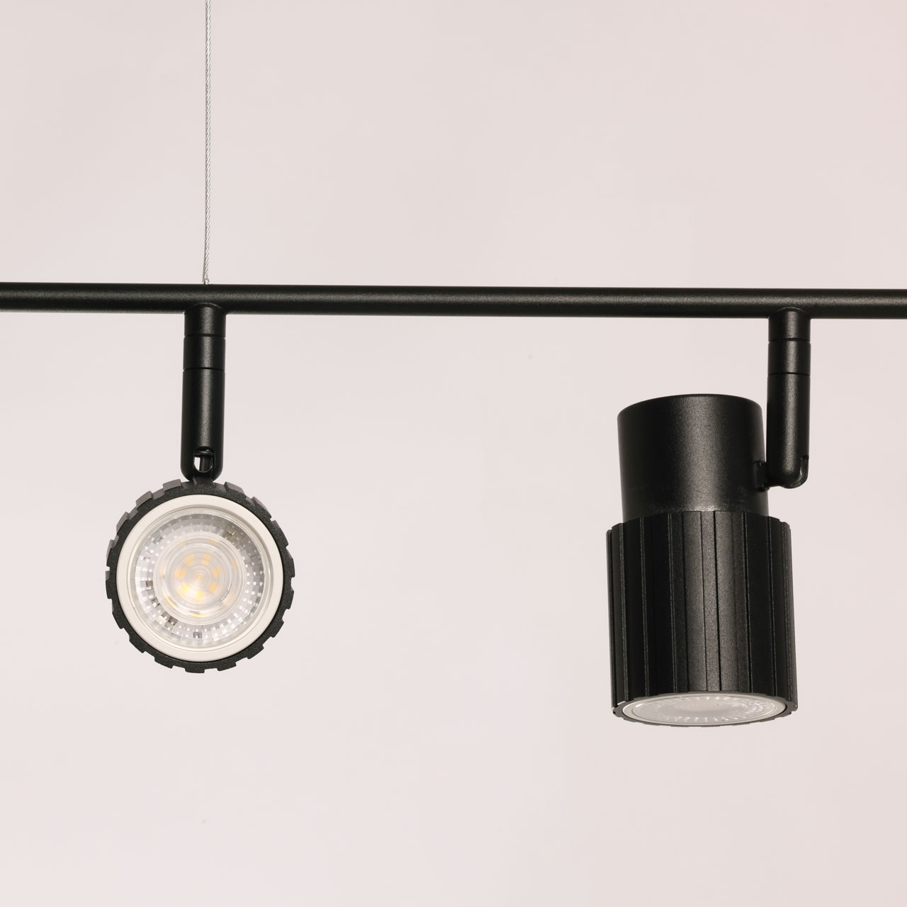 Металлическое основание подвесного светильника окрашено в черный цвет. Корпус плафонов спотов выполнен из сплава алюминия и окрашен в цвет основания. Светодиодный источник света закрыт декоративным плафоном из белого матового акрила.
