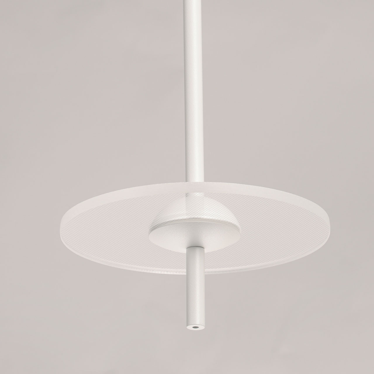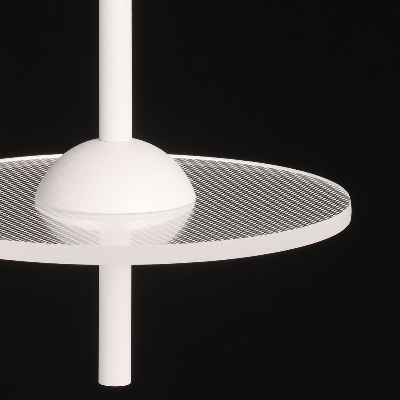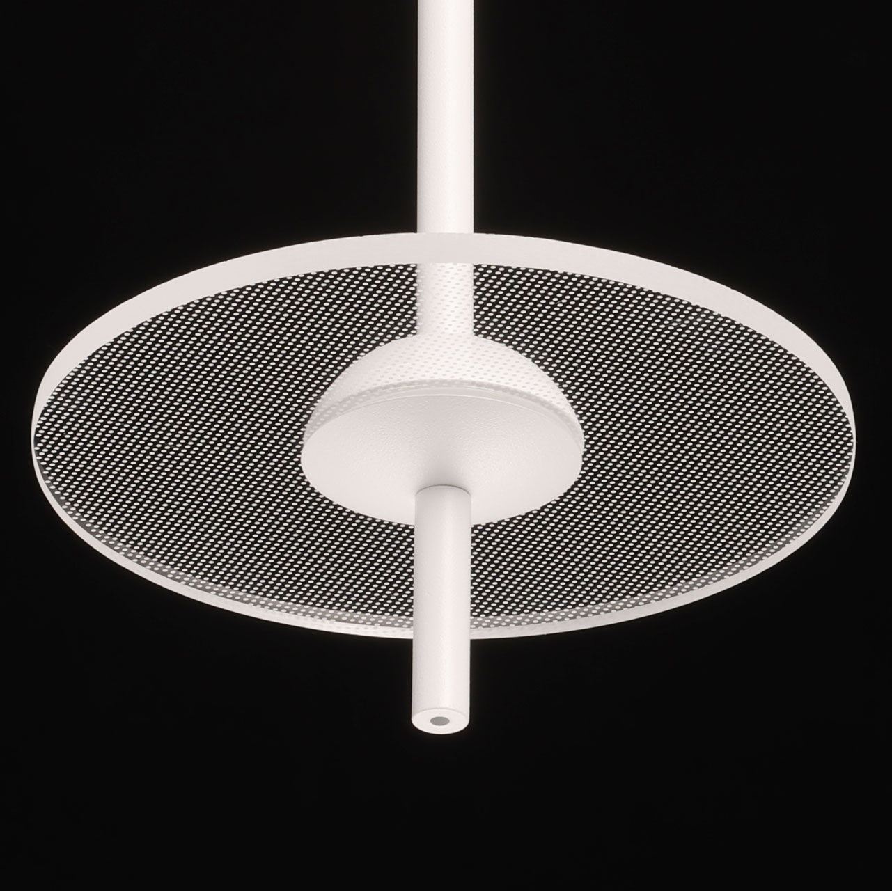 Металлическое основание подвеса обработано по технологии порошкового окрашивания в белый цвет. Плафон в виде диска выполнен из прозрачного акрила.