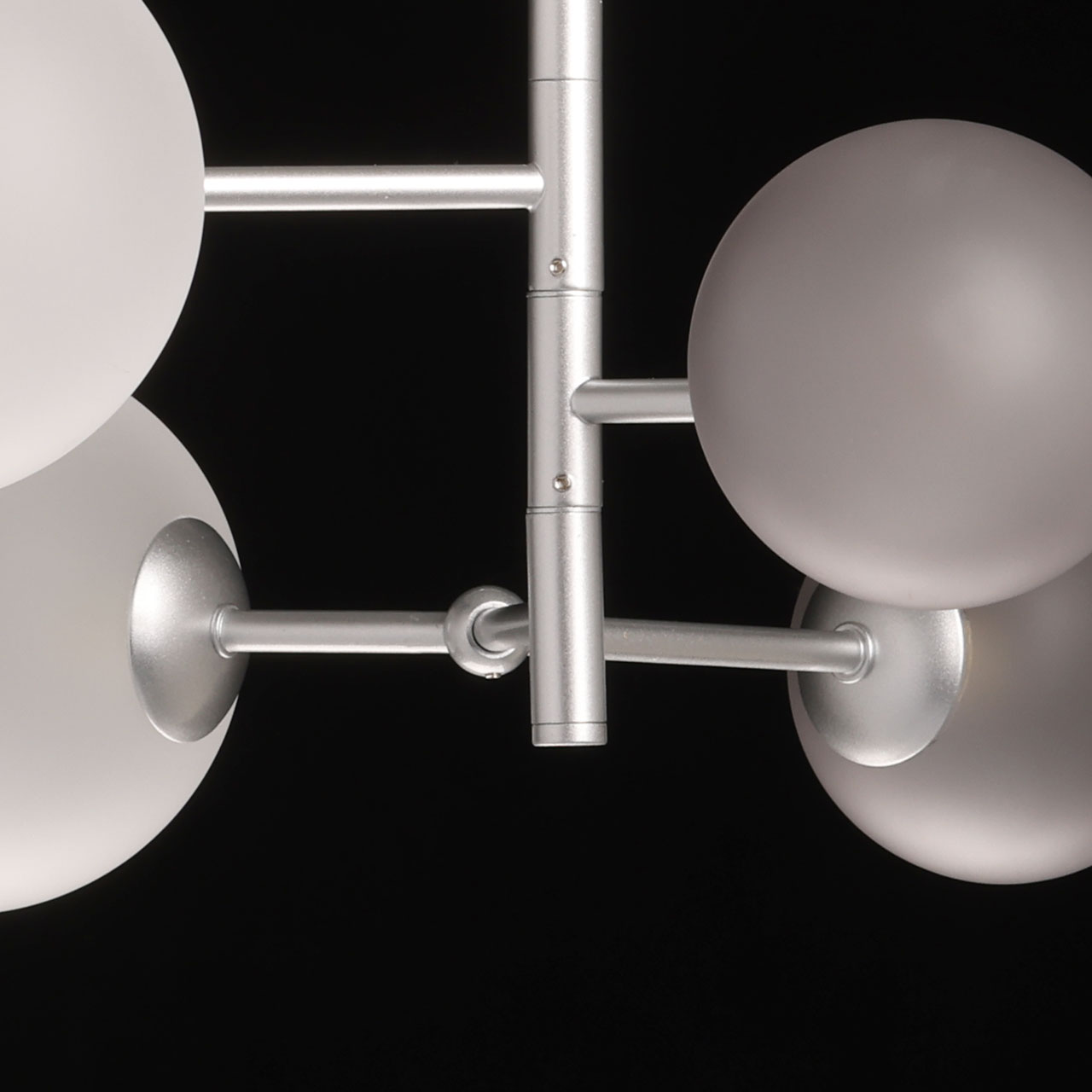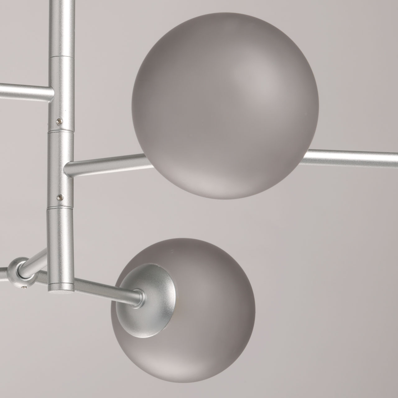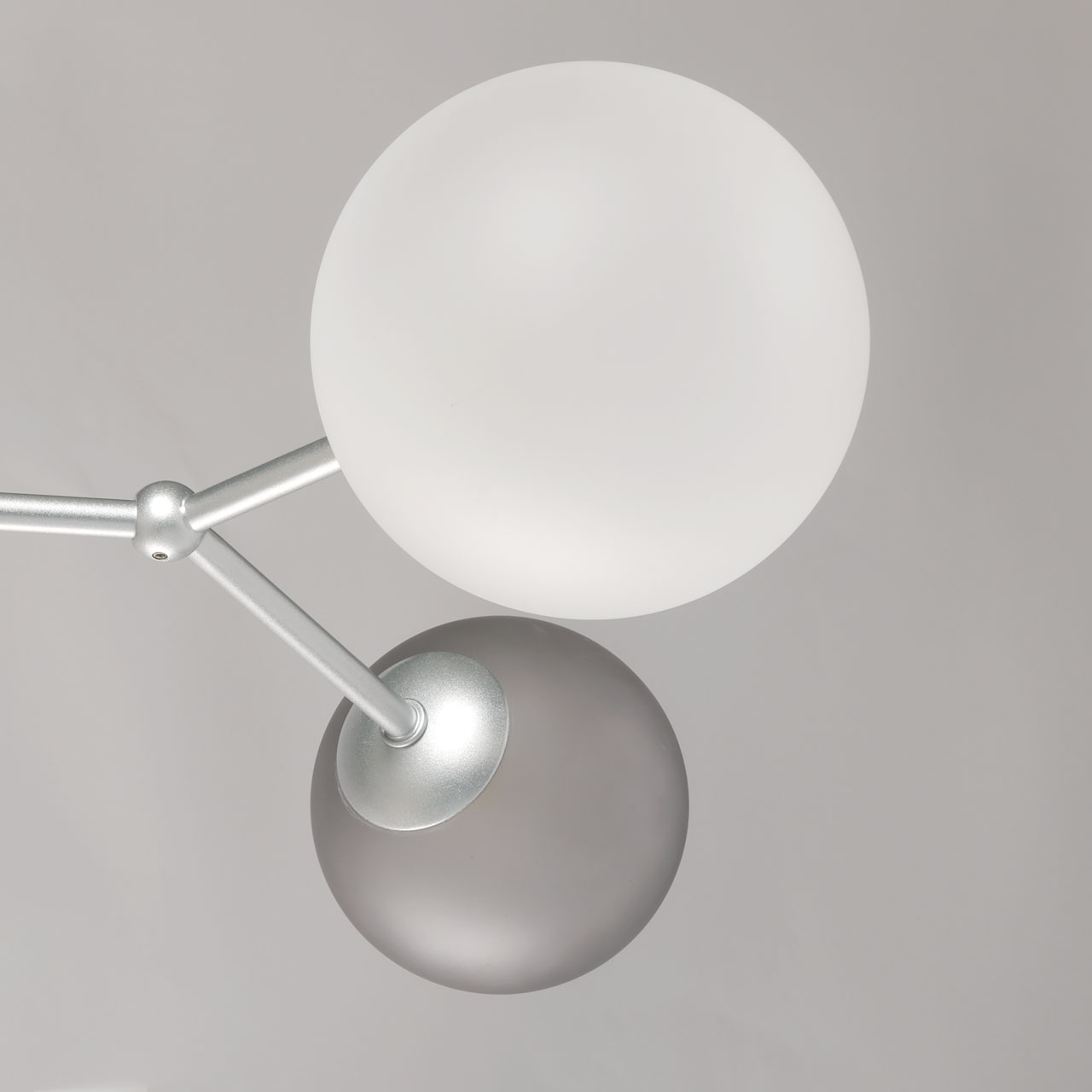 Металлическое основание люстры окрашено в цвет перламутрового серебра. Источники света закрыты стеклянными плафонами белого и дымчатого цвета.