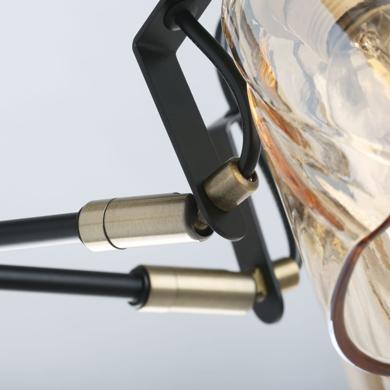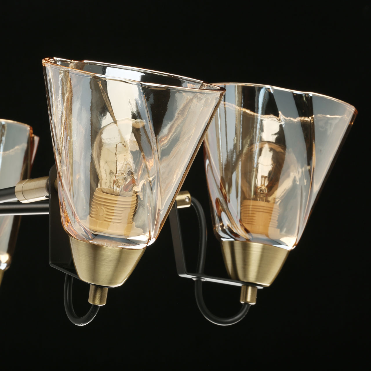 Металлическое основание на штанге окрашено в черный цвет. Отдельные элементы гальванизированы в цвет бронзы. Стеклянные плафоны отлиты в сложную форму и гальванизированы в цвет шампань.
