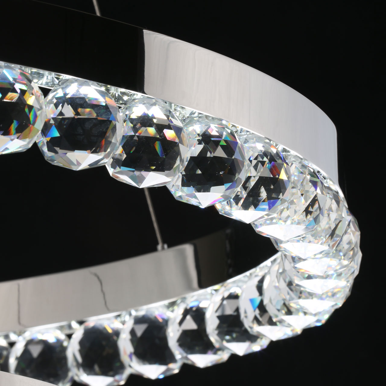 Металлическая потолочная чаша гальванизирована в цвет хрома. Корпус плафонов выполнен из нержавеющей стали, отполированной до зеркального блеска. Подвесная люстра декорирована прозрачным хрусталем в форме шаров.