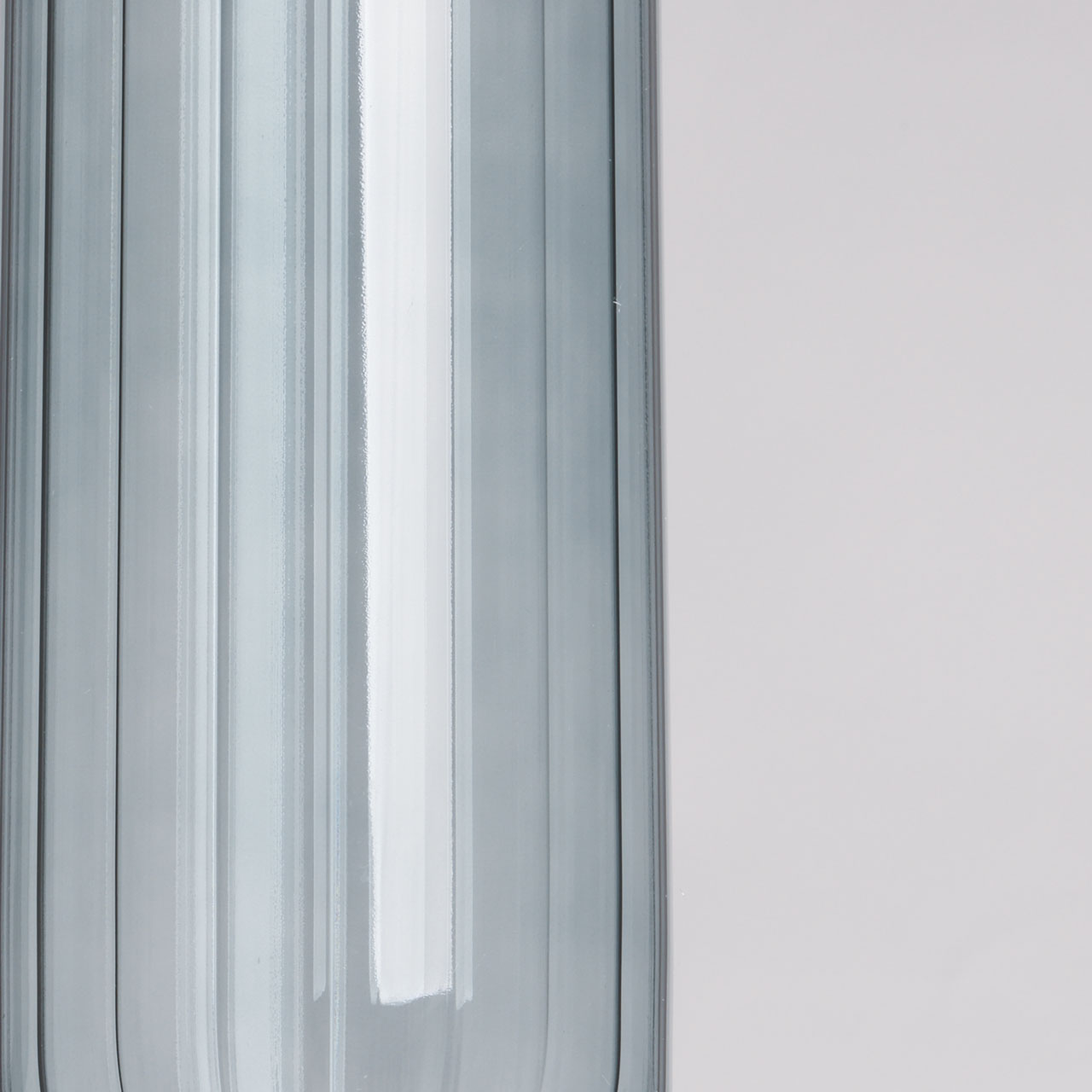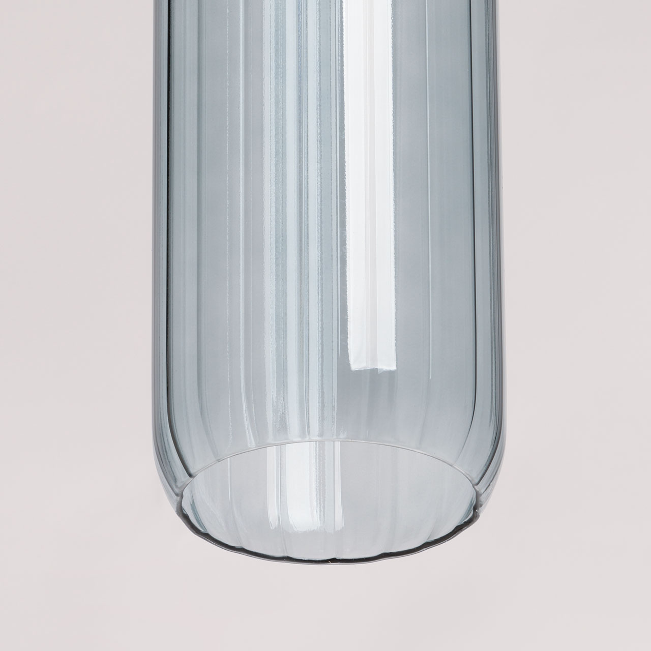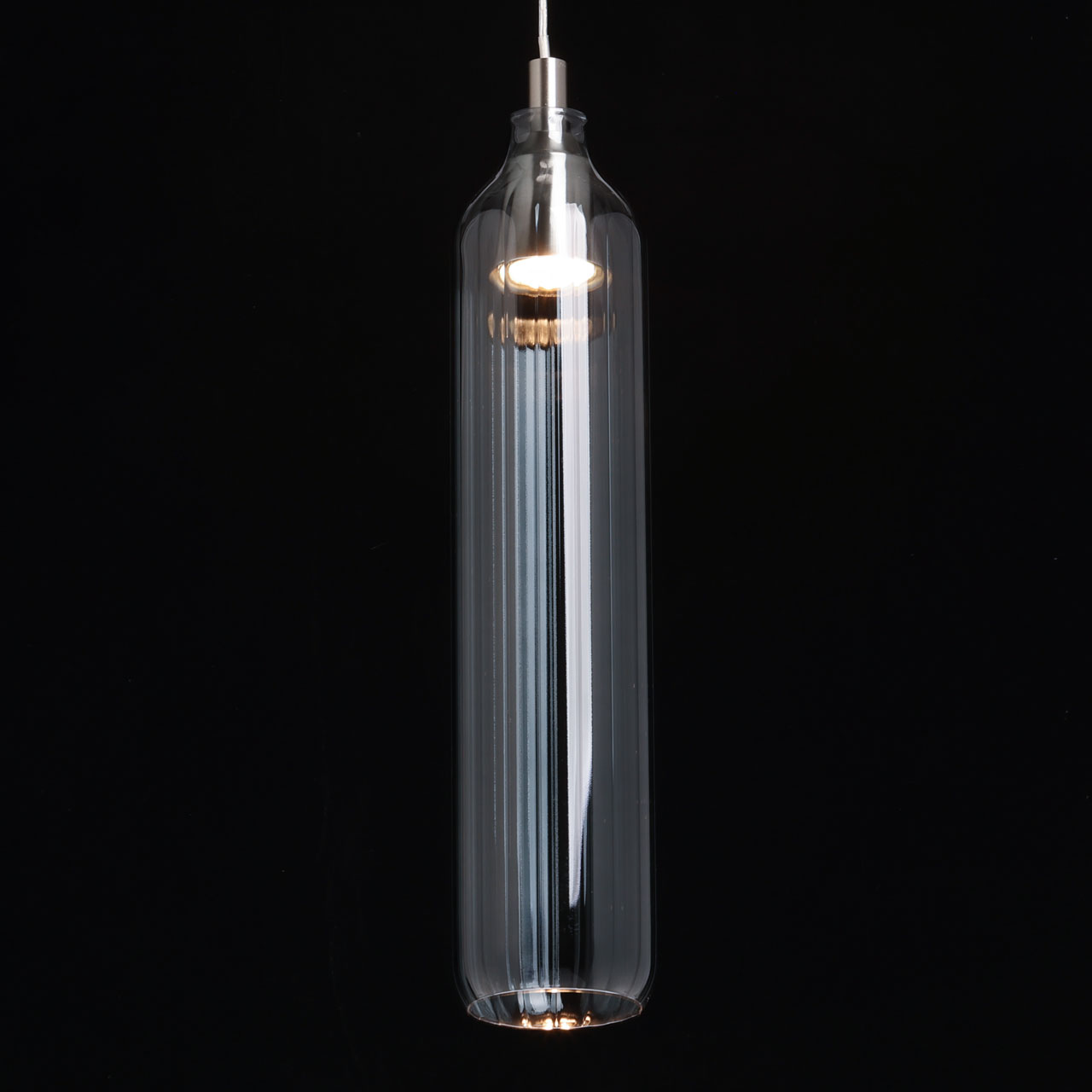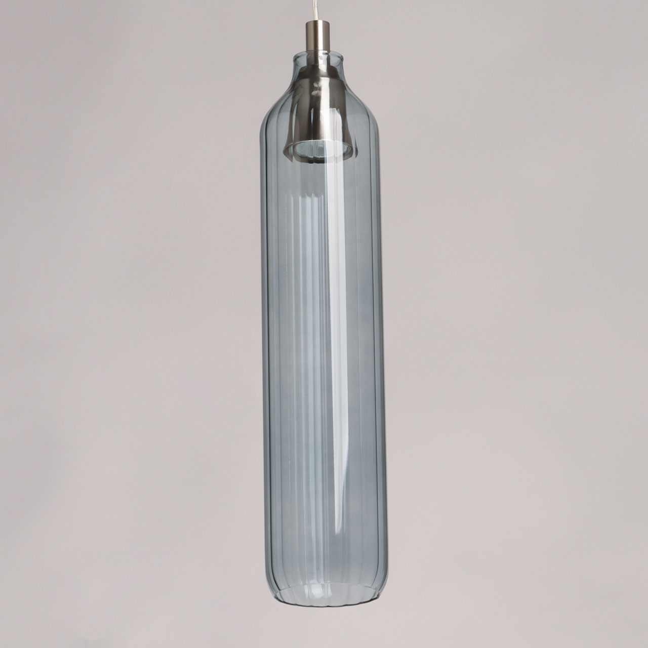Металлическое основание подвеса гальванизировано в цвет никеля. Плафон вытянутой формы отлит из стекла и гальванизирован в дымчатый цвет.