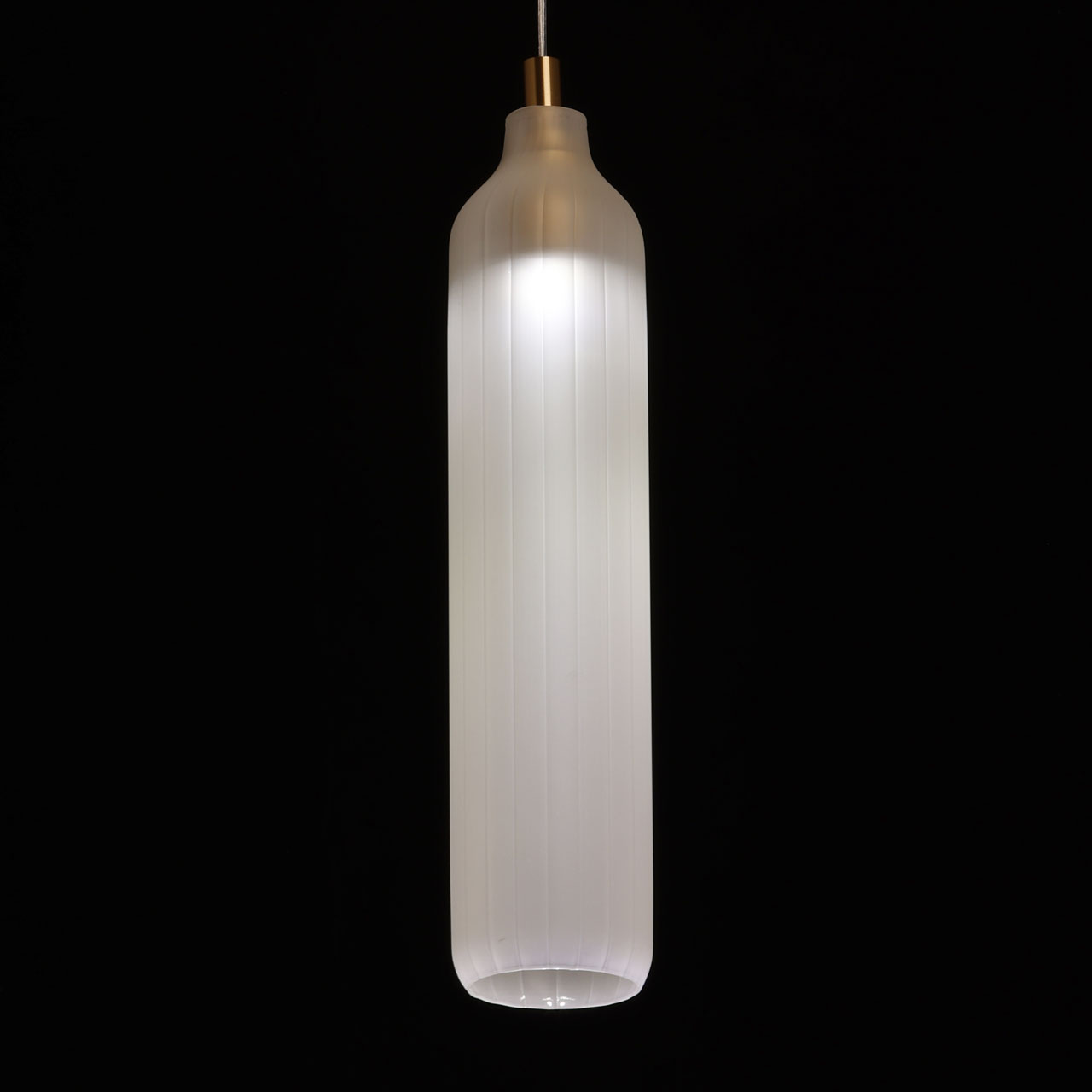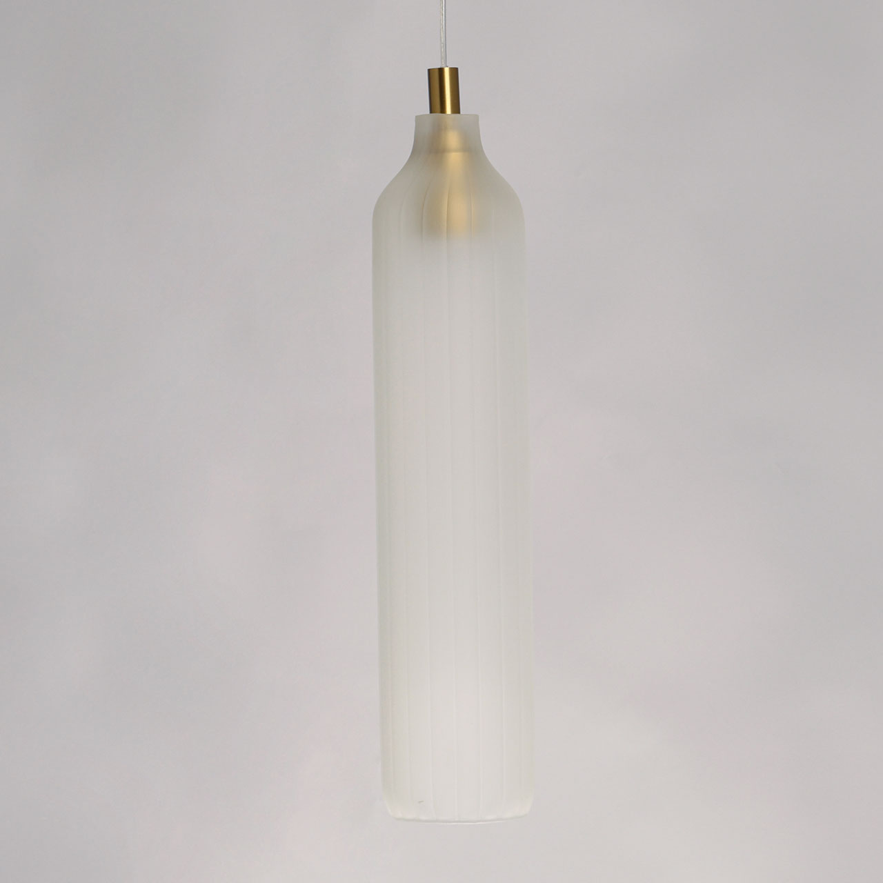 Металлическое основание подвеса гальванизировано в цвет латуни. Источник света закрыт плафоном вытянутой формы из матового фигурного стекла.