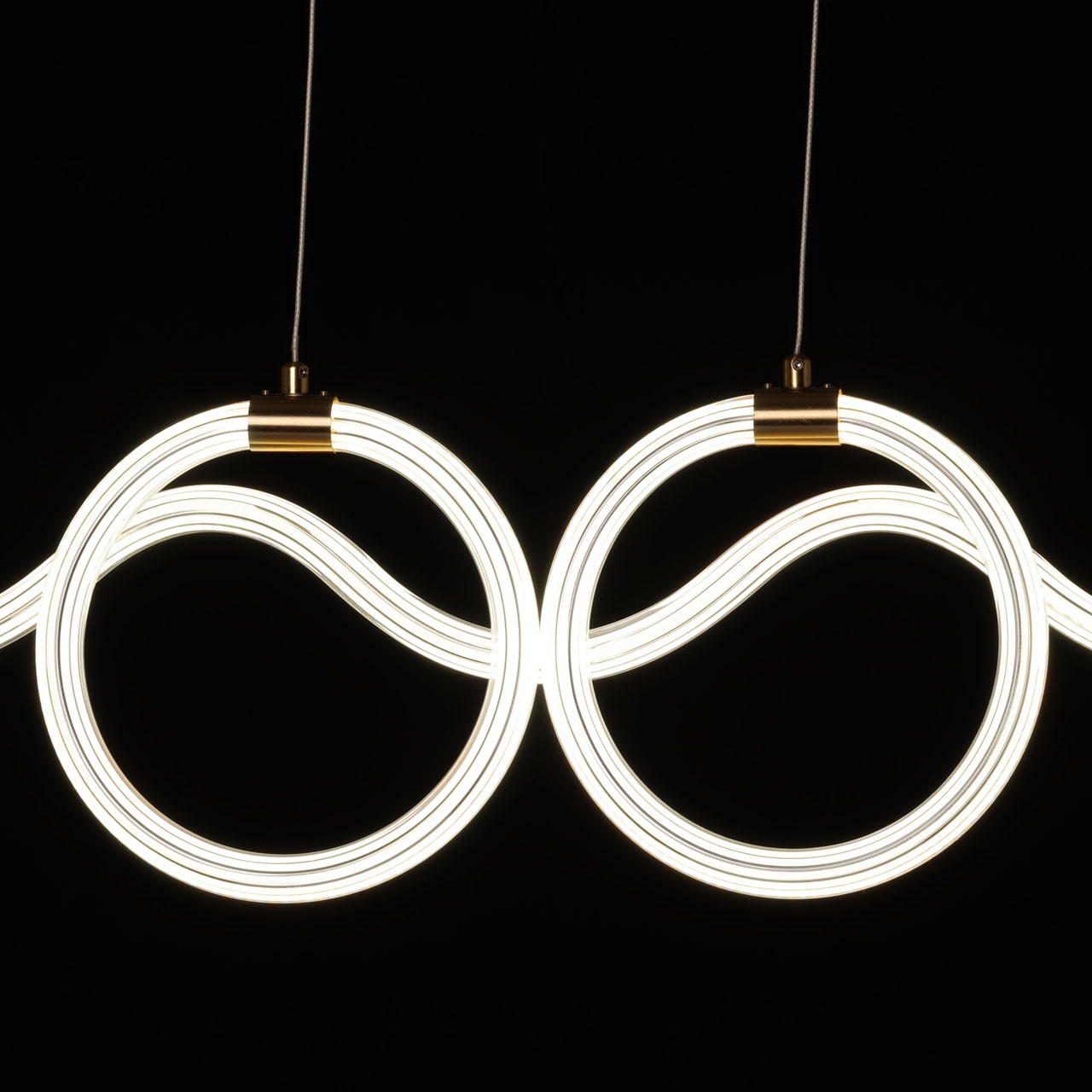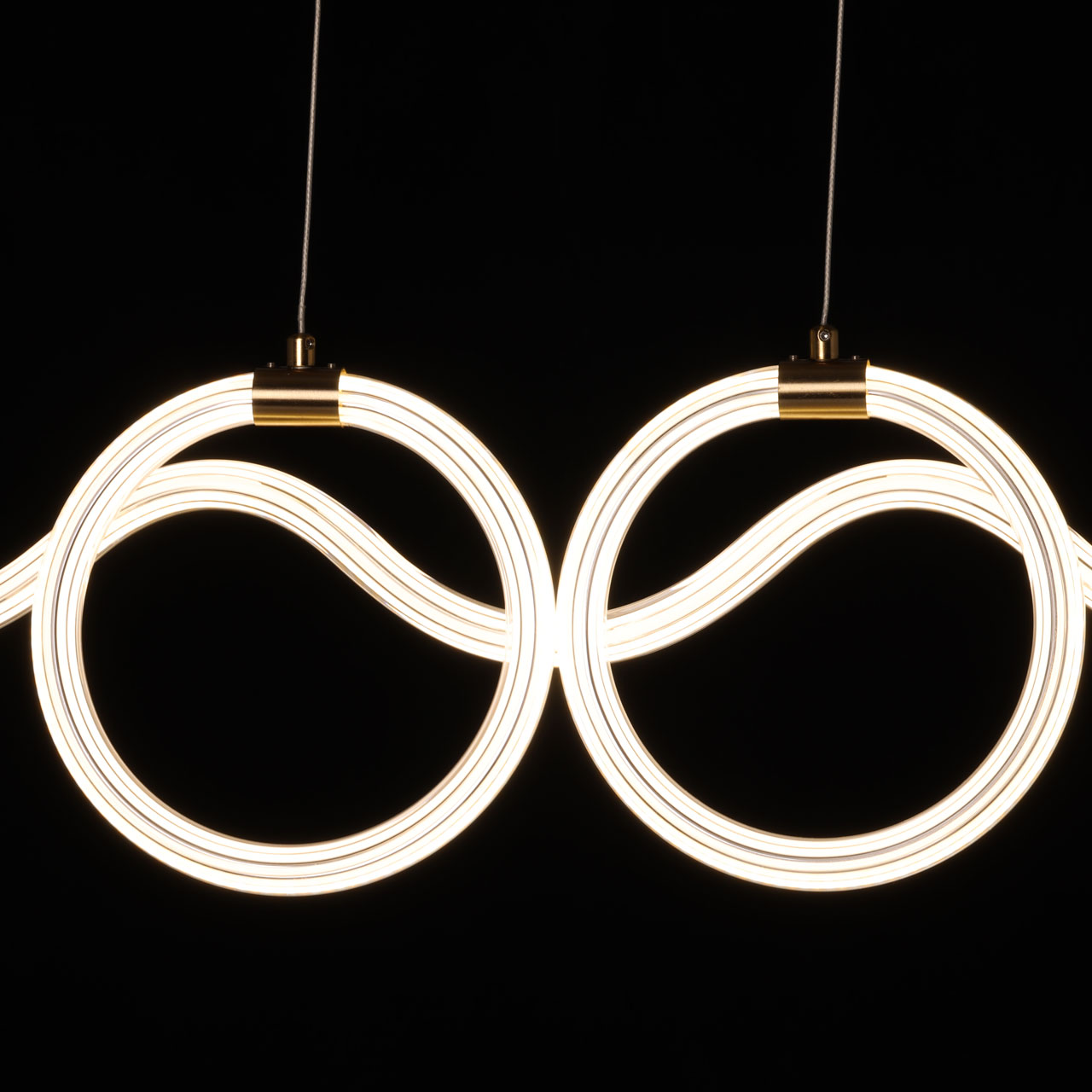 Металлическое основание подвесной люстры гальванизировано в цвет латуни. Светодиодные источники света закрыты белым матовым силиконом, заключенным в плафон из прозрачного акрила с линейным рисунком.