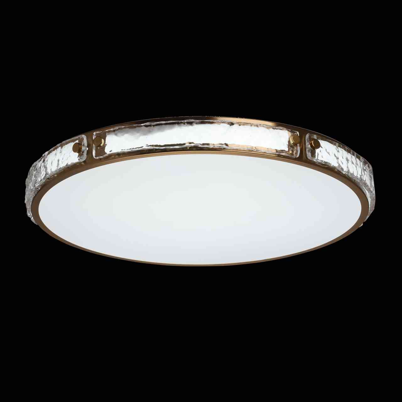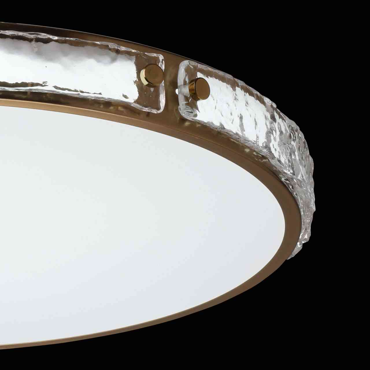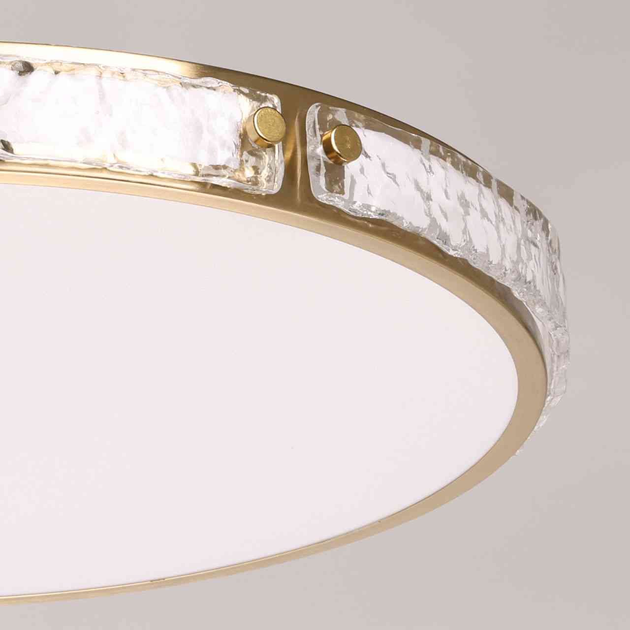 Металлическое основание потолочной люстры гальванизировано в цвет латуни. Светодиодный источник света закрыт белым матовым акрилом. Плафон люстры декорирован прозрачным фактурным стеклом.