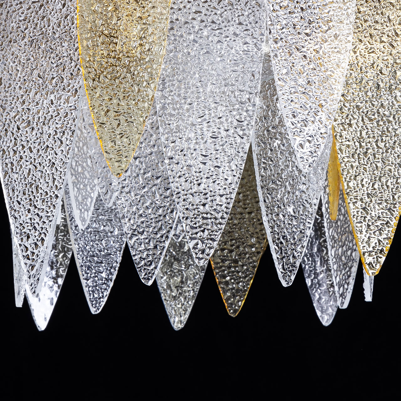 Металлическое основание подвесного светильника гальванизировано в цвет латуни. Люстра декорирована фактурными стеклянными пластинами прозрачными и цвета шампань.