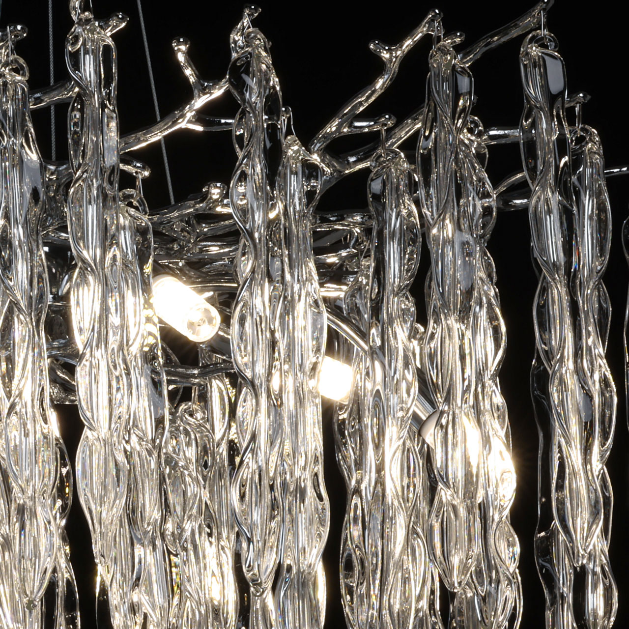 Основание подвесной люстры выполнено по технологии художественного литья из сплава алюминия с цинком и гальванизировано в цвет хрома. Потолочная чаша закрыта фактурным художественным литьем. Люстра декорирована подвесами из прозрачного стекла оригинальной формы.