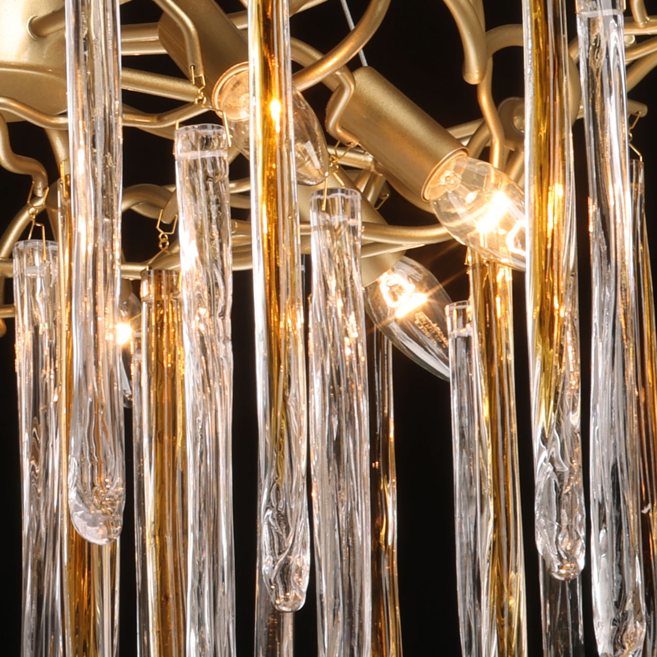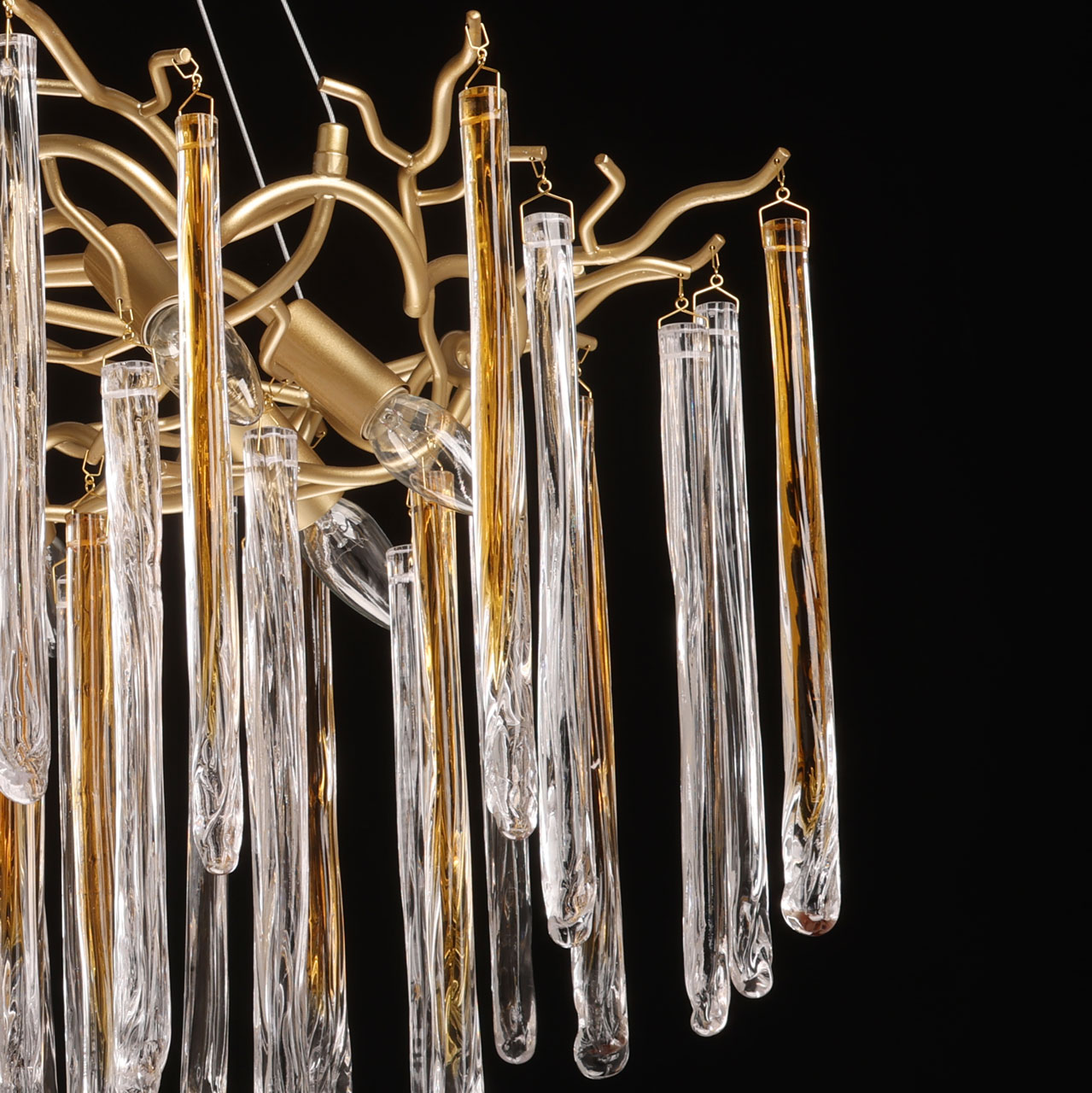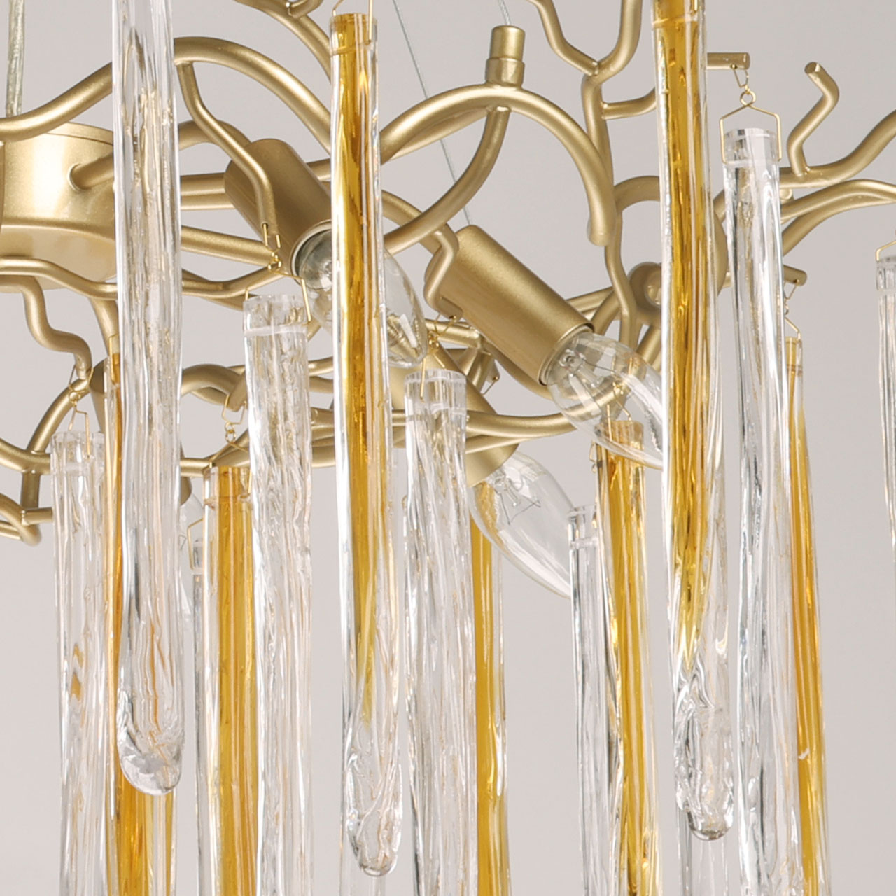 Металлическое основание подвесной люстры окрашено в цвет перламутрового золота. Люстра декорирована прозрачными стеклянными подвесками и подвесками, окрашенными в цвет карамели.