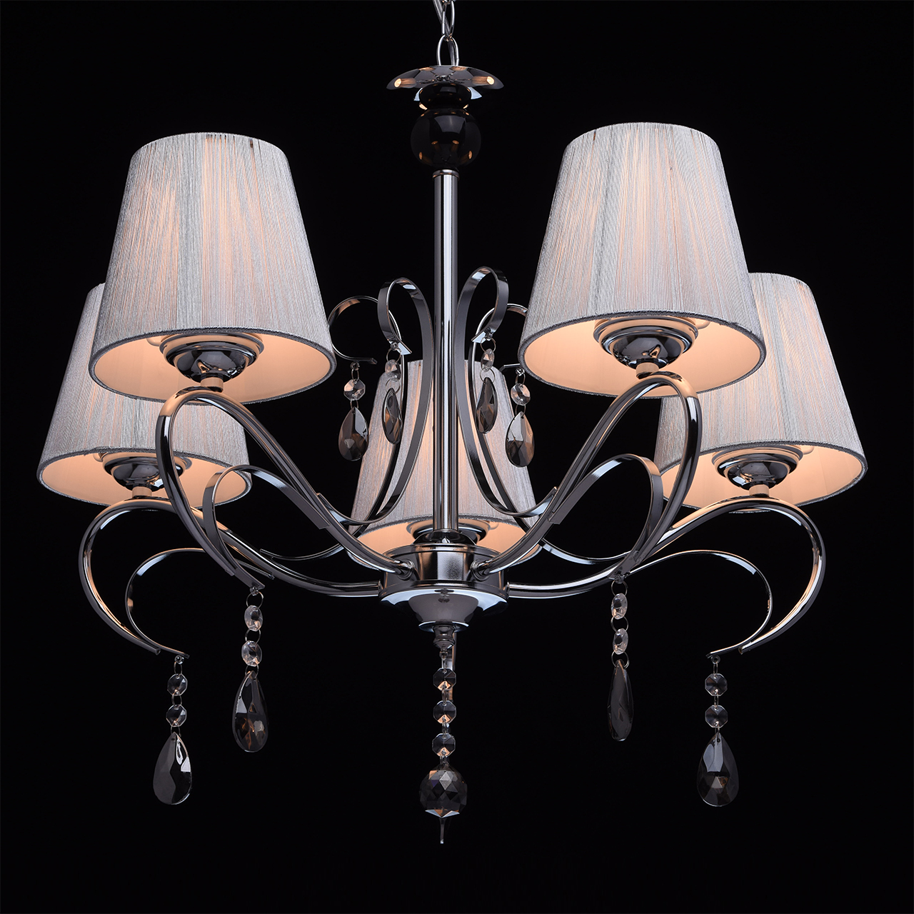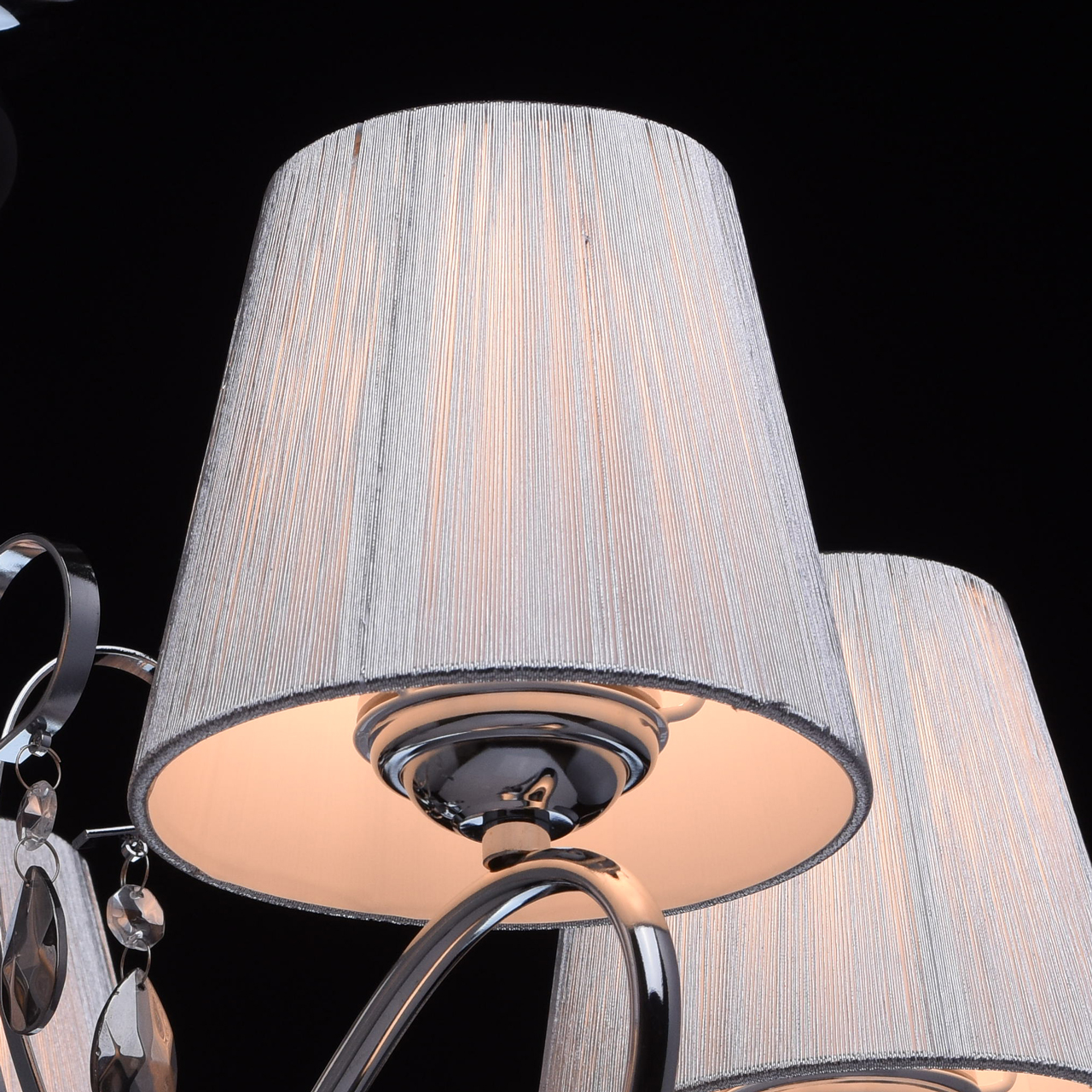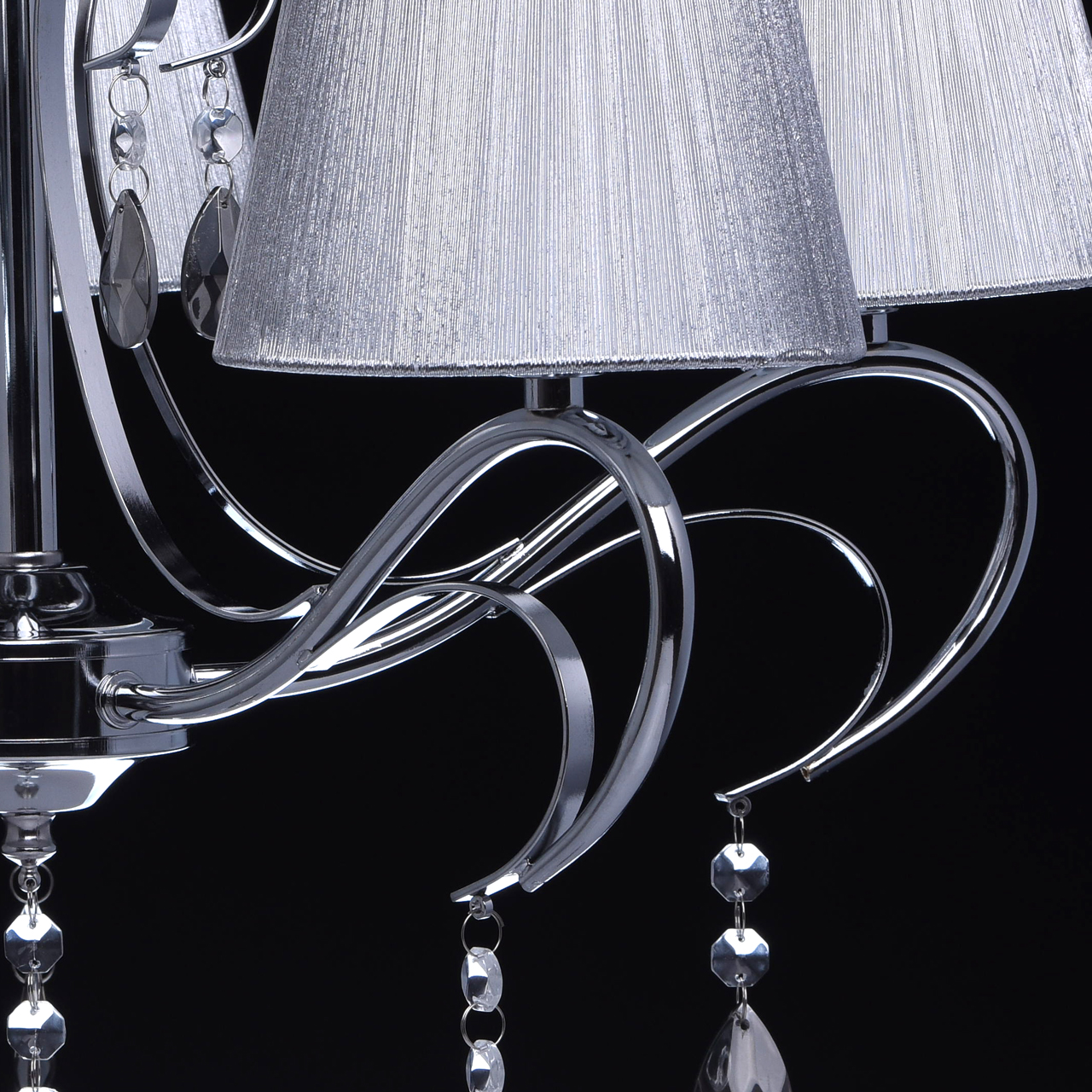 Основание светильника выполнено из металла и гальванизировано в цвет хрома. Рожки и декоративные элементы изящно изогнуты по технологии проката на роликовом станке. Центральный стержень светильника декорирован массивом из хрустального стекла, окрашенного в массе в черный цвет. Абажуры: выполнены из текстильных нитей стального цвета с термостойким акрилом внутри.Декор: подвески из прозрачного и гальванизированного в цвет антрацит декоративного стекла.