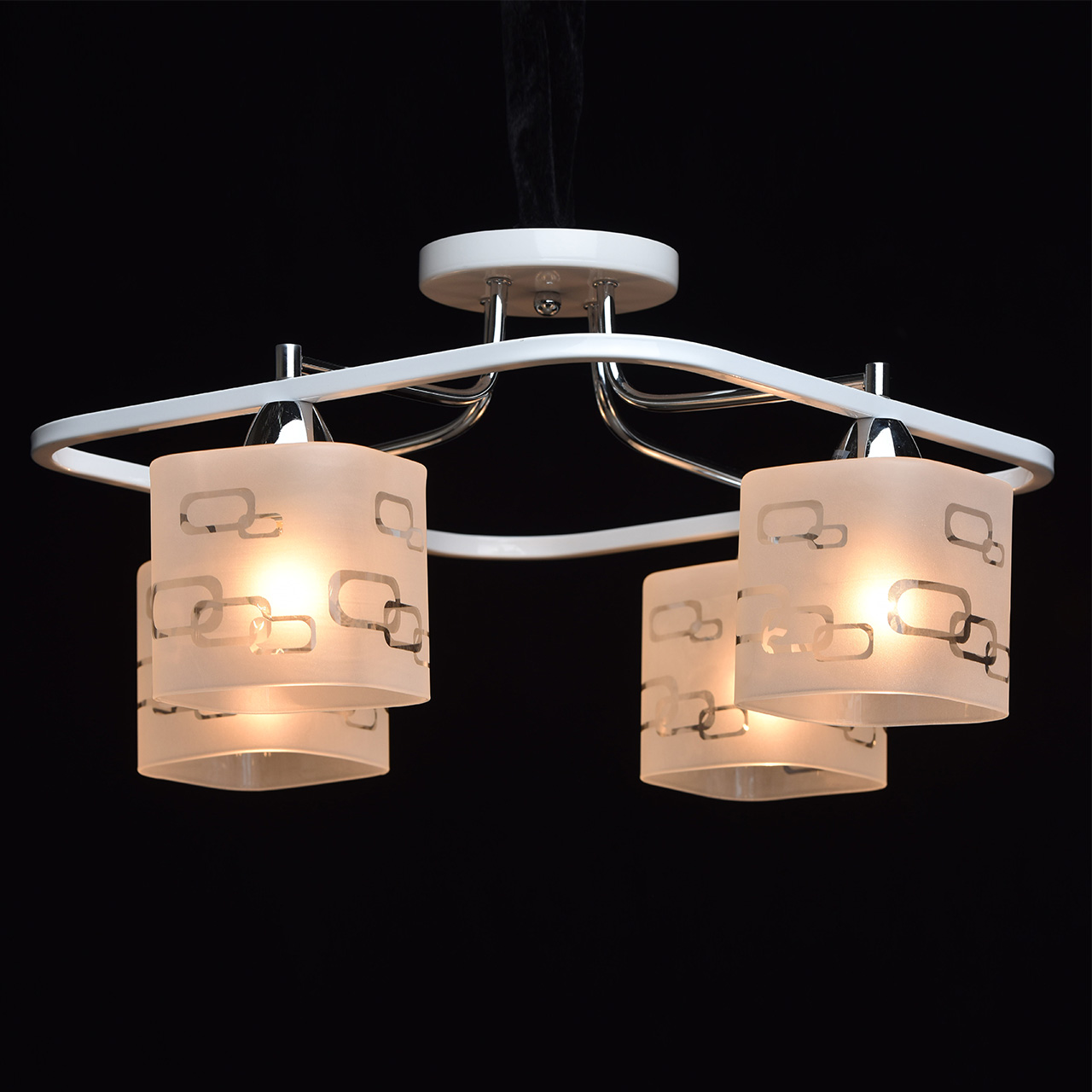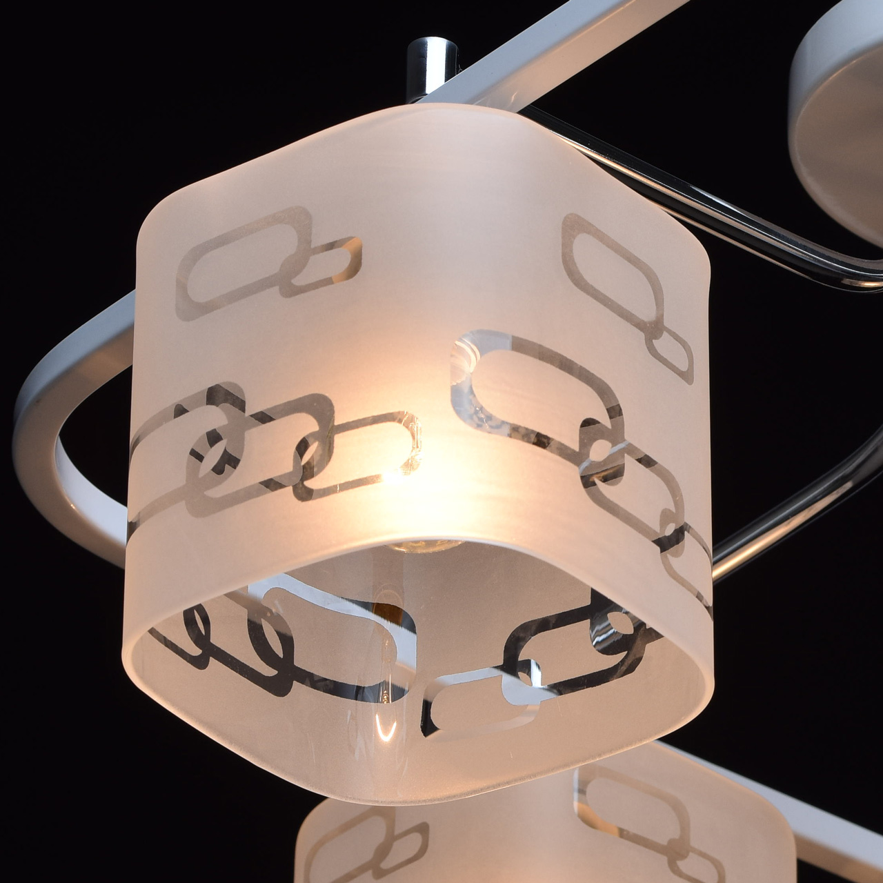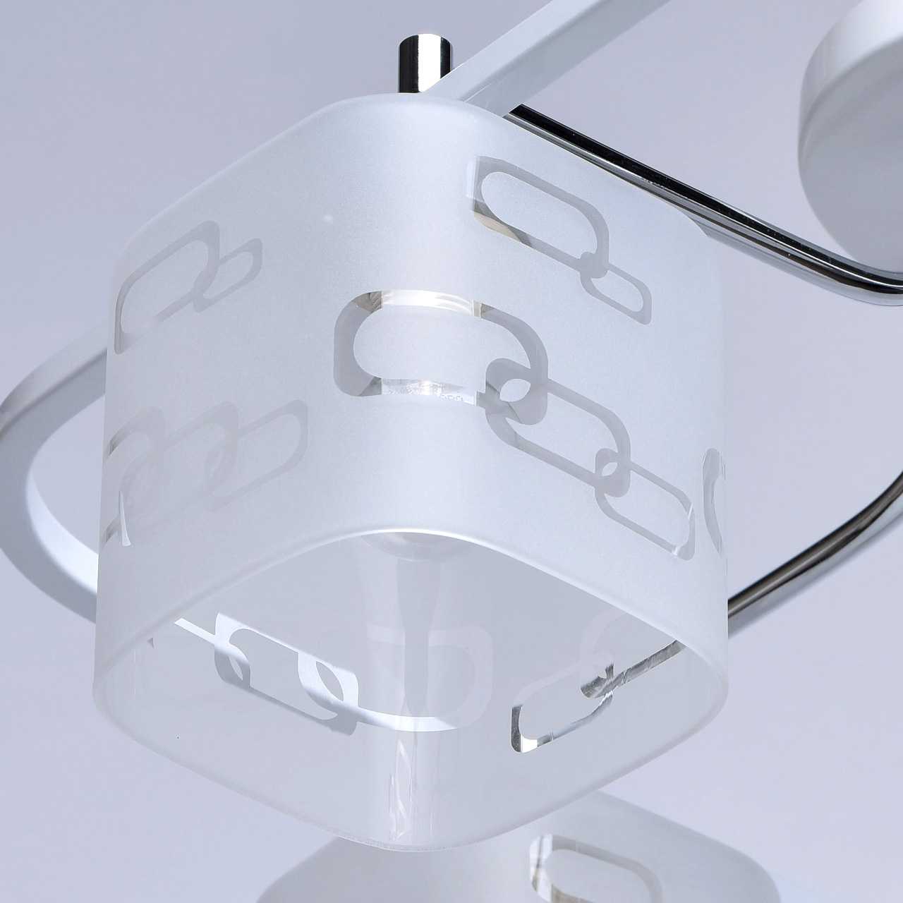 Арматура светильника выполнена из сплава железа. Рожки гальванизированы в цвет хрома. Основание и декоративный квадратный элемент окрашены в белый глянцевый цвет. Светильник декорирован стеклянными плафонами, обработанными по технологии пескоструйного матирования по шаблону. Края плафонов обработаны по технологии оплавления.