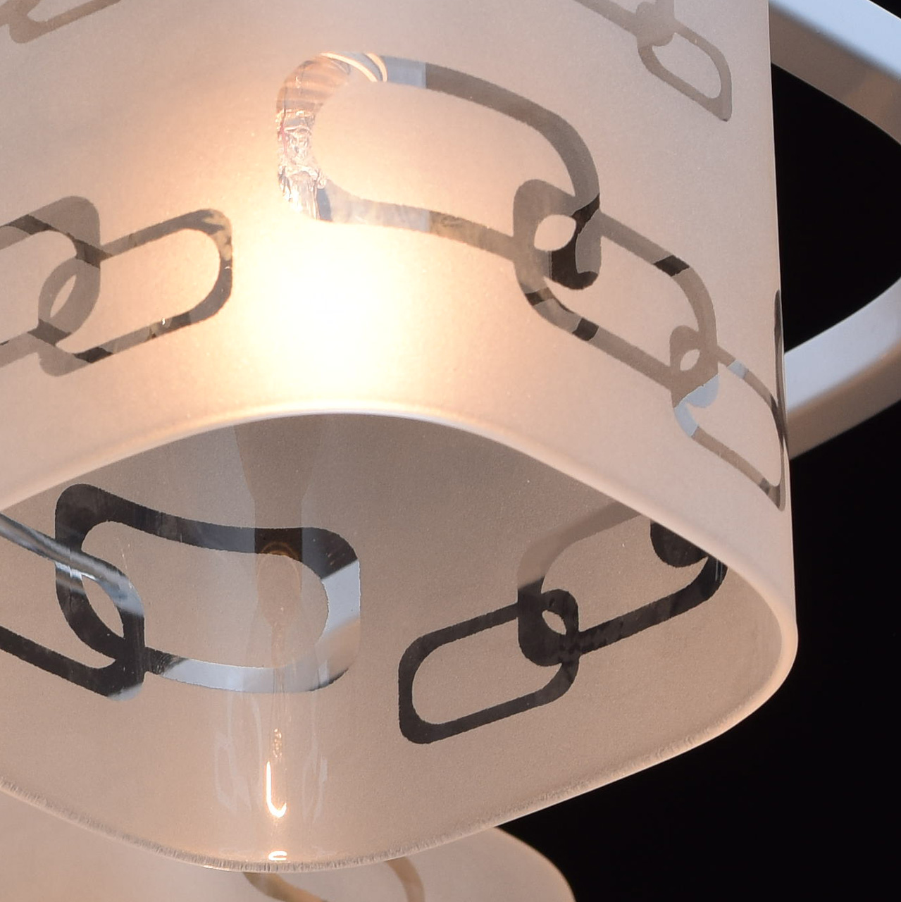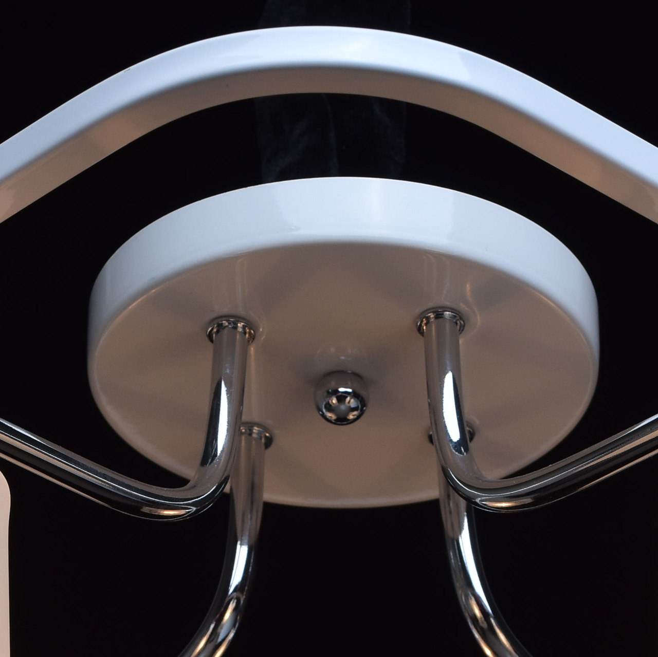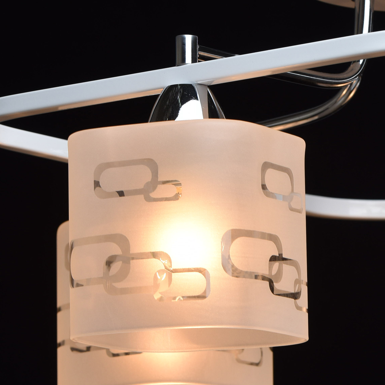 Арматура светильника выполнена из сплава железа. Рожки гальванизированы в цвет хрома. Основание и декоративный квадратный элемент окрашены в белый глянцевый цвет. Светильник декорирован стеклянными плафонами, обработанными по технологии пескоструйного матирования по шаблону. Края плафонов обработаны по технологии оплавления.