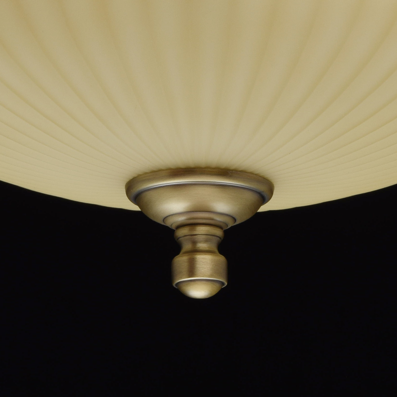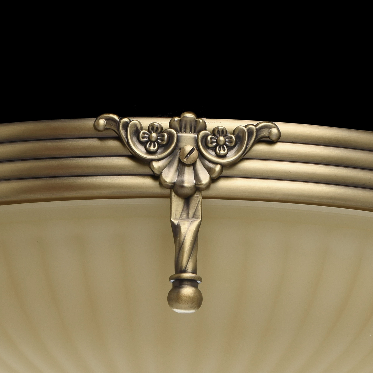 Корпус светильника выполнен из сплава железа и гальванизирован в цвет античной бронзы с эффектом патинирования. Плафон из стекла, окрашенного в массе в цвет ванили, отлит по сложной форме и матирован. Центральный плафон декорирован художественным литьем из сплава алюминия.