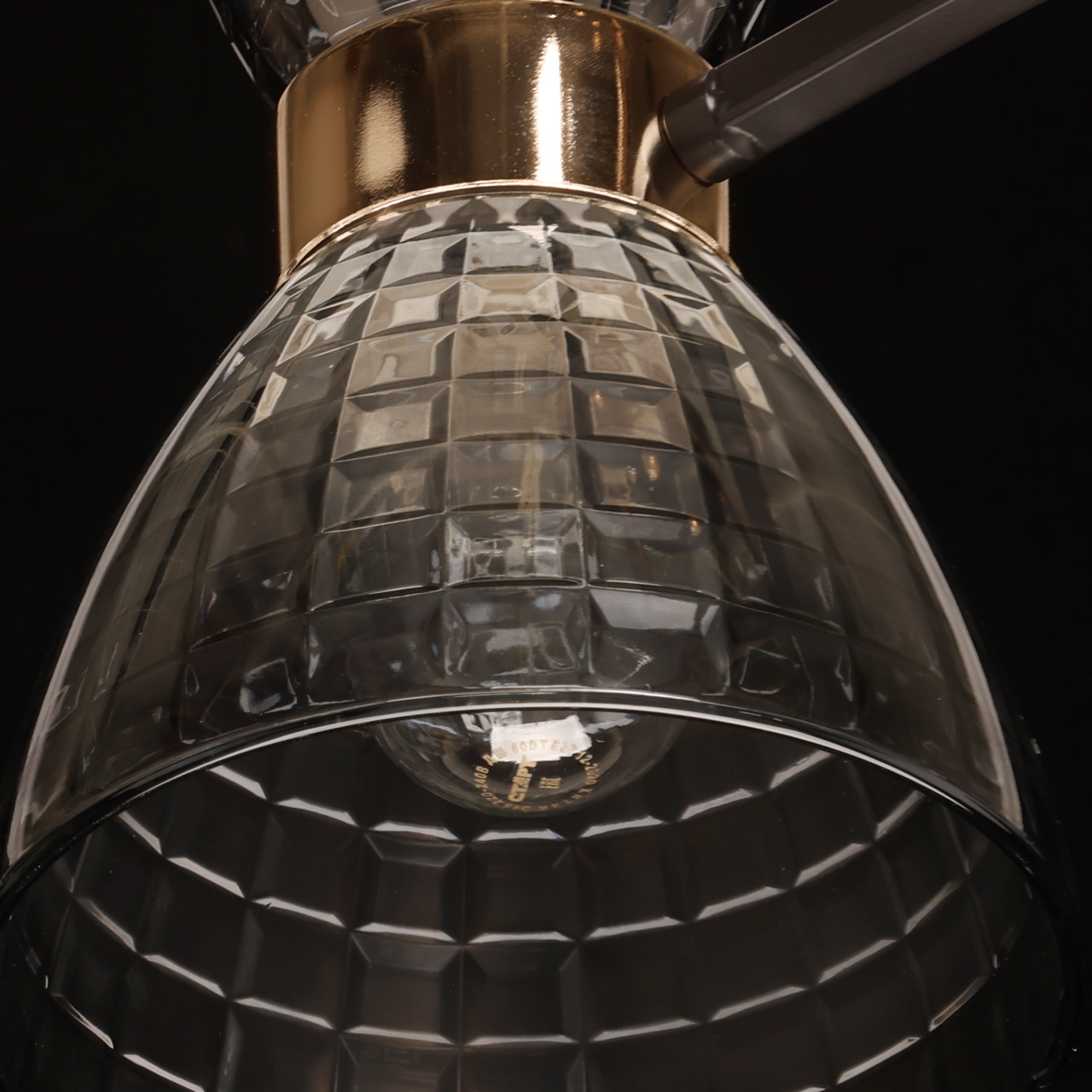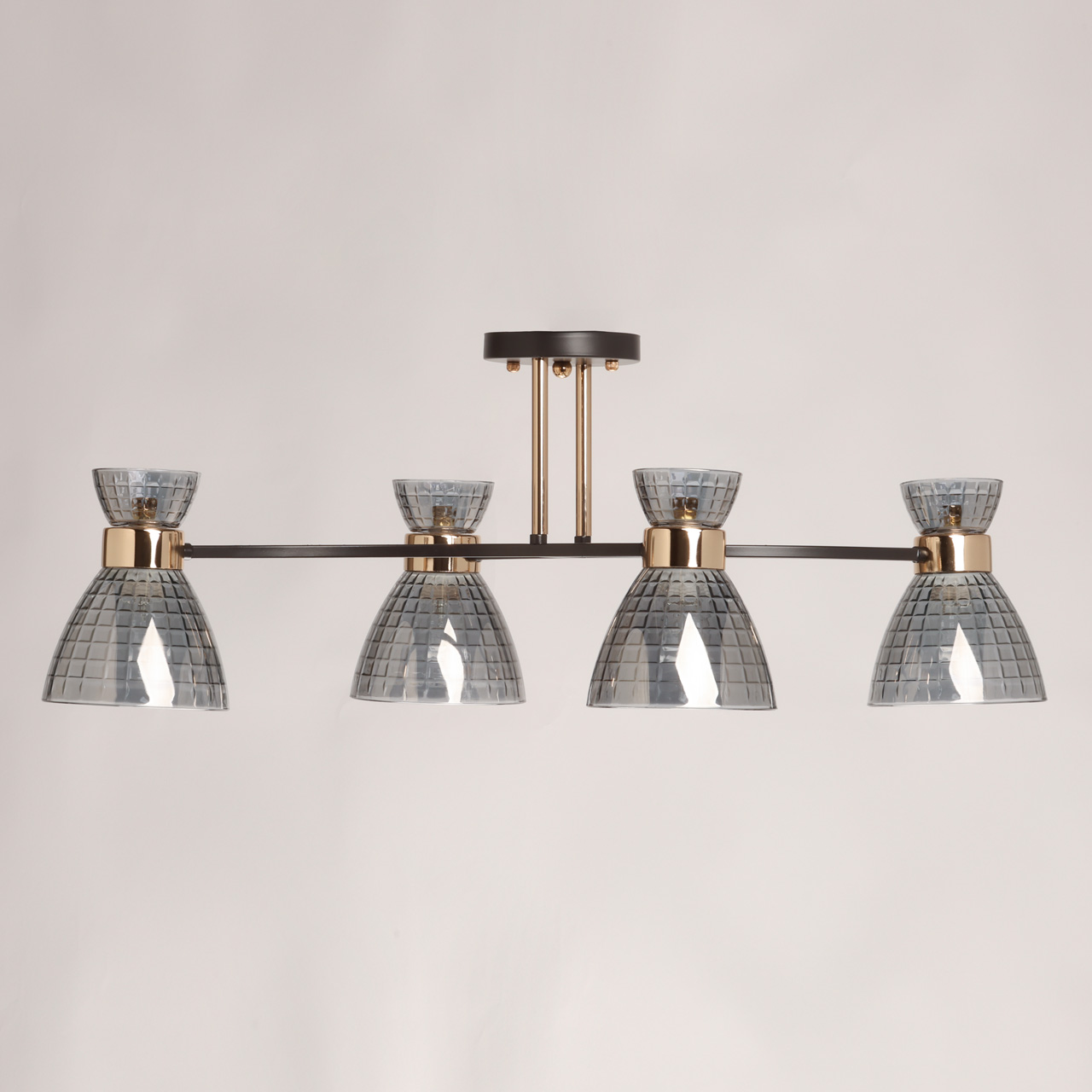 Металлическое основание потолочной люстры окрашено в цвет кофе. Отдельные элементы основания гальванизированы в цвет золота. Стеклянные плафоны с геометричным орнаментом отлиты в сложную форму и гальванизированы в дымчатый цвет.