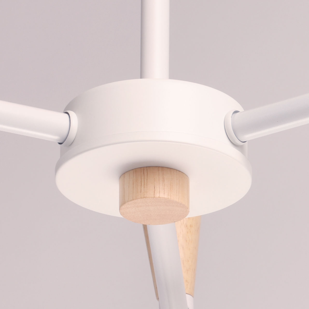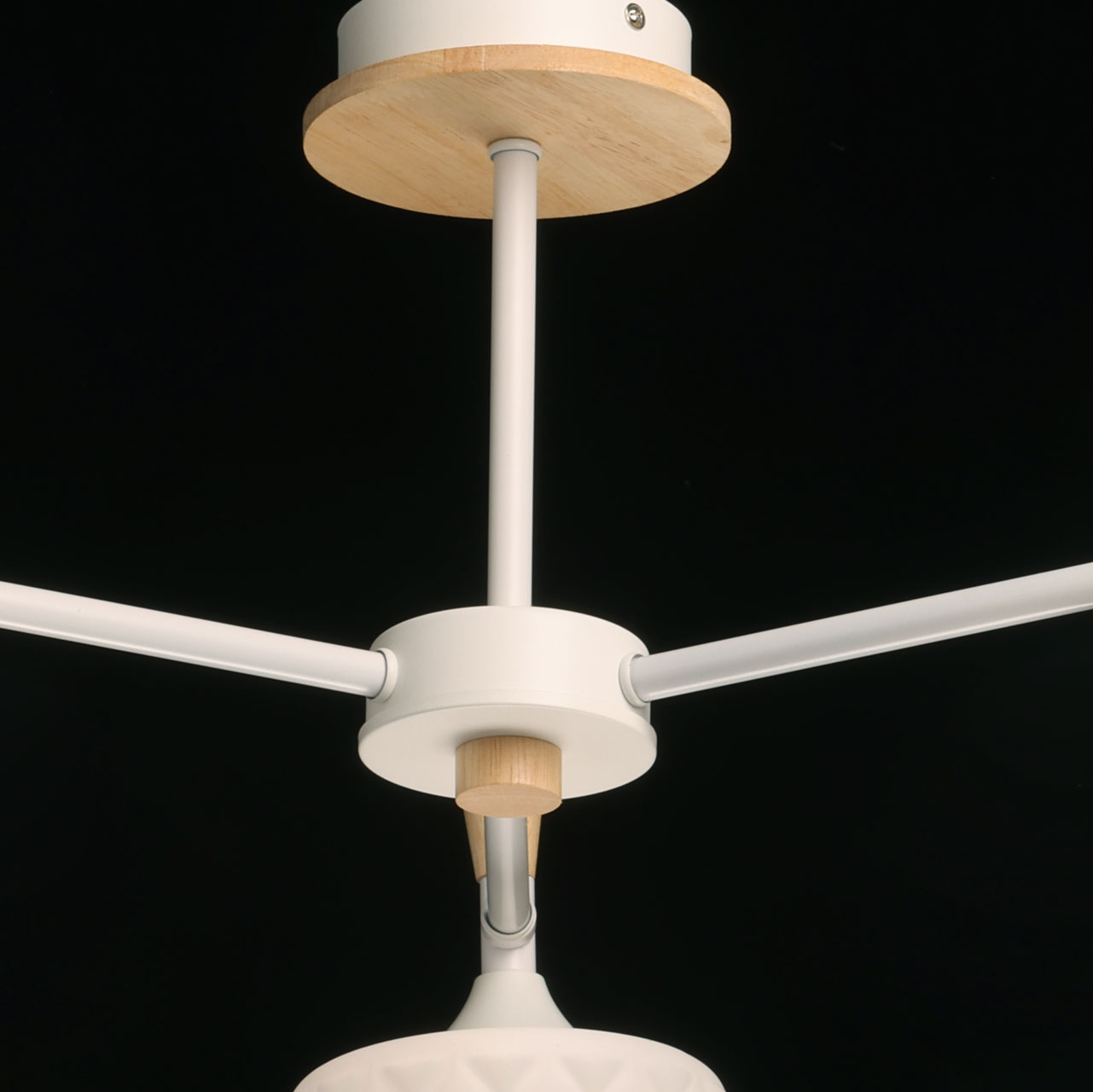 Металлическое основание потолочной люстры окрашено в белый цвет. Фактурные стеклянные плафоны окрашены в белый цвет. Потолочная люстра декорирована элементами из светлого натурального дерева.